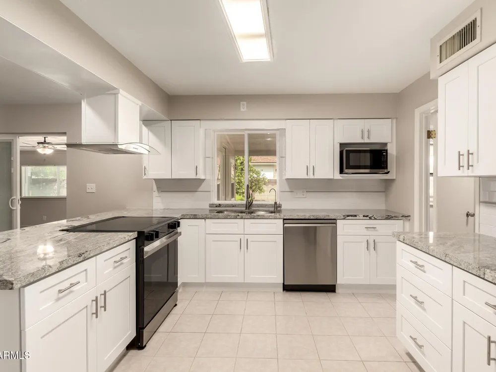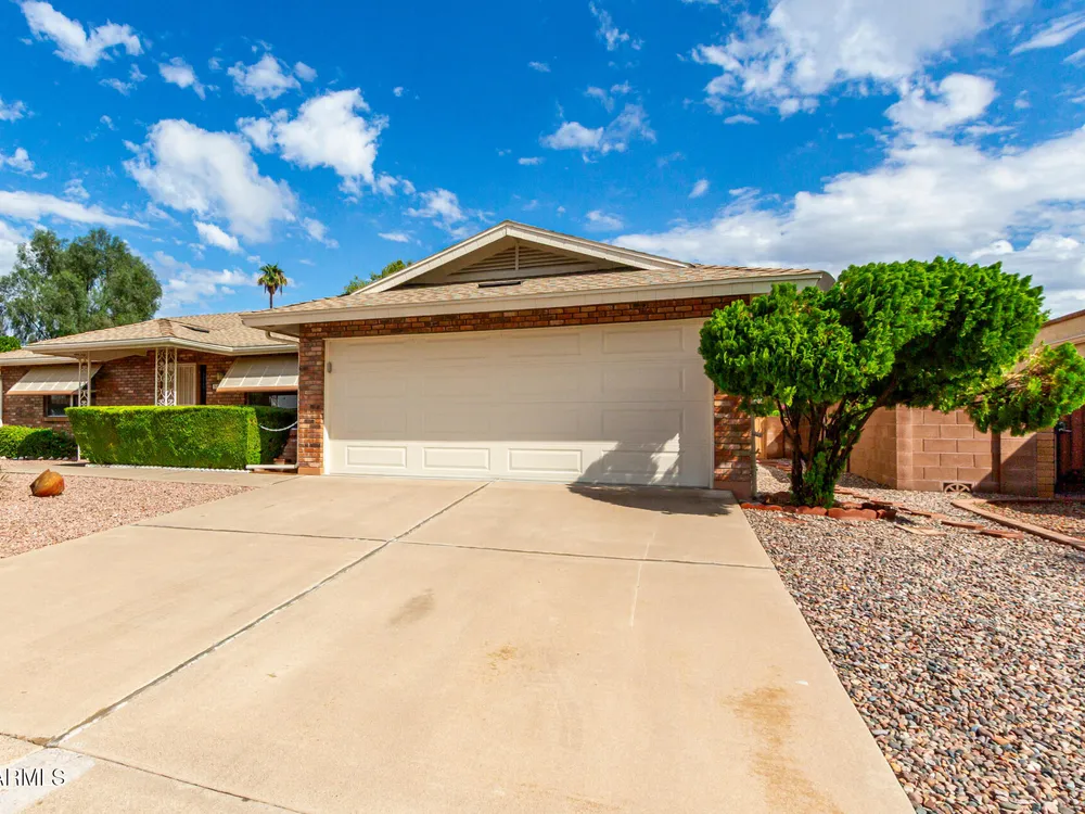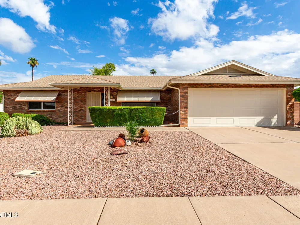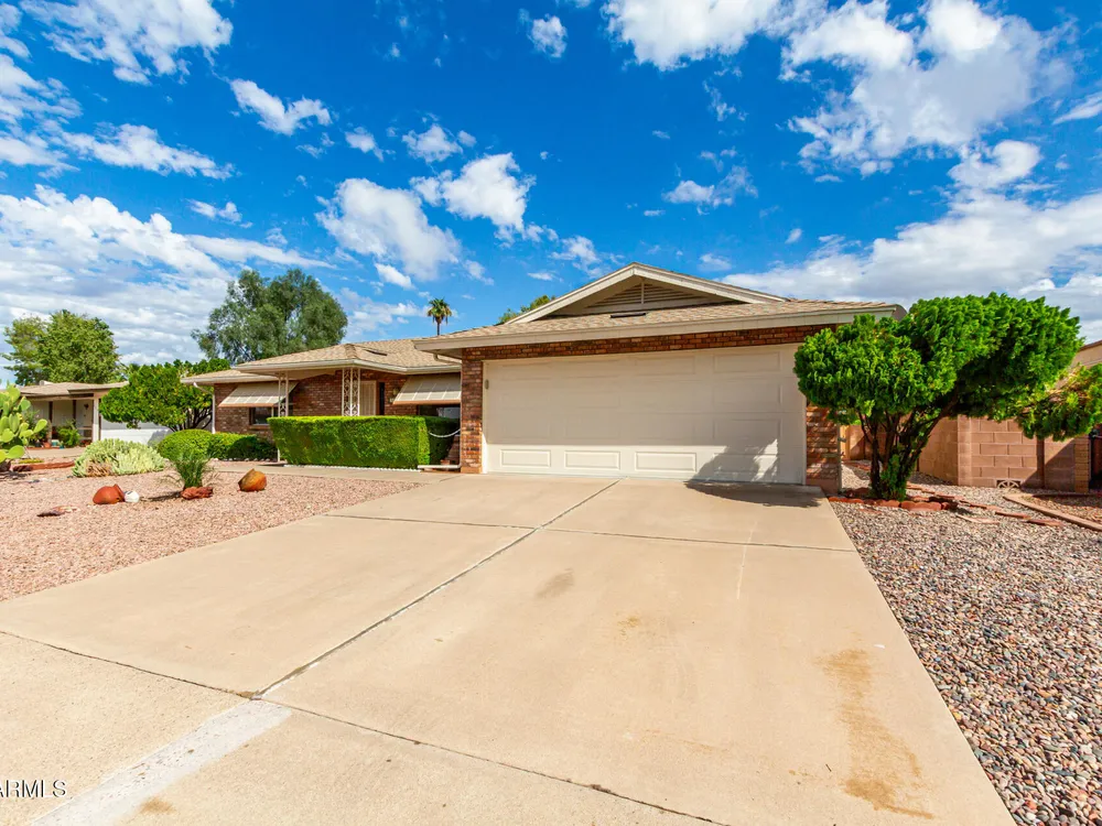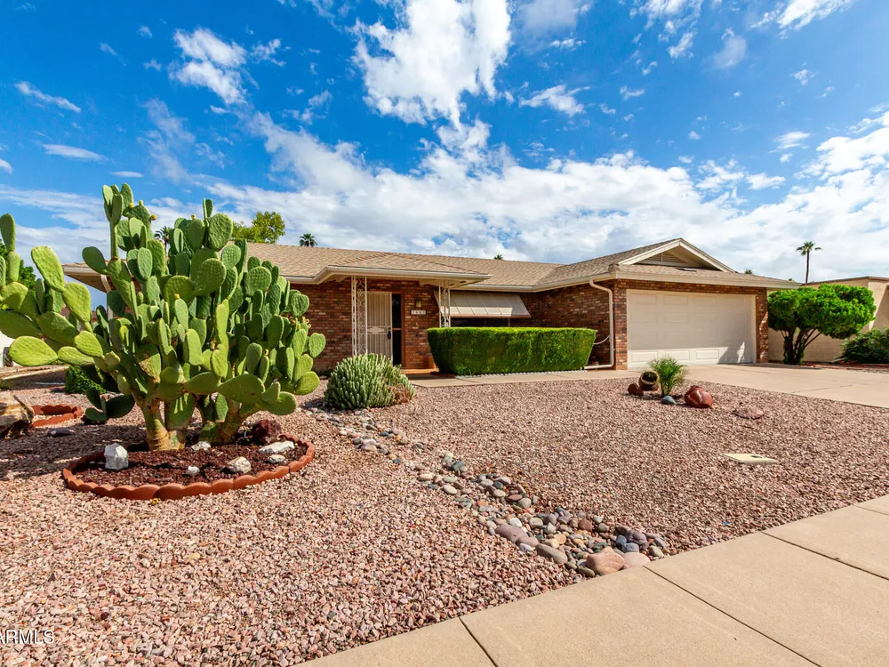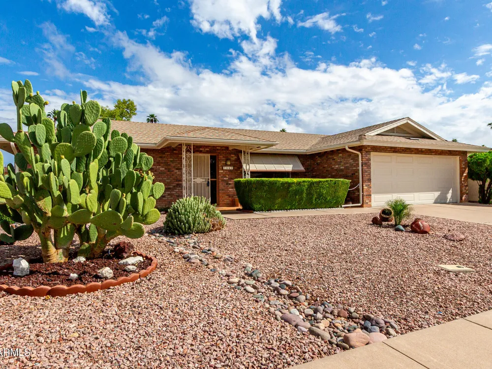 Newly updated 2-bedroom, 2-bath home on a peaceful cul-de-sac! Charming brick facade, low-maintenance desert landscape & a 2-car garage w/ attached workshop. Renovated interior featuring a family room w/ wood blinds & newer wood-look flooring. The kitchen is open to large eating area, w/ new granite slab counters, crisp white shaker cabinets, stainless steel appliances, pantry, & a peninsula w/ breakfast bar. AZ Room/Office/Den slab was leveled, new insulated ceiling/walls, dual pane windows & exit door, leading to covered patio & block fencing for privacy. New Water Softener, Tankless Reverse Osmosis Water! NO popcorn ceilings! Fresh exterior paint** New brushed nickel lever door handles T/O. Old attic insulation removed/disposed & replaced w/ new 20'' blown in insulation*