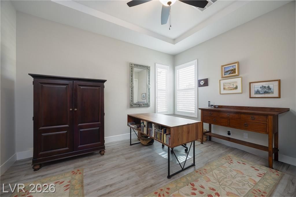 Discover unparalleled comfort in this stunning 2,400+ sq ft home within the exclusive, guard-gated REGENCY by Toll Brothers in vibrant Summerlin. Tailored for the 55+ homeowner, this residence offers laid back and easy living. The thoughtfully separated primary suite ensures ultimate privacy for a serene retreat. A gourmet kitchen, featuring high-end appliances, a charming cafe area, and extended custom cabinetry is a chef's delight. Exquisite tile, sophisticated tray ceilings, and impressive 10-foot ceilings showcase the home's quality. An included laundry room with cabinets and a wash sink, plus owned solar electric panels, means significantly lower utility bills.Embrace the active, luxurious lifestyle you deserve near Downtown Summerlin, Durango Casino, medical care, and the 215 beltway.