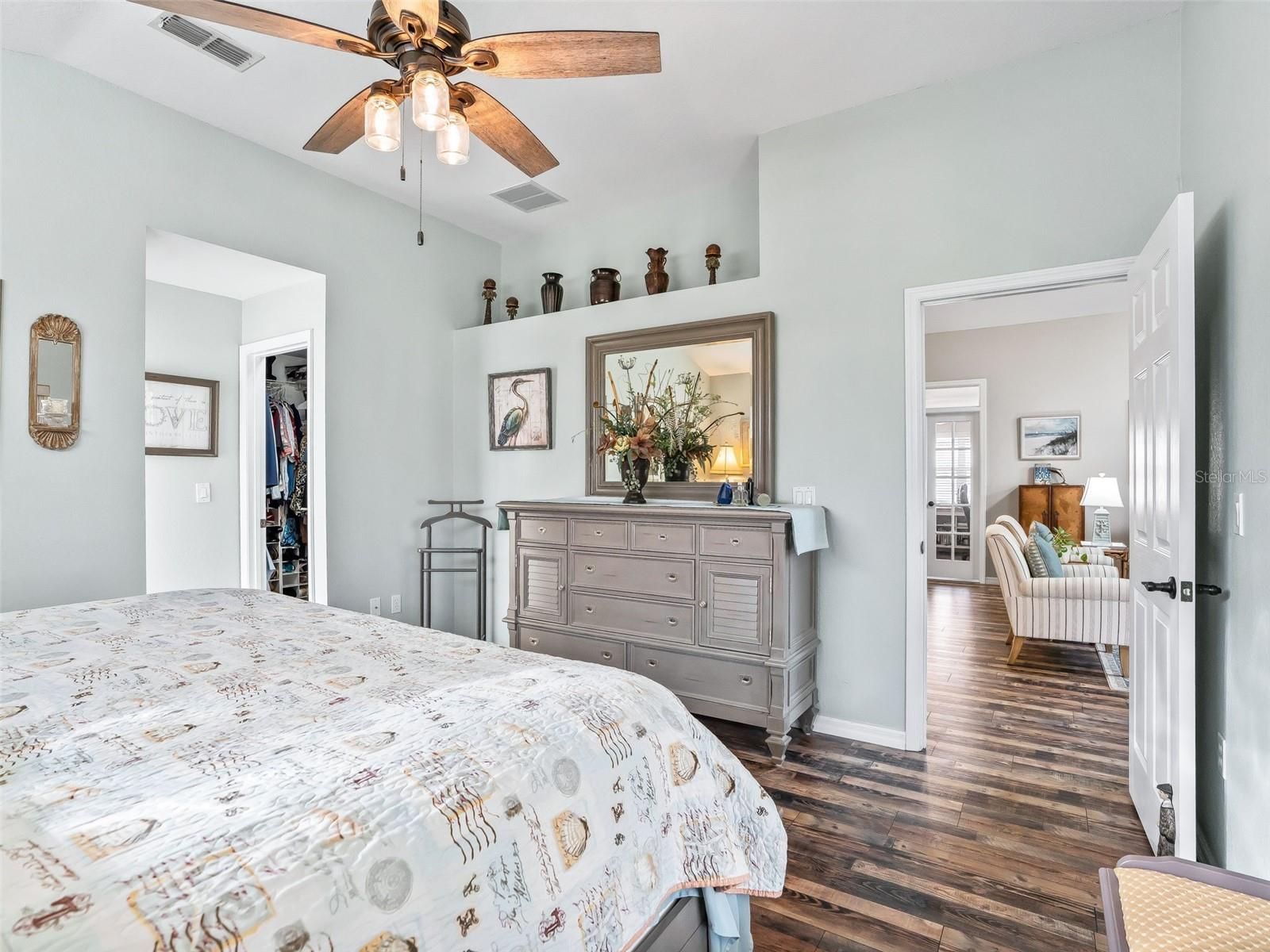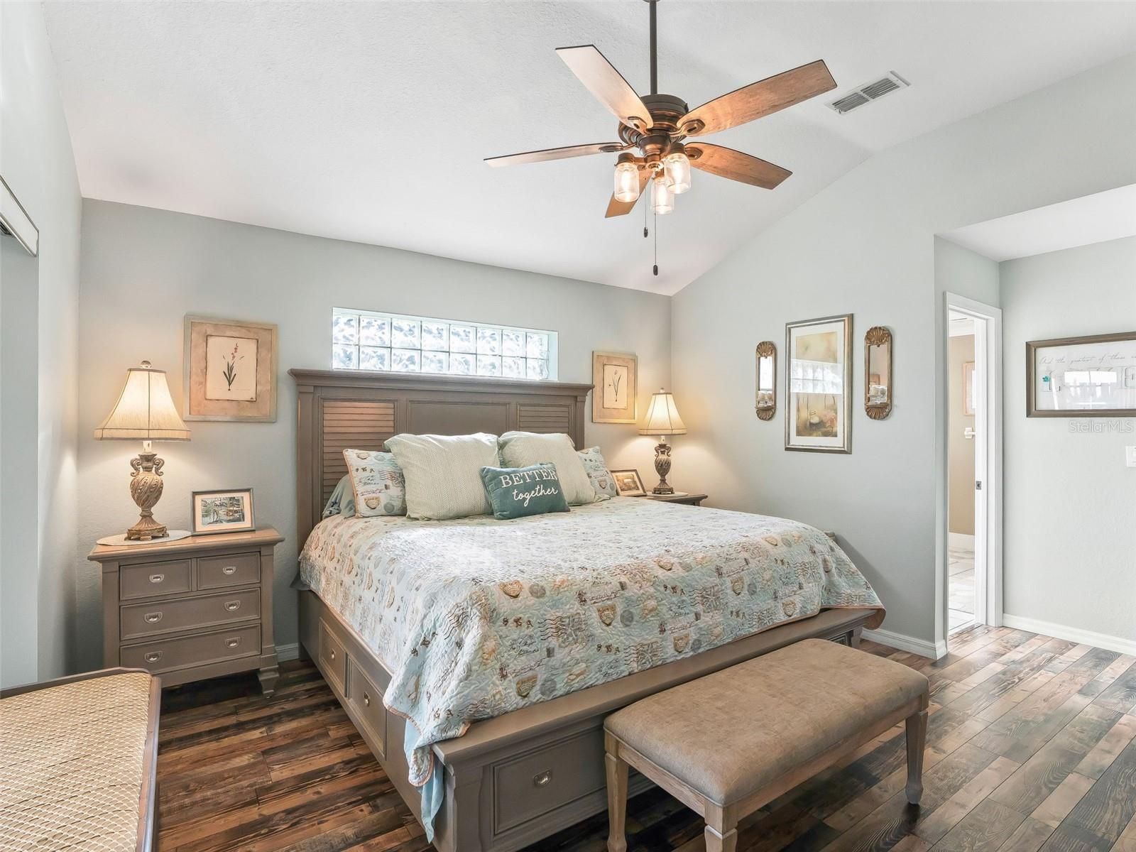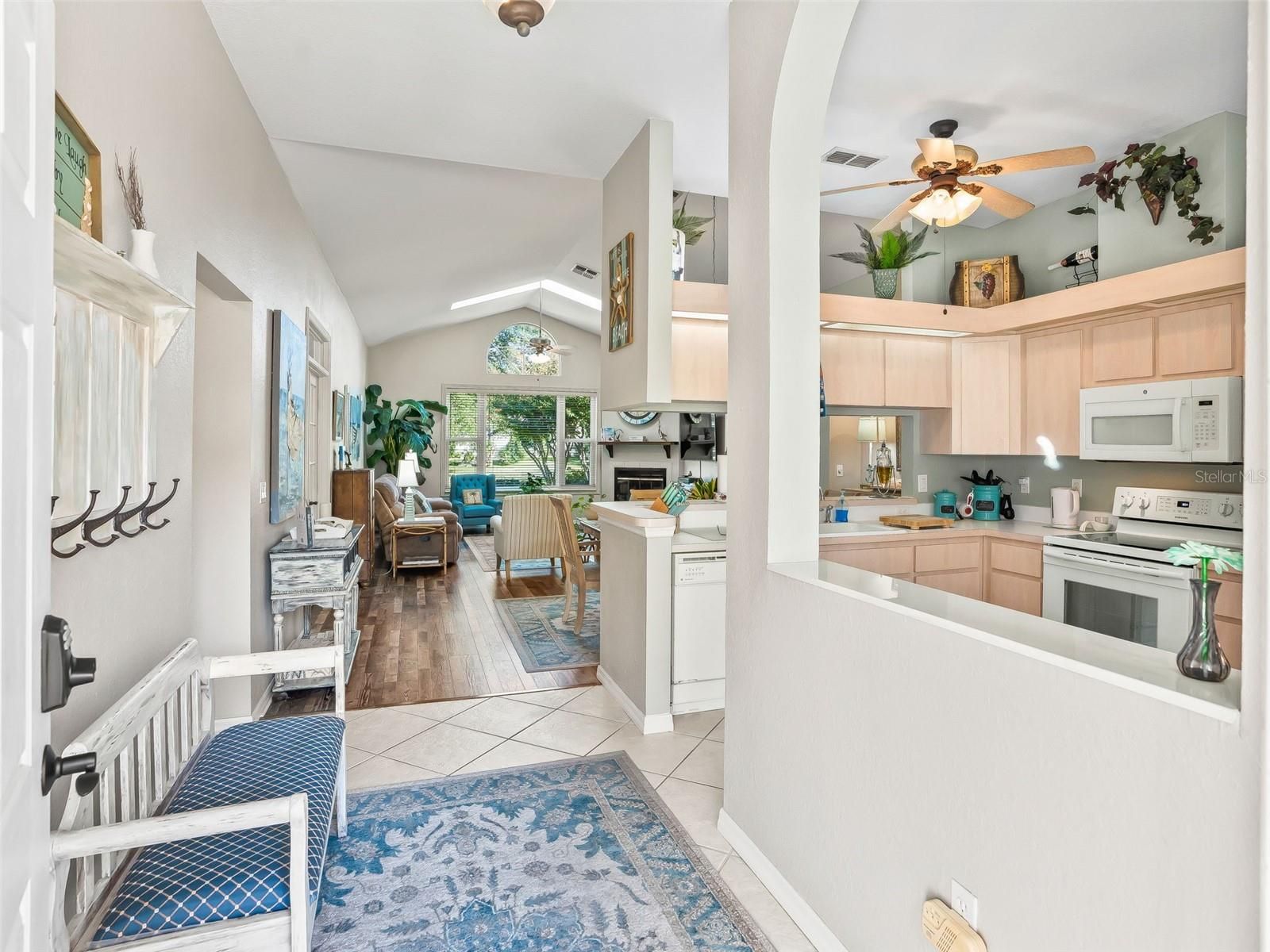 - Built-in Features, Cathedral Ceiling(s), Ceiling Fan(s), Eat-in Kitchen, High Ceilings, Open Floorplan, Main Level Primary, Thermostat, Vaulted Ceiling(s), Walk-In Closet(s), Window Treatments