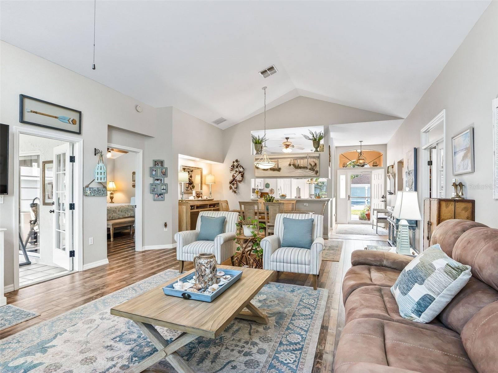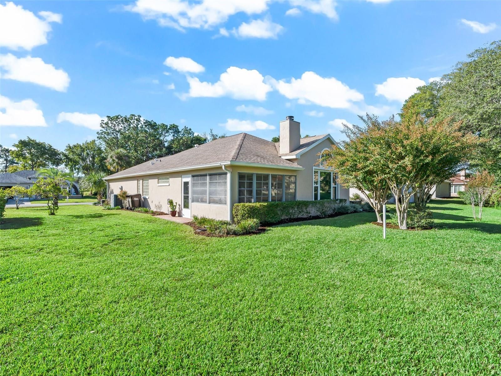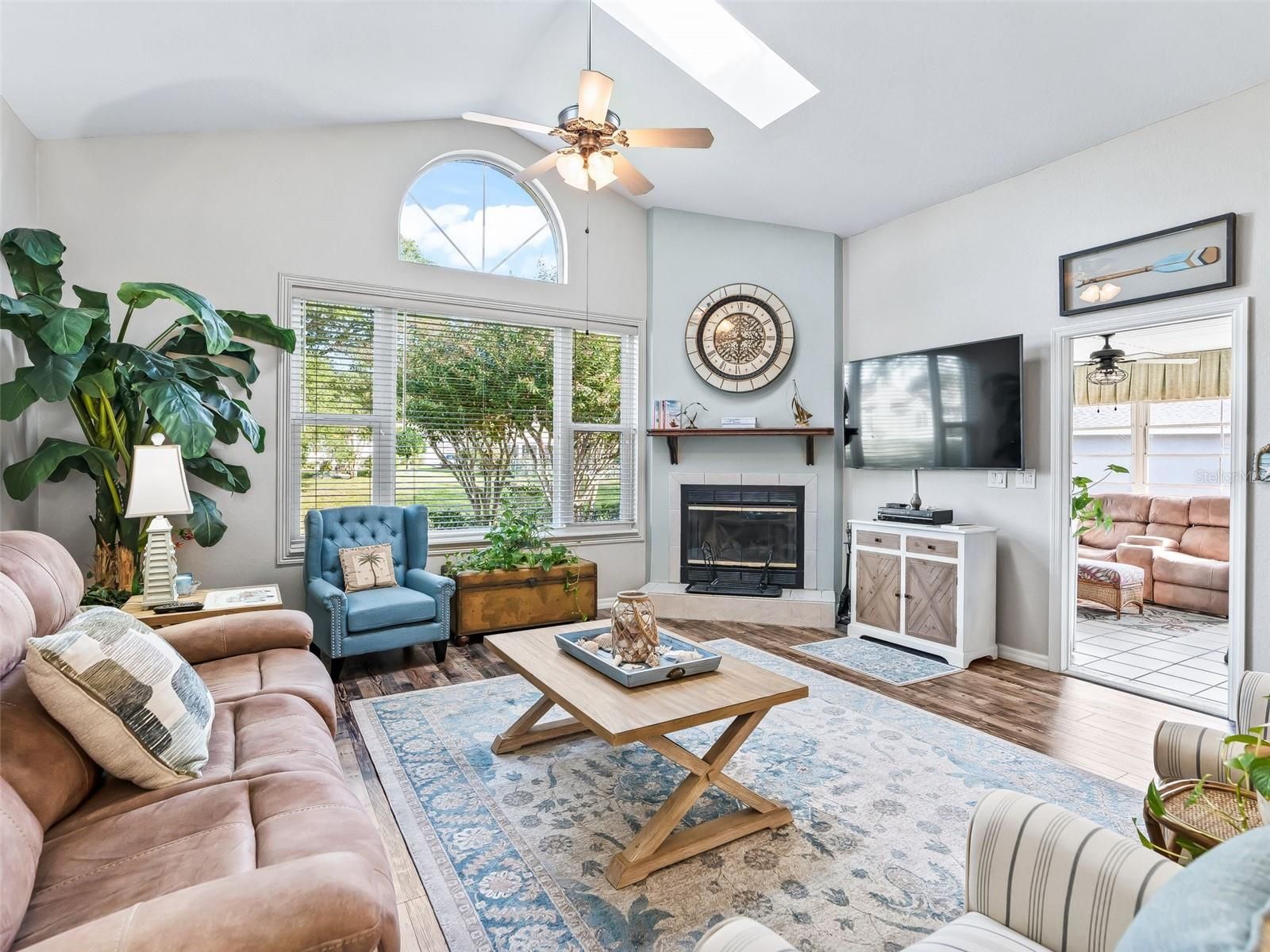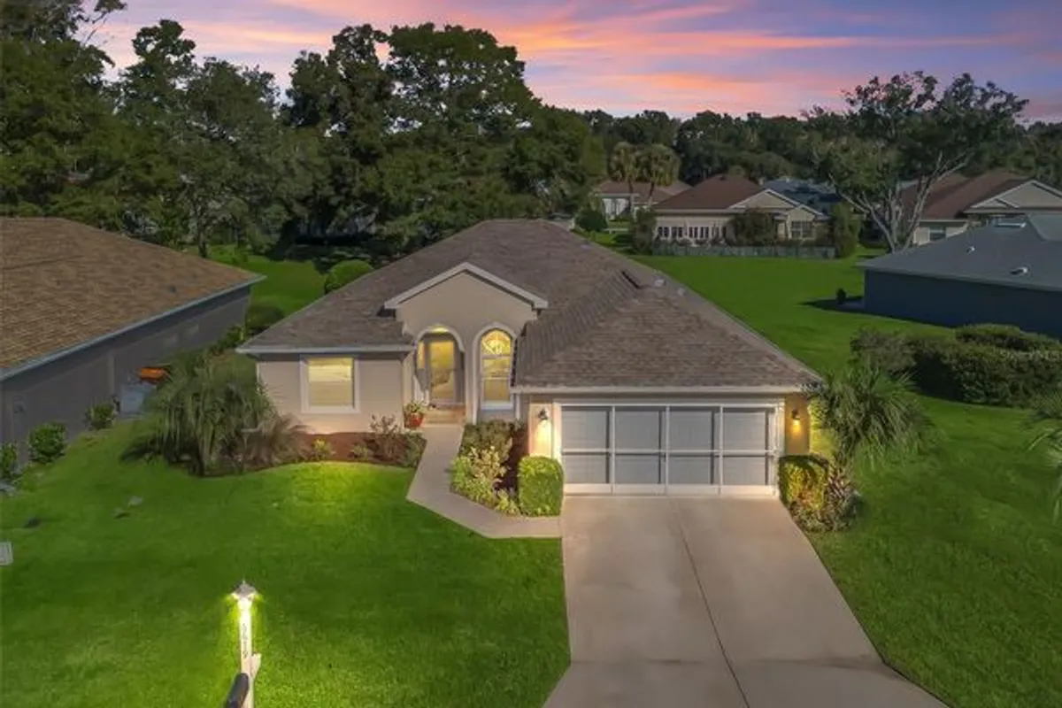 This beautifully maintained concrete block and stucco 'Doral' model is truly move-in ready! Nestled on an oversized homesite in the highly desirable 55+ gated community of Oak Run Golf & Country Club, within the Fairway Oaks subdivision, this home offers comfort, quality, and charm. The stunning furnishings, décor and golf cart are available separately, providing a wonderful turnkey opportunity. Surrounded by lush palms, flowering bushes, crepe myrtles, azaleas, and a lovely jasmine arbor, the home sits on a semi-private lot with a peaceful retention pond view. The curb appeal shines with fresh mulch, manicured planters, and a welcoming covered front porch that creates an inviting first impression. Inside, you’ll find a bright great room floor plan with soaring vaulted ceilings, arched windows, and beautiful plank flooring throughout—no carpeting anywhere. The spacious kitchen offers abundant cabinetry, white appliances, a disposal, microwave vent, soffit lighting, and a cheerful breakfast nook open to the dining and living areas. The dining room includes a built-in buffet niche, while the large living room features a wood-burning fireplace that enhances the warm and inviting atmosphere. French doors open to the den/office, complete with a full wall of custom wood built-ins that can easily be converted into a closet, creating a true third bedroom if desired. A tiled foyer and kitchen, laid on the diagonal, lead to the laundry room with cabinetry, washer, and dryer. The 200-square-foot enclosed lanai, with ducted heat and air, extends the living space and provides a comfortable area to relax year-round. A paver patio off the den offers additional outdoor space perfect for grilling or enjoying the peaceful surroundings. The spacious primary suite includes dual sinks, a walk-in shower with glass block for natural light, and a linen closet. The guest bedroom at the front of the home provides privacy and comfort with its own nearby full bath. Additional highlights include a two-car garage with window, screen door, and pull-down attic stairs, as well as numerous updates: a 2022 roof, new refrigerator, water heater, soft water system, and fresh exterior paint. Built in 1997, this home has been meticulously cared for and shows pride of ownership throughout. Conveniently located within walking distance to the Oak Room Bar & Grill, pool, fitness room, and restaurant, residents also enjoy access to Oak Run’s abundant amenities including multiple pools, golf, tennis, fitness facilities, and numerous clubs and social activities. This move-in-ready home is available turnkey furnished with golf cart for a fair cost. Experience the best of active adult living in this beautiful Fairway Oaks. Let's schedule your showing today! Virtual tour: https://opulent-rem.aryeo.com/videos/019a1b6c-7159-7172-92e0-cf3a929cae05