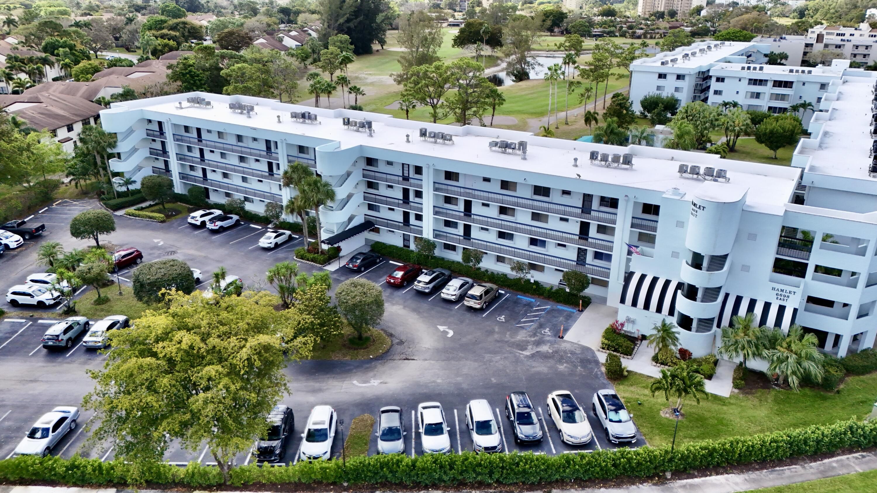 Rare 4th-top floor, corner condo with beautiful golf course views.This spacious 3-bedroom, 2-bath unit offers over 1,505 sq ft of bright, airy living space with abundant natural light and a screened patio perfect for relaxing or entertaining.The whole units has wood floors,and light color walls.the kitchen with granite counters,and SS appliances.Large primary suite featuring a walk-in closet and modern bath.Two more bedrooms one with a custom made wall unit and a Murphy bed. Very active 55+community,Pay as you play Golf course,Residents enjoy resort-style amenities, including a clubhouse, Bistro,2 pools, fitness center, and social activities. New roof 2024,accordion shutters.Maintenance fee includes water, cable, building insurance, exterior maintenance,elevator,pest control,reserves. Second bedroom could be used as a comfortable guest or office space. Screened patio perfect spot for morning coffee or evening breezes overlooking the greens of the golf course. Ideally located near shopping, restaurants, medical facilities,very close to Floridas great beaches and major roadways, this condo combines comfort, convenience, and an active lifestyle in South Florida. All appliances recently replaced .