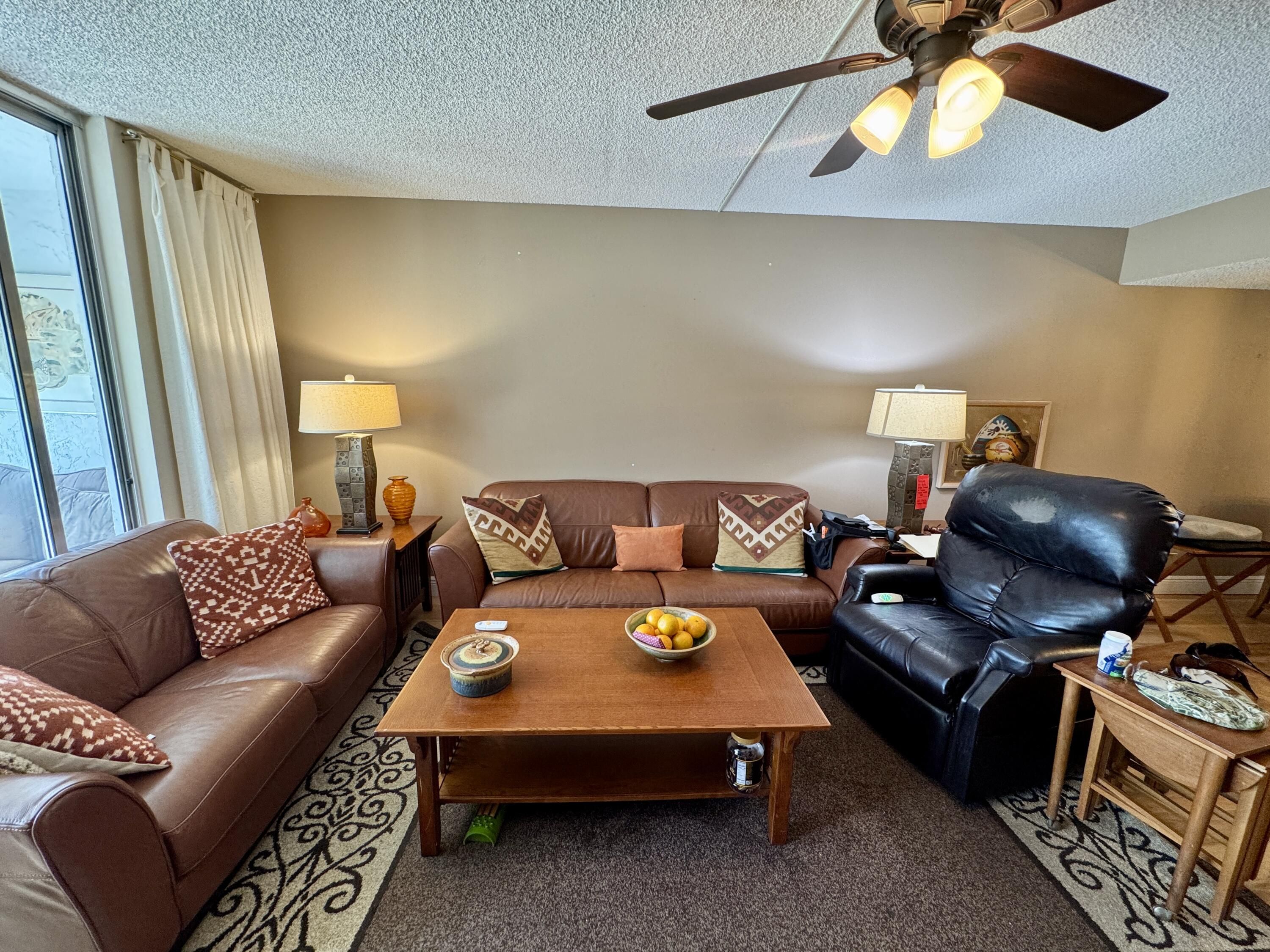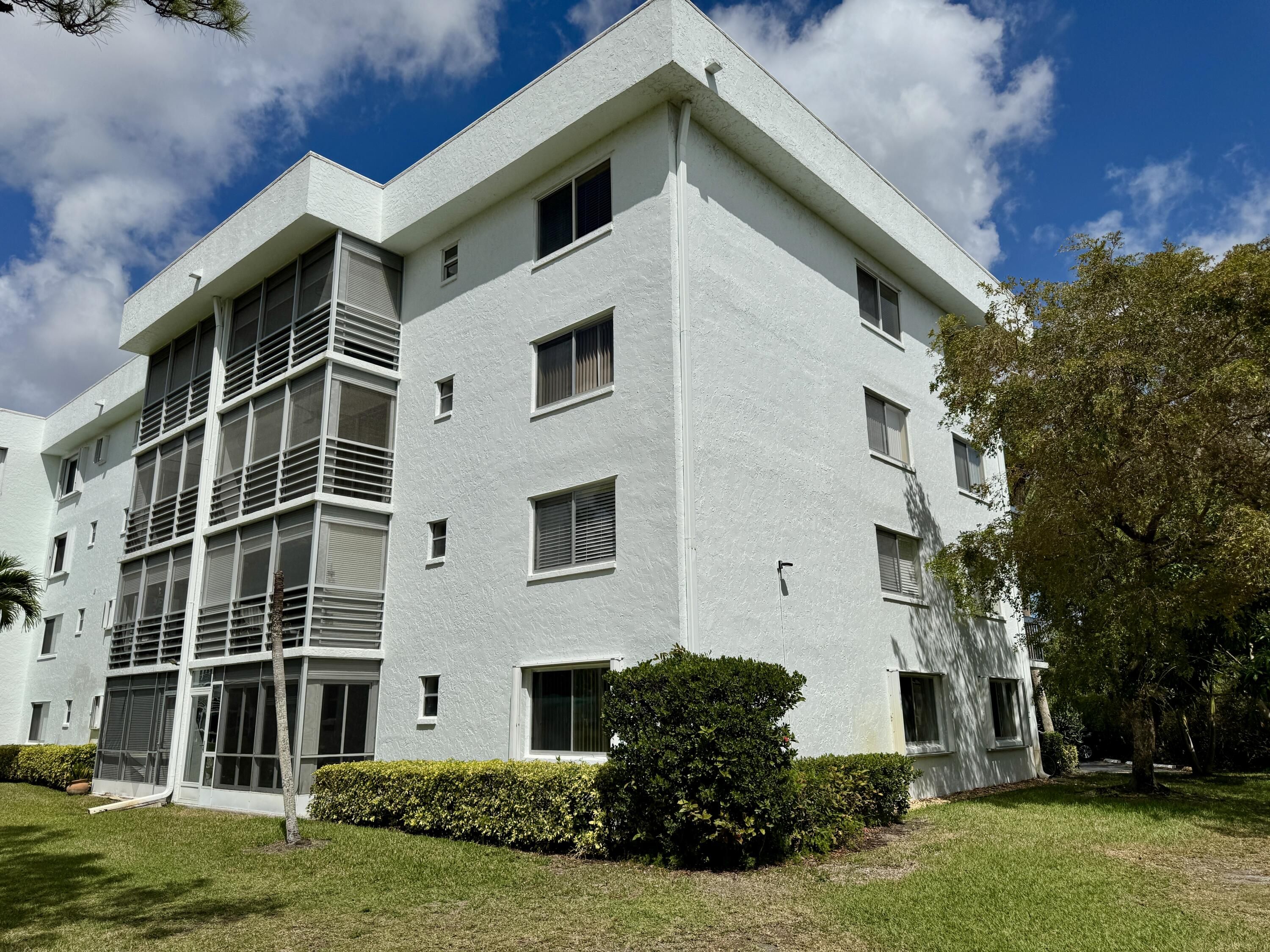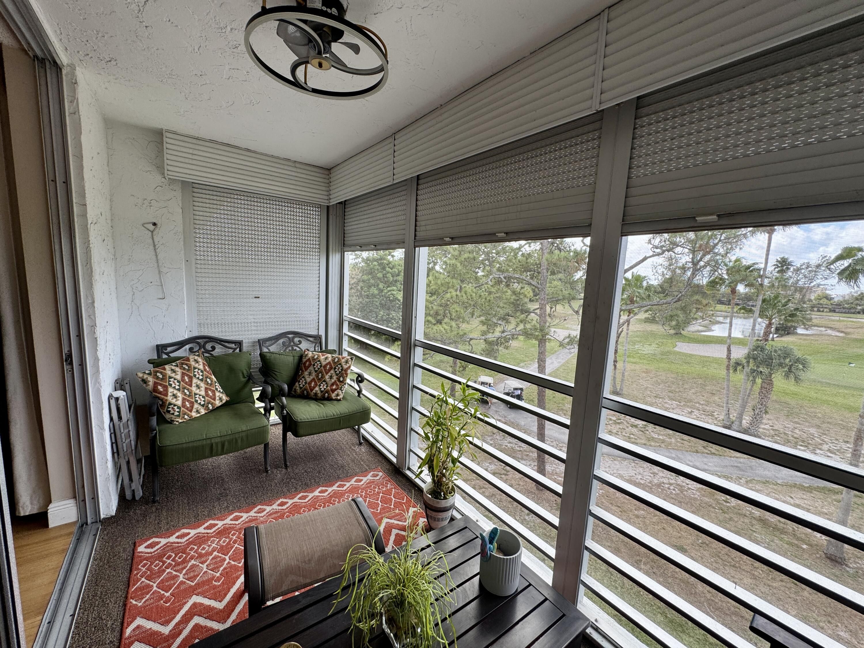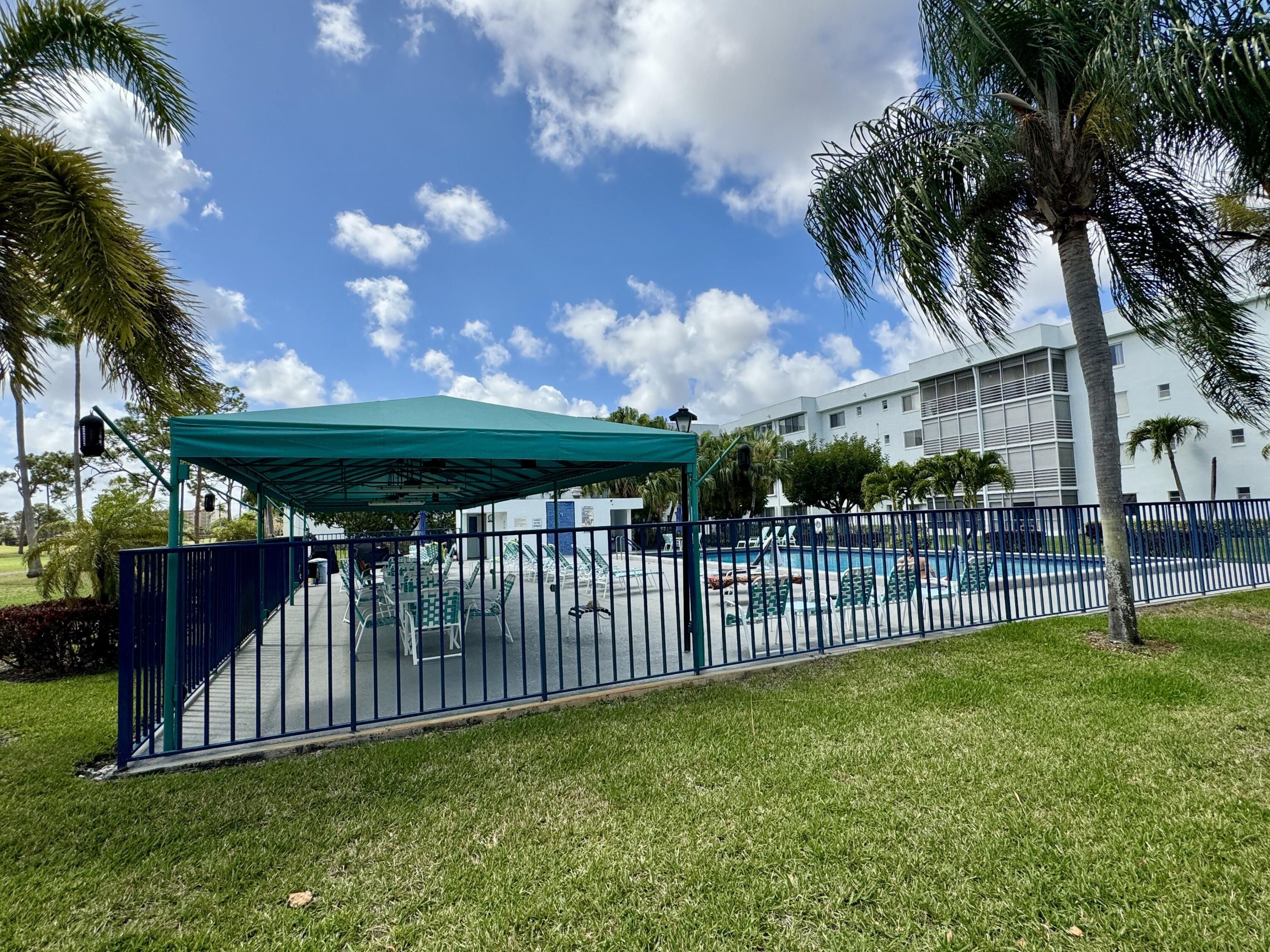Rare 4th-top floor, corner condo with beautiful golf course views.This spacious 3-bedroom, 2-bath unit offers over 1,505 sq ft of bright, airy living space with abundant natural light and a screened patio perfect for relaxing or entertaining.The whole units has wood floors,and light color walls.the kitchen with granite counters,and SS appliances.Large primary suite featuring a walk-in closet and modern bath.Two more bedrooms one with a custom made wall unit and a Murphy bed. Very active 55+community,Pay as you play Golf course,Residents enjoy resort-style amenities, including a clubhouse, Bistro,2 pools, fitness center, and social activities. New roof 2024,accordion shutters.Maintenance fee includes water, cable, building insurance, exterior maintenance,elevator,pest control,reserves. Second bedroom could be used as a comfortable guest or office space. Screened patio perfect spot for morning coffee or evening breezes overlooking the greens of the golf course. Ideally located near shopping, restaurants, medical facilities,very close to Floridas great beaches and major roadways, this condo combines comfort, convenience, and an active lifestyle in South Florida. All appliances recently replaced .