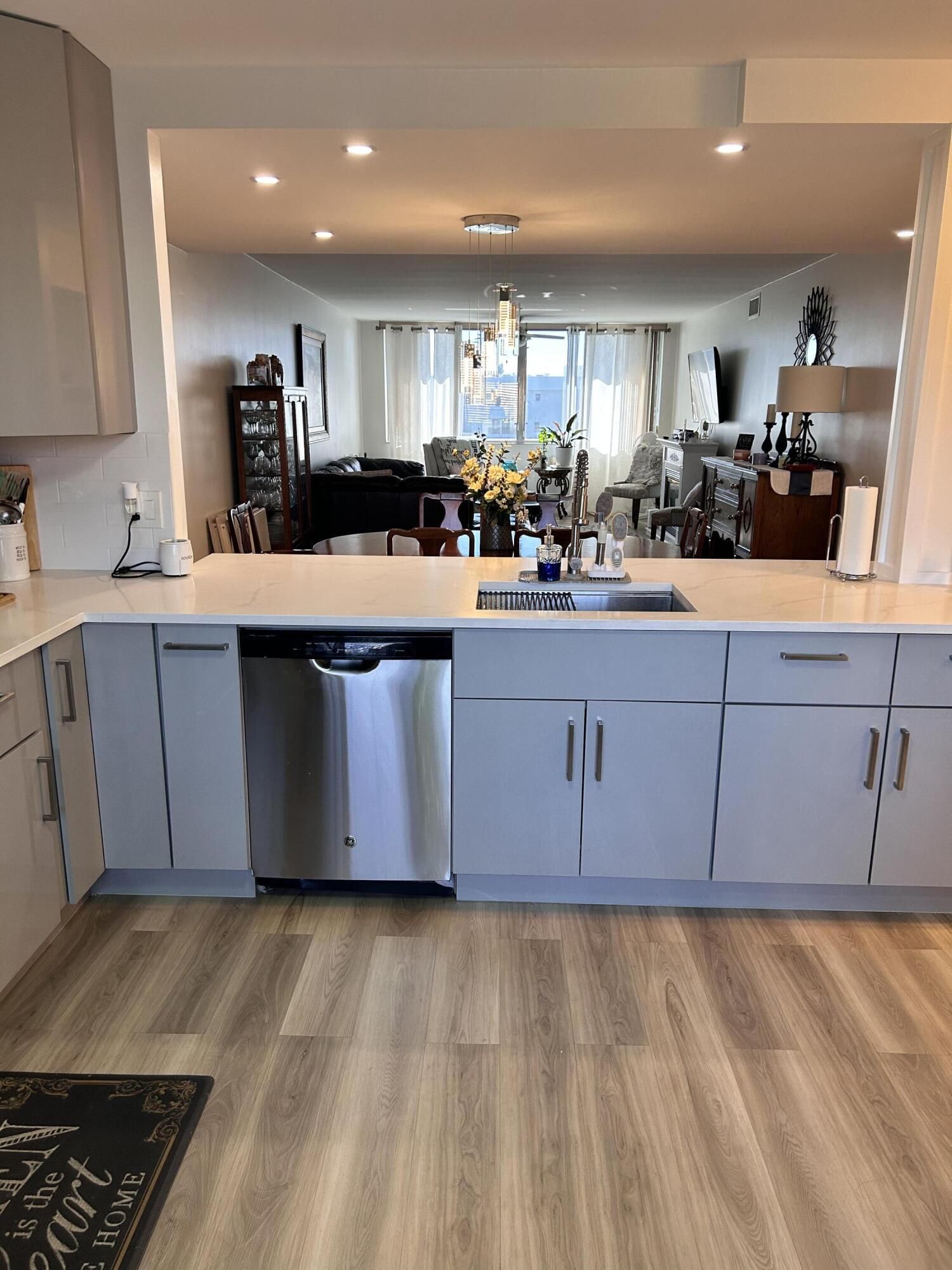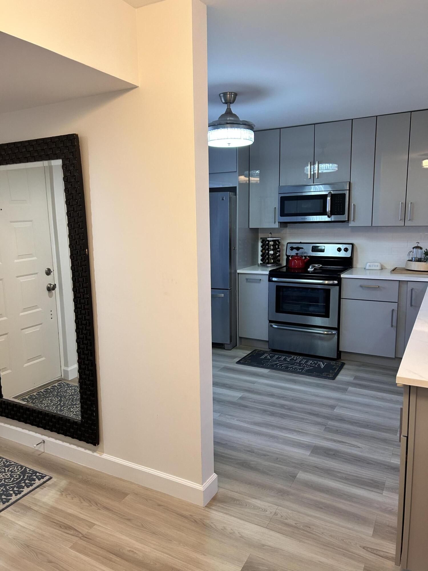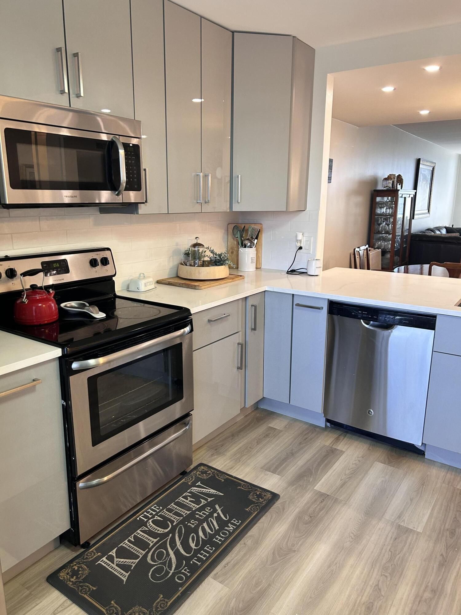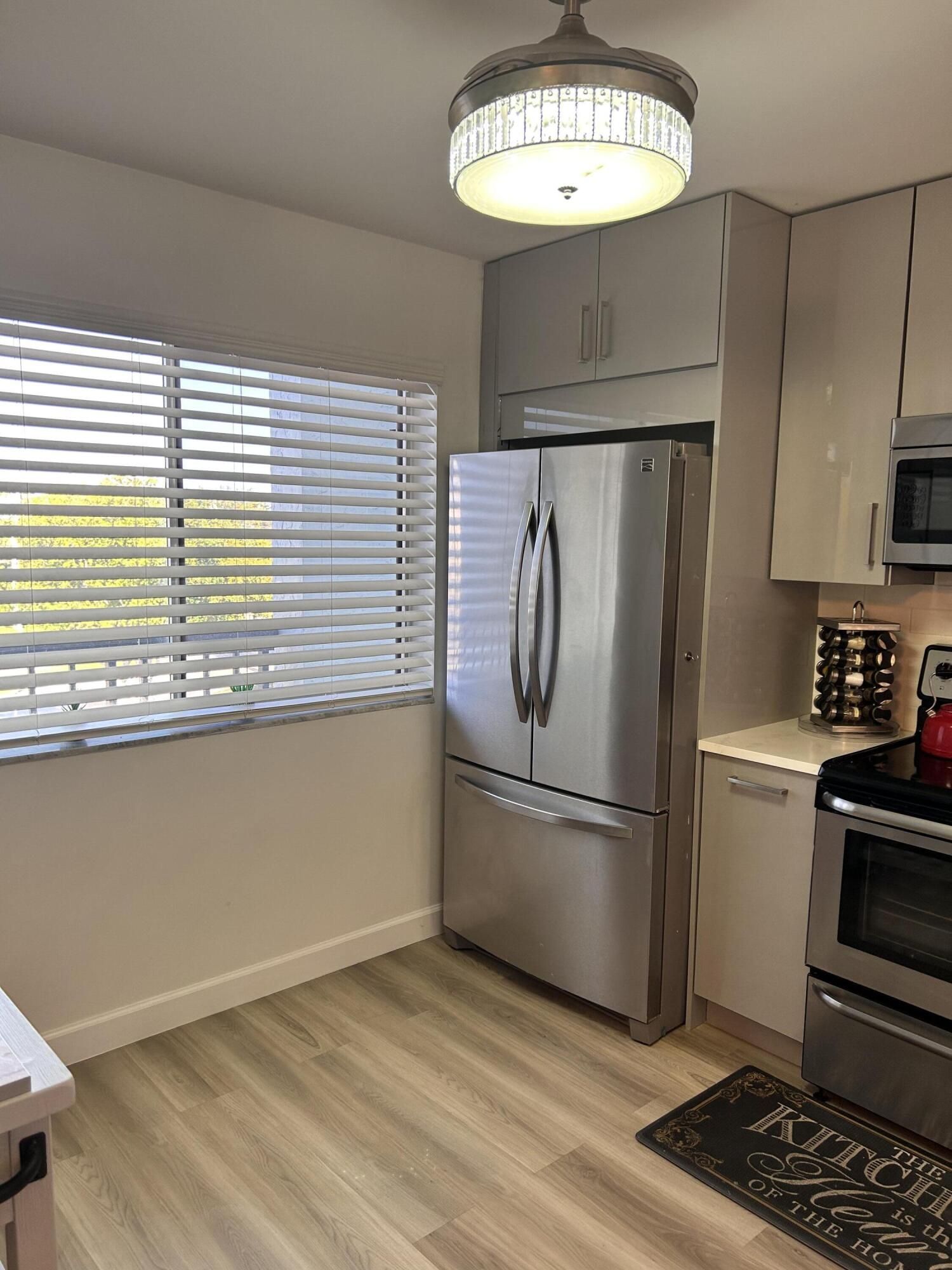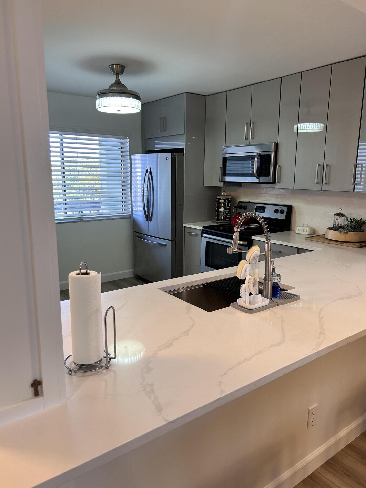 Beautiful spacious 1564sf, 3/2 condo located near turnpike and easy access to 195. Many stores located <1 mile away. This beautiful Hamlet condo on the 4th floor has been recently renovated to an open concept kitchen with great lighting and modern Luxury Luxe cabinets. New roof, new HVAC, new lvt flooring in kitchen, living room and dining room, water heater installed in 2019. Hurricane shutters on back windows. HOA amenities include water, cable, WiFi, landscaping, 1 beautiful heated pool located at the Hamlet, Clubhouse that offers weekly activities for residents, 2nd heated pool with accessible restaurant that also offers nightly entertainment, gym, maintenance, pest control, etc. Seller motivated to sell, needs to go babysit new granddaughter in GA. Seller has put a lot of love in