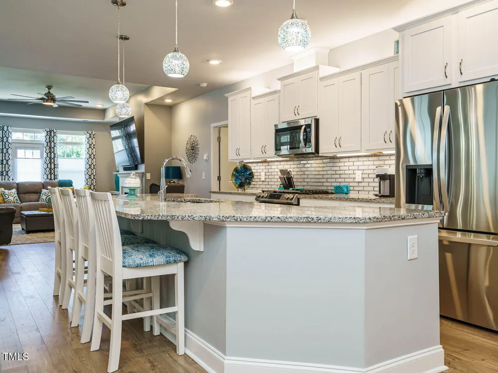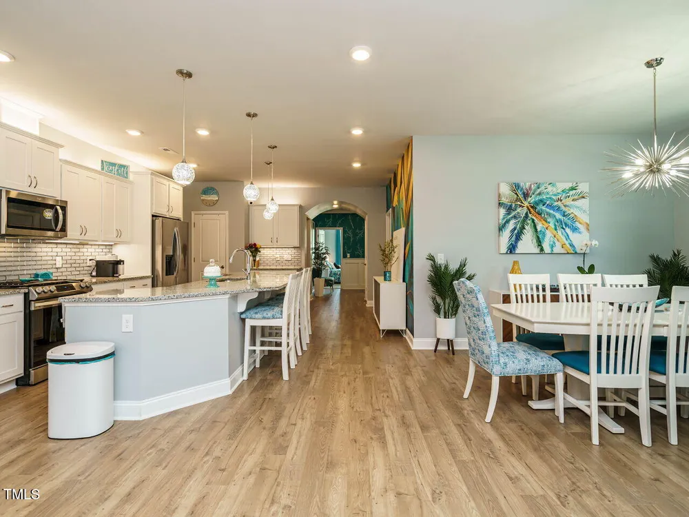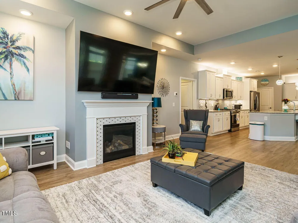 BACKYARDS ARE OVERATED! Patio living is where it's at when you have a huge covered Back Porch for entertaining & large Patio for lounging! Unbelievable WOW FACTOR in this 4 BDR/3 BA with 2973sf that lives like a Ranch with 3 Bedrooms on the Main & a 4th Bedroom | Bath | Bonus upstairs! Step into the dramatic foyer with custom trim & designer vinyl wallcovering & be swept away. The ENORMOUS Dream Kitchen is a total centerpiece with a massive wrap-around island, gas range, statement backsplash & sparkling pendants. The open Dining Area spills into the HUGE Family Room with trey ceiling & a fireplace that's straight out of a magazine. Your Main Floor Owner's Retreat is pure bliss — LVP flooring, trey ceiling, dual barn-door closets, & spa-like Bath with Roman shower connected to the oversized Laundry Room. Upstairs delivers more wow with tons of space for guests, hobbies, or your own escape. Never mow again because the HOA takes care of yard maintenance. Style, space & sizzle — Woohoo! (FYI, Wall Coverings are NOT Wallpaper, but vinyl coverings that are EASILY removable!)