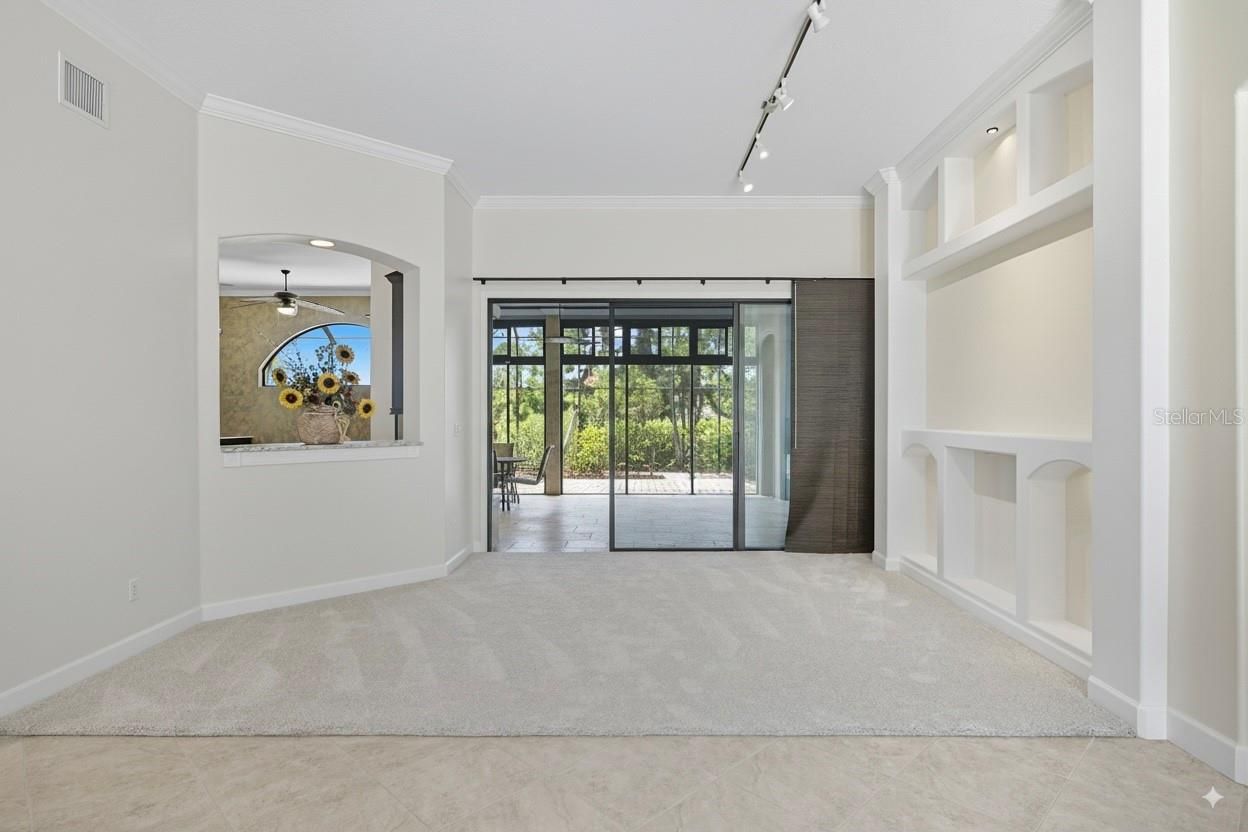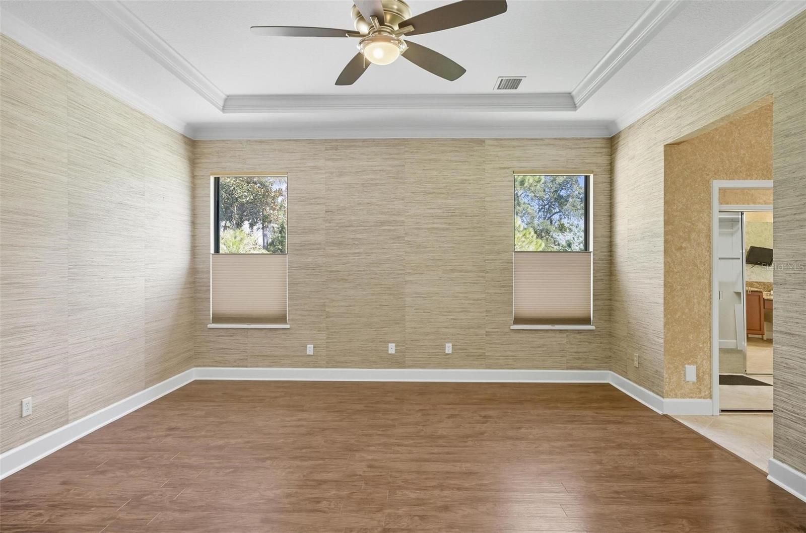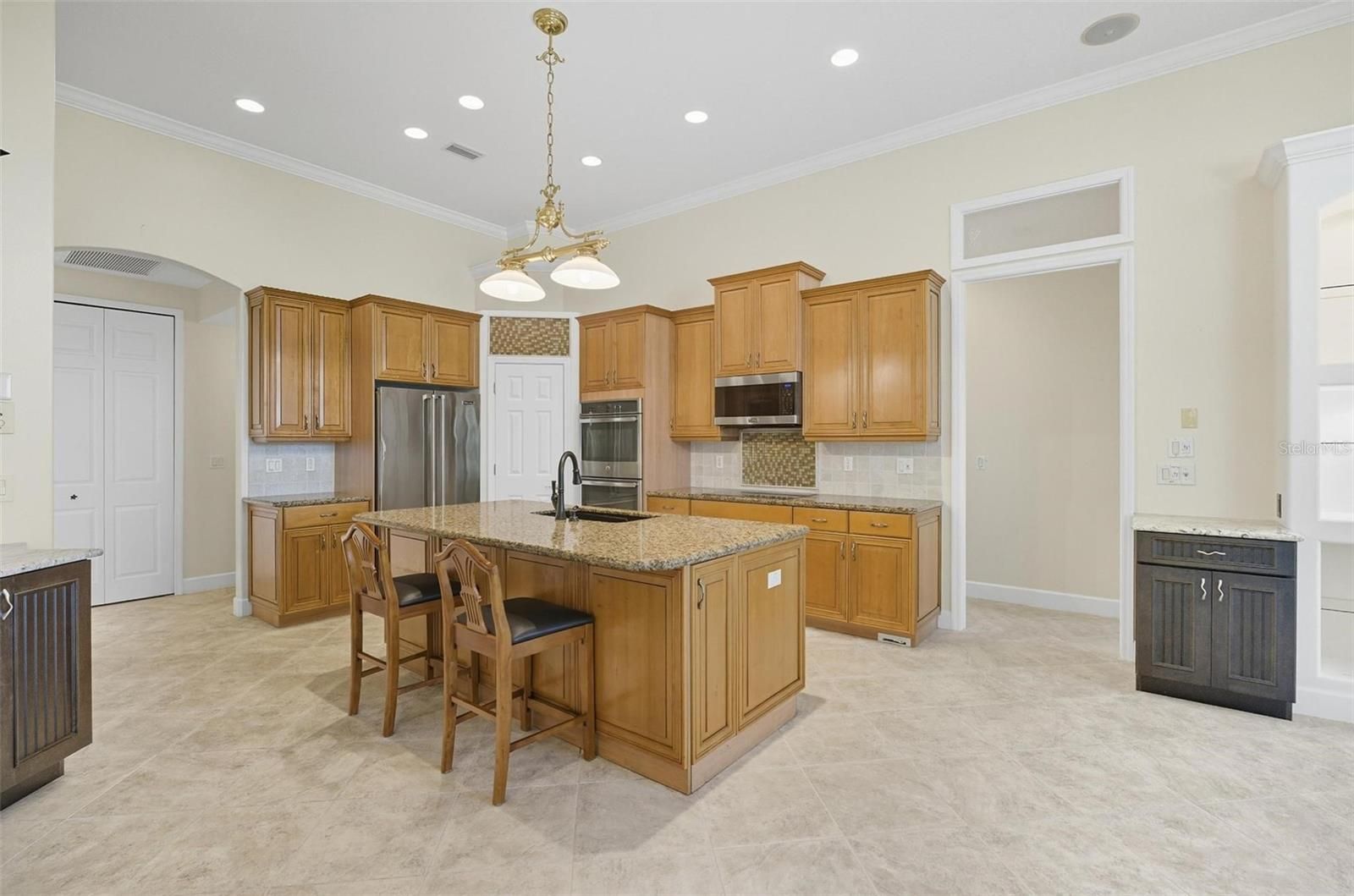 - Built-in Features, Ceiling Fan(s), Crown Molding, Eat-in Kitchen, High Ceilings, Kitchen/Family Room Combo, Other, Main Level Primary, Solid-Wood Cabinets, Split Bedrooms, Stone Counters, Thermostat, Tray Ceiling(s), Walk-In Closet(s), Wet Bar, Window Treatments