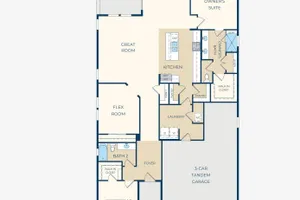 Welcome to the distinguished Clark residence in The Meadows Collection at Reverie at Silverleaf - where refined living meets thoughtful design in an elegant 2022 square foot home. This exquisite floor plan showcases a harmonious blend of sophistication and functionality, beginning with an impressive three-car tandem garage that provides abundant space for vehicles and storage. The welcoming foyer leads to a meticulously crafted great room that serves as the home's central gathering space, perfectly complemented by an adjoining café area ideal for morning coffee or casual dining. The gourmet kitchen features premium finishes and a practical layout, including a walk-in pantry and ample counter space for culinary pursuits. The owner's suite presents a private retreat with a spa-inspired bathroom featuring dual vanities and a generous walk-in closet with custom storage solutions.