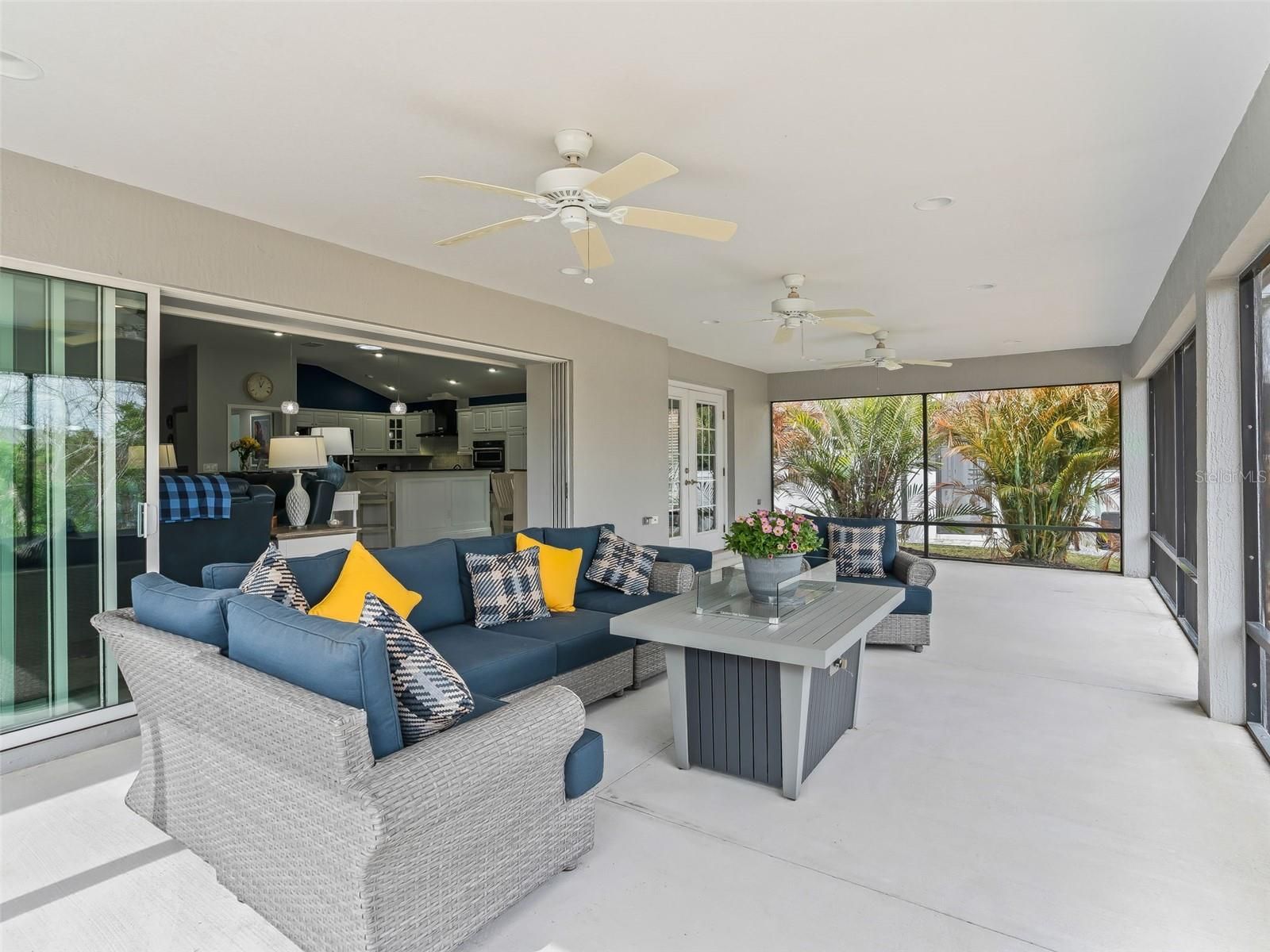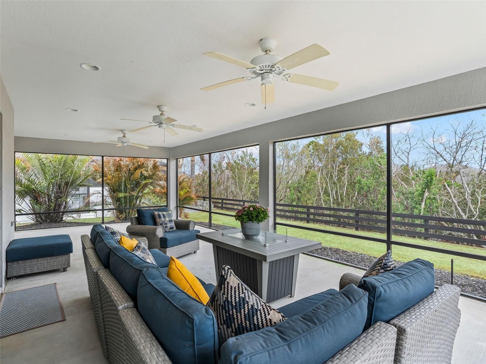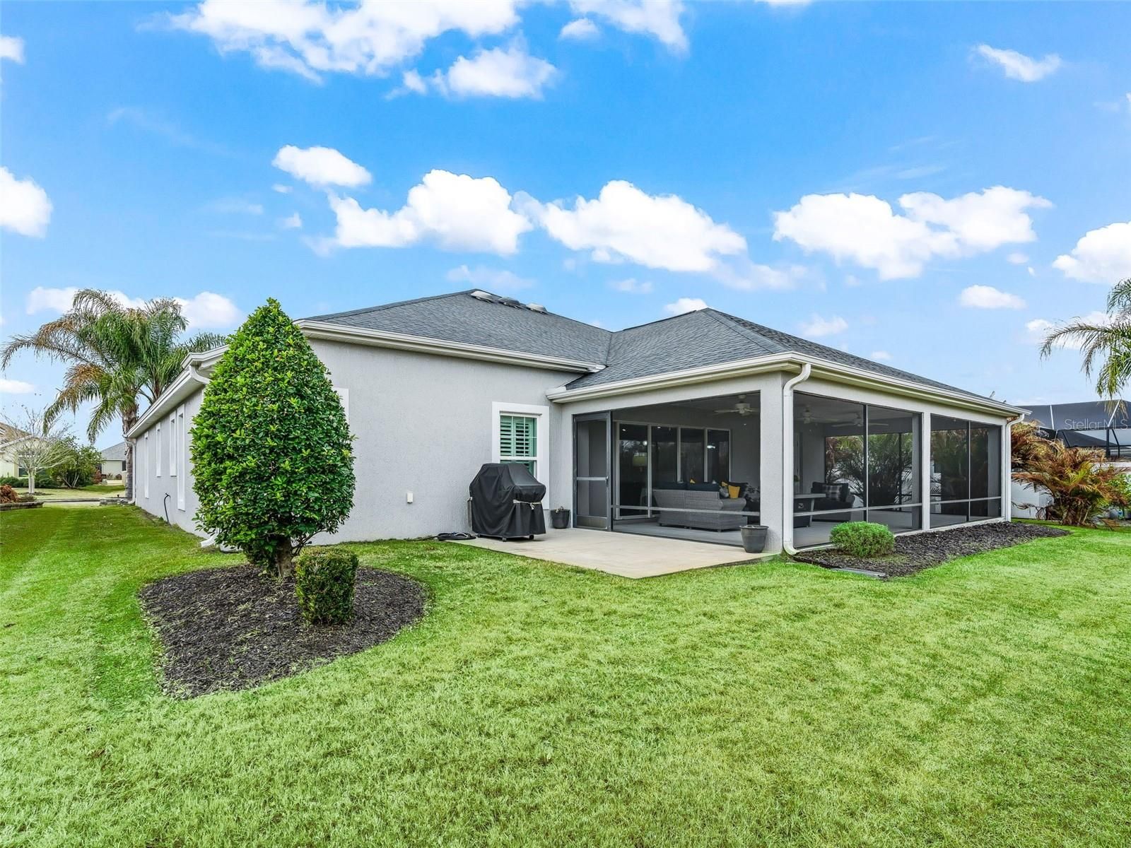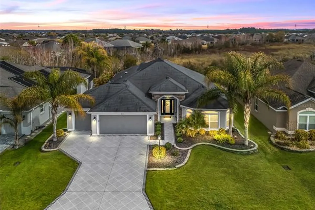 LUXURY HOME WITH VIEW OF PRESERVE! Experience refined Florida living in this beautifully appointed Laurel Oak 5 model offering 2,300+- sq ft of living space and 3,666 sq ft under roof, perfectly positioned with a tranquil view in the highly desirable Village of Osceola Hills. From the moment you arrive, the curb appeal shines with stone accents, upgraded tropical landscaping beds, a painted driveway and walkway, and a leaded glass entry with sliding screen complemented by a Ring doorbell camera. The spacious 2-car plus golf cart garage adds both convenience and functionality. Inside, the home showcases high ceilings throughout, gorgeous elongated ceramic tile and carpet flooring, plantation shutters, granite countertops, and elegant wood cornices in the great room. The open layout offers a spacious great room and dining room combination, ideal for entertaining and everyday living. The kitchen is designed for both style and practicality, featuring a center island with dedicated wine storage, separate eating area, a large breakfast bar with gorgeous pendant lighting and custom paneling, beautiful granite counter tops, stone backsplash, a solar tube for natural light, a double pantry, and an appliance package including a wall oven and customized range hood. The primary suite is a true retreat with high ceilings and a spa-like en suite featuring tower cabinetry, dual square sinks, walk-in shower with double showerheads, and a generous walk-in closet. Guests will appreciate the private guest wing with two bedrooms—one featuring a tray ceiling and bay window—and a second full bathroom. Enjoy Florida’s indoor-outdoor lifestyle through quadruple sliding glass doors plus a set of French doors leading to the screened lanai overlooking the peaceful Preserve—the perfect setting for relaxing or entertaining. Additional highlights include an indoor laundry room with built-in desk, extra cabinetry, and utility sink. Ideally located in one of The Villages’ most sought-after areas, this exceptional home combines luxury, comfort, and a prime location.