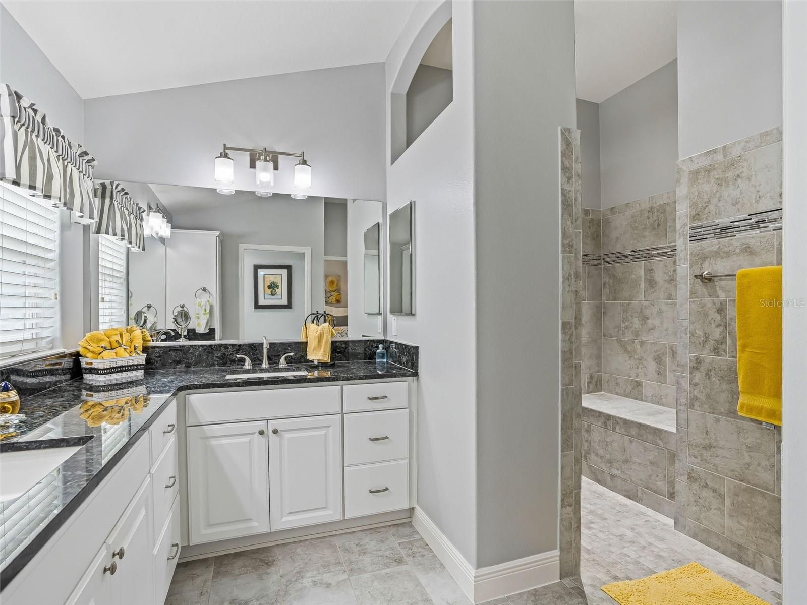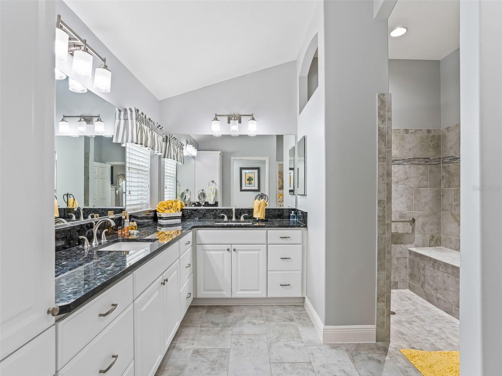 - Ceiling Fan(s), Eat-in Kitchen, High Ceilings, Living/Dining Room, Open Floorplan, Split Bedrooms, Stone Counters, Thermostat, Walk-In Closet(s), Window Treatments