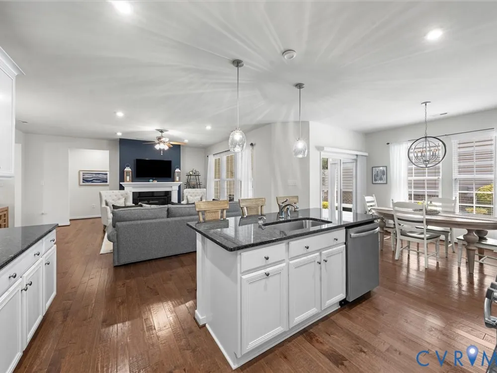 - Bedroom on Main Level, Ceiling Fan(s), Dining Area, Double Vanity, Eat-in Kitchen, Fireplace, Granite Counters, High Ceilings, Kitchen Island, Bath in Primary Bedroom, Main Level Primary, Pantry, Recessed Lighting, Walk-In Closet(s)