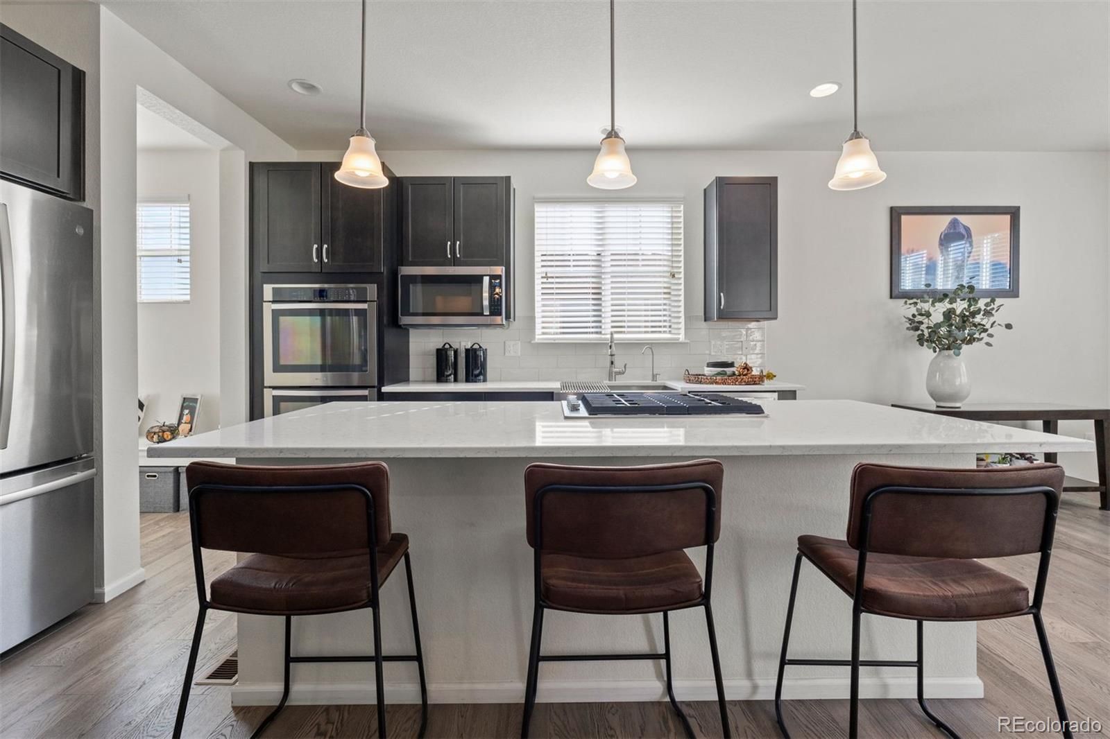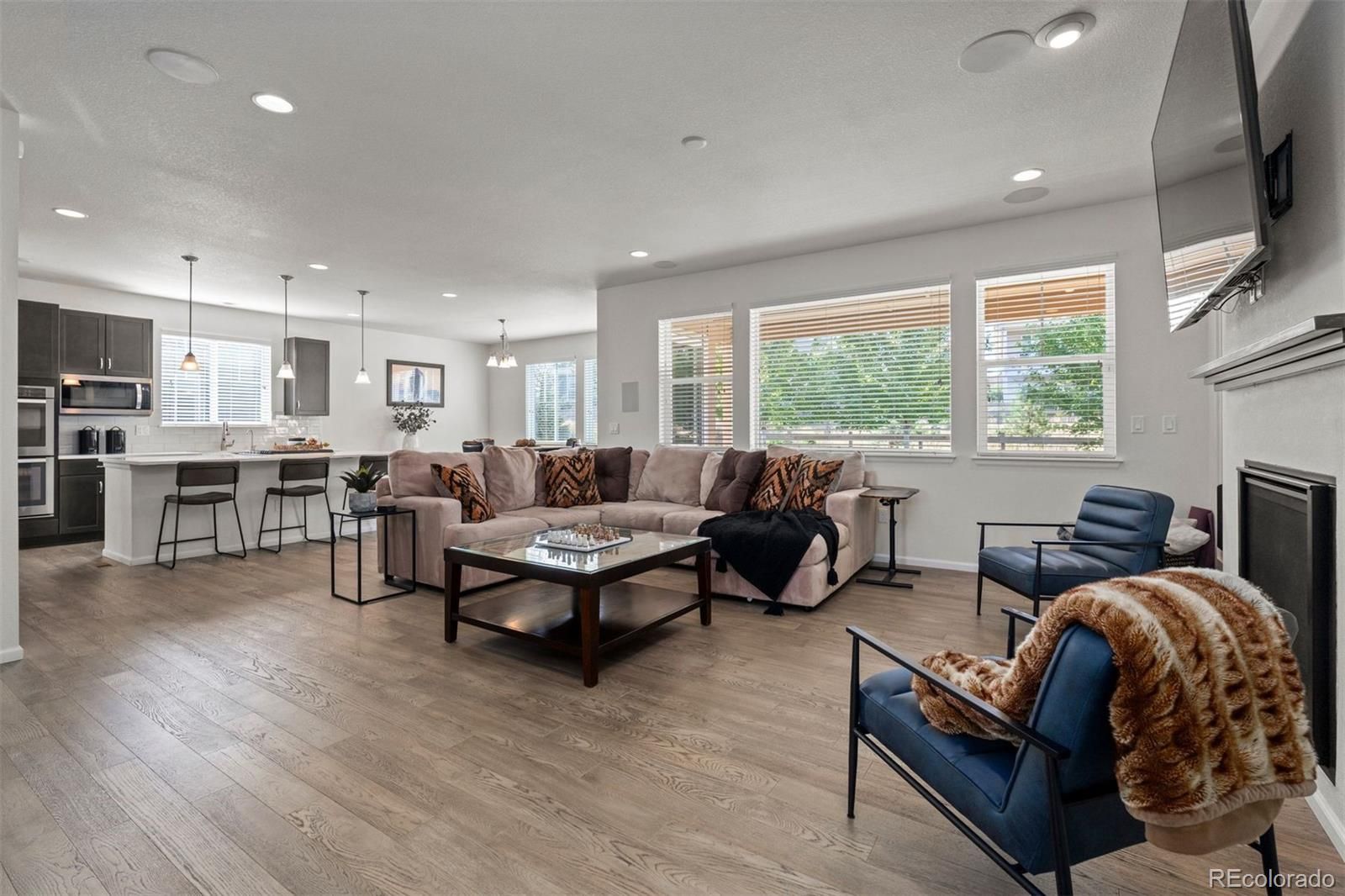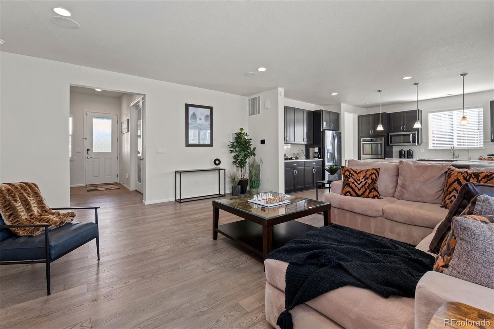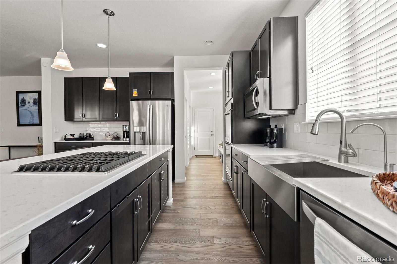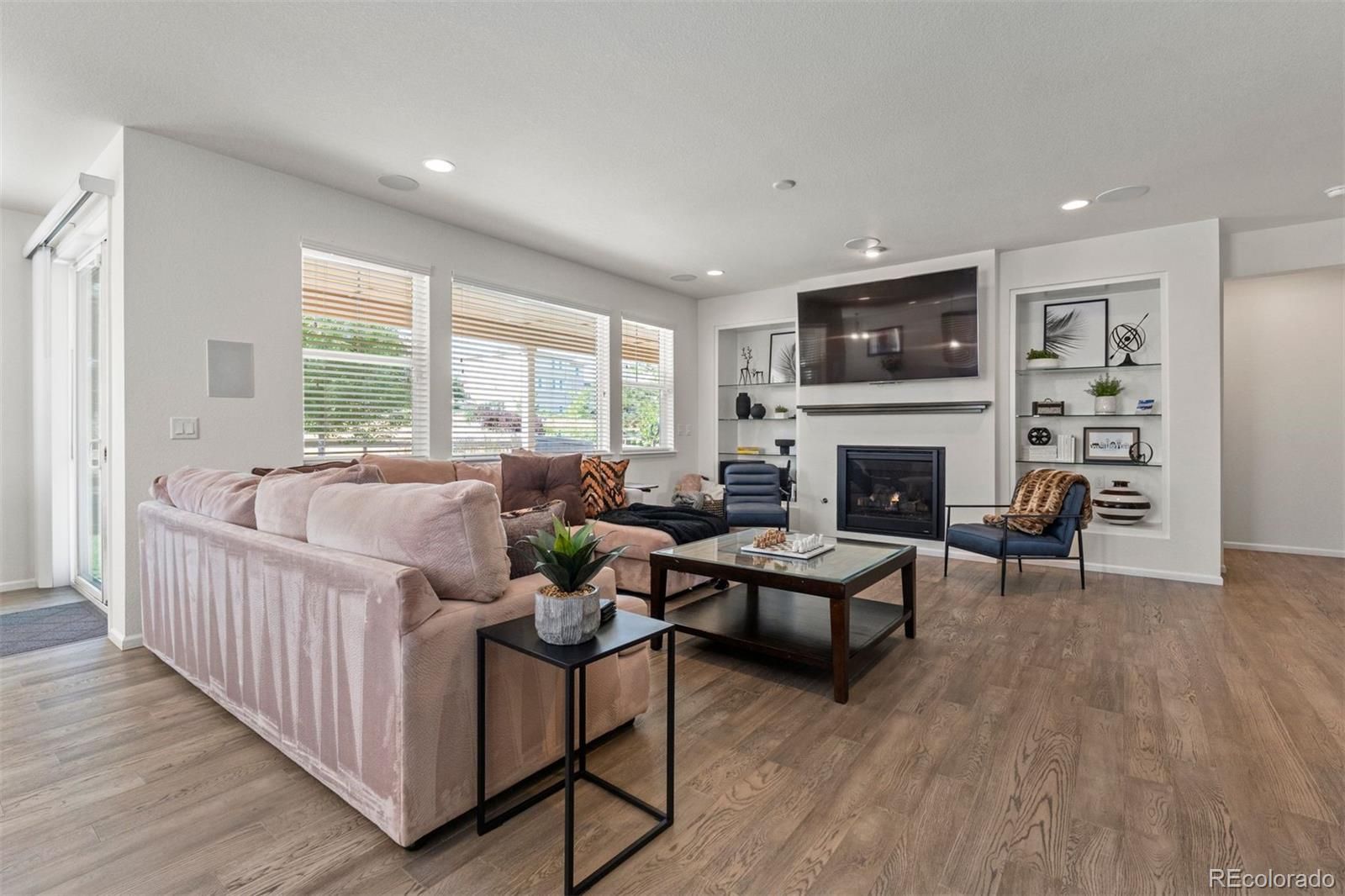 Prime Location! Original Owners built in 2019! Welcome to a home that feels warm and inviting the moment you arrive. The charming front entry and excellent curb appeal set the tone, while the open space surrounding the property and the walking path behind it provide a wonderful lot near the end of the cul-de-sac. Inside, you’ll find a bright, spacious ranch layout designed for today’s lifestyle. The expansive kitchen features abundant cabinetry, generous quartz countertops, a large island, and stainless steel appliances, plus an oversized pantry. The floor plan flows seamlessly into the dining and living rooms—perfect for entertaining and staying connected—with surround sound and a cozy gas fireplace. A sliding door leads to the oversized covered patio, where you can enjoy the beautiful yard and custom-built firepit. The primary suite is a true retreat with vaulted ceilings, a walk-in closet, and a spa-inspired five-piece bath, including a large walk-in shower and soaking tub. A second bedroom offers its own en suite bath with total privacy, while a dedicated office (or potential third bedroom) is paired with a conveniently located powder bath across the hall. The unfinished basement has the potential to double your square footage and is ready for your vision and finishing touches. Step outside to a beautifully landscaped backyard with multiple spaces for entertaining—don’t forget the firepit—and direct access to open space and trails. This peaceful setting offers both privacy and connection to nature, with Ward Reservoir just minutes away, perfect for evening walks by the water. The HOA includes a clubhouse, pool, parks, and small-lake access. All of this comes with the convenience of nearby parks, schools, shopping, dining, and an easy commute to downtown Denver, making this home the perfect blend of comfort, lifestyle, and location.