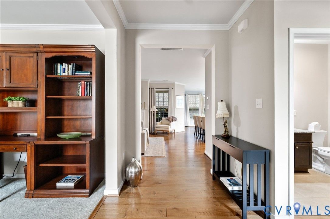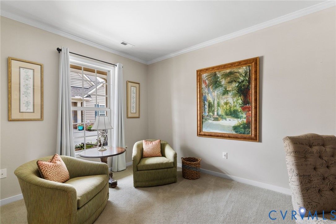This is the ONE you have been waiting for! Welcome to all the Greenwich Walk Active 55+ Community has to offer in this beautifully appointed Villa Home located in the heart of the neighborhood away from busy street noise. 9' ceilings are highlighted by plentiful crown moulding and wide plank hardwood flooring in many rooms. Cozy fireplace provides the perfect focal point in LR which opens to the Kitchen with its oversized central island, crisp white cabinetry, quartz counters, marble back splash and abundant task and storage space including a step-in pantry closet for all your essentials. Windows surround the Dining Area and along with 2 solar tubes, invite soothing natural light into your spaces. Step through sliding glass to lovely, covered porch that provides a quiet retreat and elevated planters for garden color. Primary Suite has a generous scale and includes tray ceiling for added character, WI Closet, EnSuite bath with double vanity, oversized, zero entry shower with seamless glass and private water closet with its own window. Stunning, upgraded ceramic tile details are found here and in the additional Full Bath located adjacent to the second Bedroom. Front Office off the Entry overlooks a covered front porch - you can sit inside or outside to welcome your guests! Upstairs a finished, carpeted Loft area allows the option for an Upstairs Den or Flex Room and a walk-in attic provides additional storage beyond the generous 2 car garage. The neighborhood provides lawncare and some exterior maintenance, modern clubhouse with gathering spaces for activities, fitness area, terrace, pool, racquet and walking trails and more. Move-In. Relax. Enjoy!