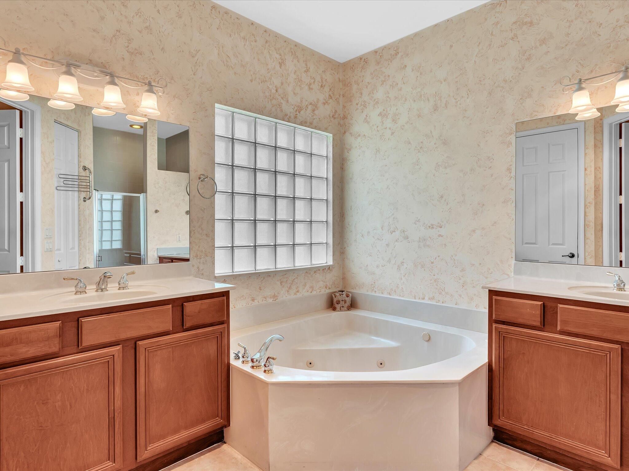 - Entrance Foyer, High Ceilings, Pantry, Walk-In Closet(s), Stacked Bedrooms, Pull Down Attic Stairs, Dual Sinks, Main Level Primary, Separate Shower, Soaking Tub, Whirlpool