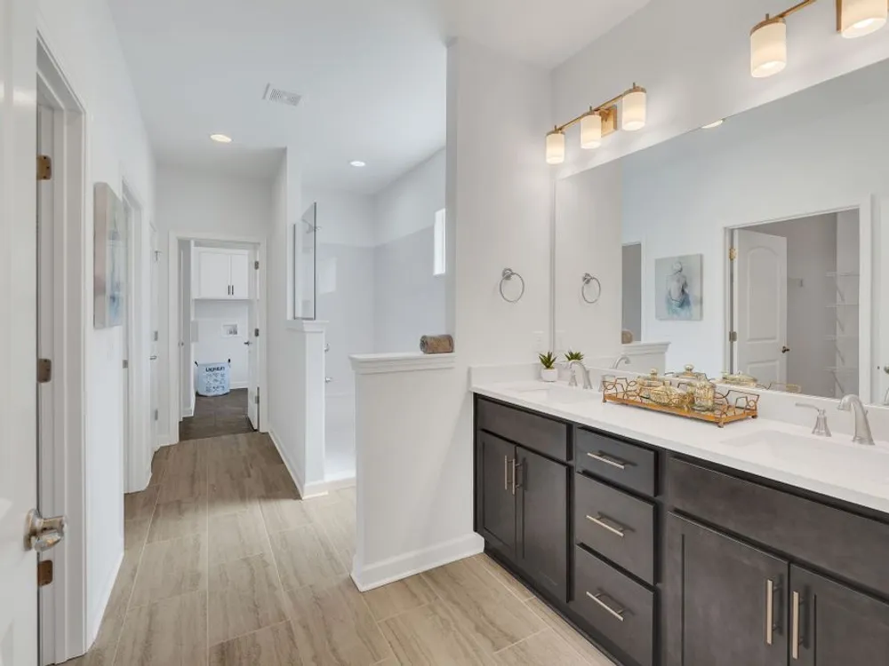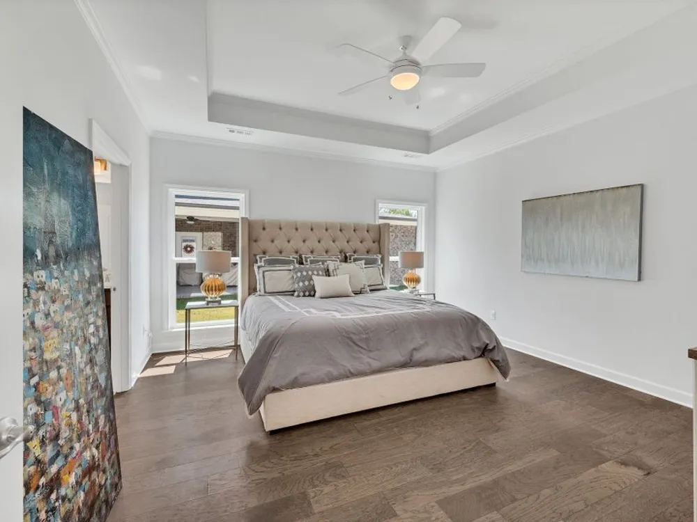 Welcome home to Parkhaven! This Brookmeade B is located on a premium lot with additional guest parking and features a 3 car garage. The home has a beautiful open 2 story foyer to welcome natural light and guests into your home, has 3 bedrooms with full en-suite baths and offers open concept living. Your primary bedroom is on the main level and the laundry room has dual access from your primary bathroom and kitchen. The primary bath features a large, roman style walk-in shower and large walk-in closet. There is a large guest bedroom with it's own en-suite and walk-in closet located on the main level as well. Upstairs you'll find another large bedroom/flex space with a full en-suite bath. Additionally, there is a very large walk-in storage space upstairs. You also have an indoor as well as an outdoor fireplace. The covered side patio offers plenty of space to relax, entertain or grill, as there is a gas line to directly connect your outdoor kitchen to! There is also a beautiful natural wood mantel and hookup for your television.