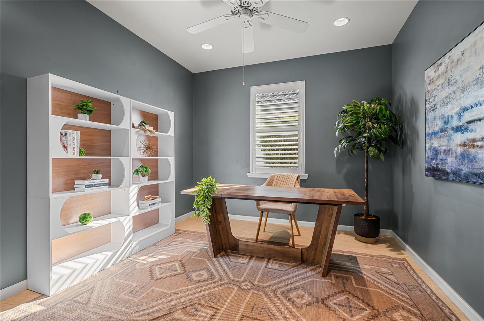 - Built-in Features, Ceiling Fan(s), Central Vacuum, Crown Molding, Eat-in Kitchen, Kitchen/Family Room Combo, Open Floorplan, Main Level Primary, Solid-Wood Cabinets, Split Bedrooms, Stone Counters, Walk-In Closet(s), Window Treatments