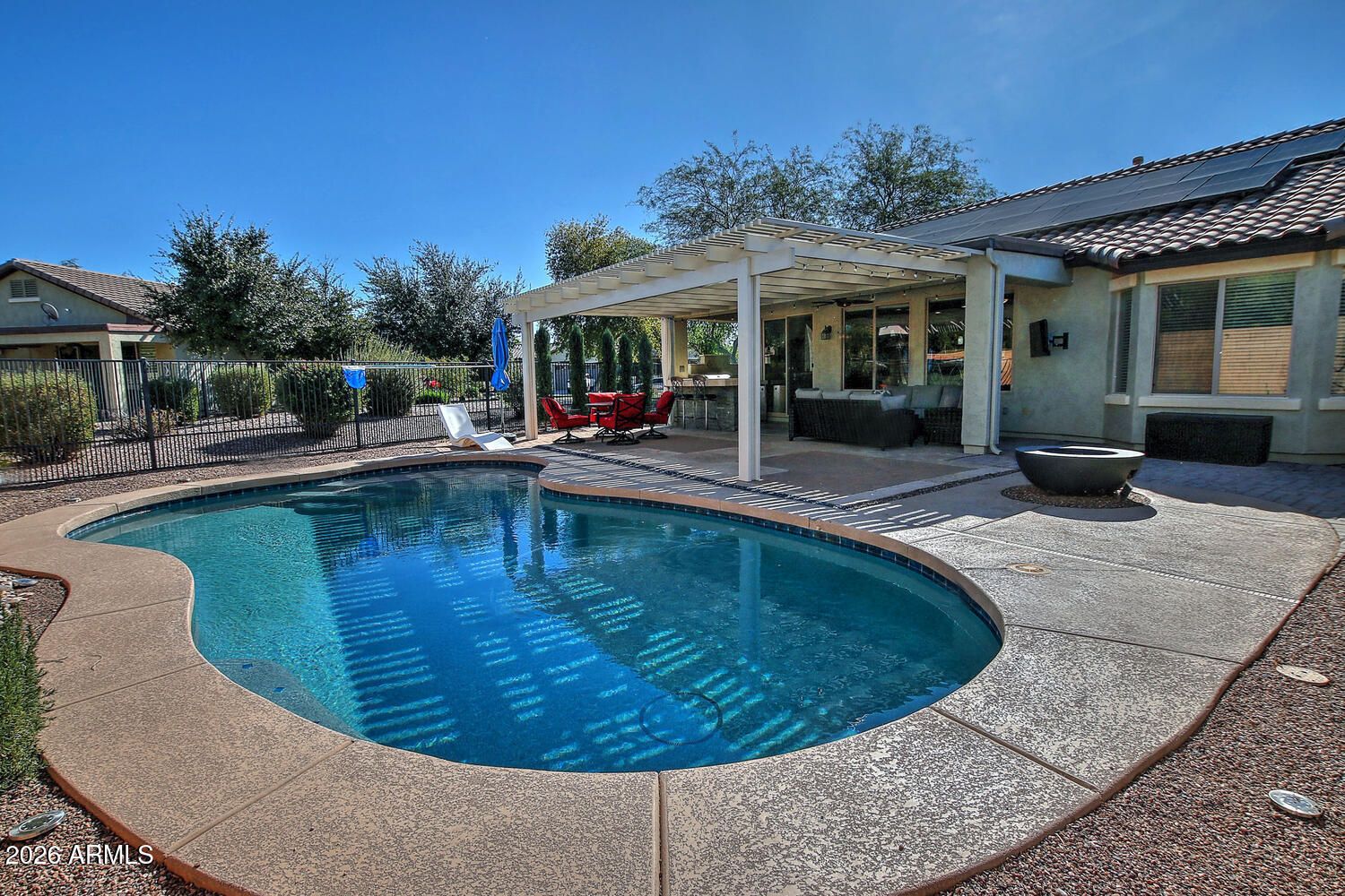 Located in the desirable Sun City Anthem at Merrill Ranch community, this Providence floorplan features 2 bedrooms, 2 bathrooms and a versatile den w/murphy bed. This former model home is loaded with upgrades and is sold TURNKEY for effortless living. The kitchen showcases granite countertops, stainless steel appliances and ample cabinetry. Step outside to your private backyard oasis with a heated saltwater pool, pergola, gas firepit and outdoor kitchen—perfect for year-round enjoyment. Energy-efficient solar adds long-term savings. The 2-car garage plus golf cart garage provides extra storage and convenience. Thoughtfully designed, beautifully maintained, and move-in ready, this home offers the ideal blend of comfort, style, and resort-style living. Simply a must see home!