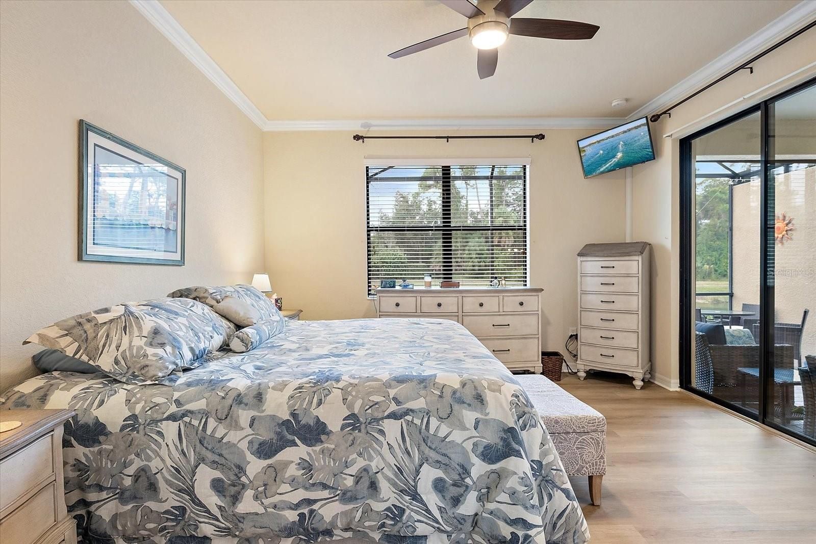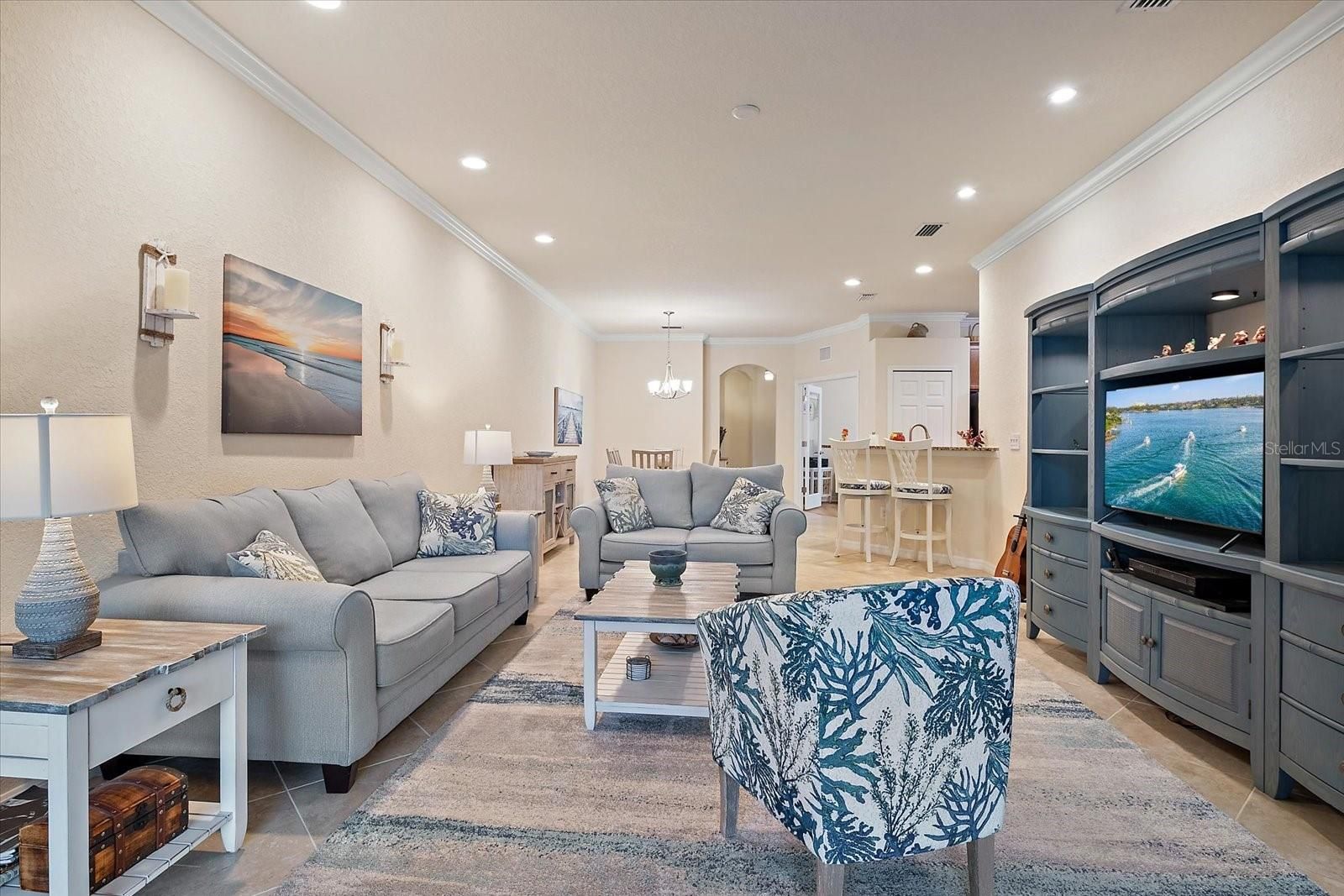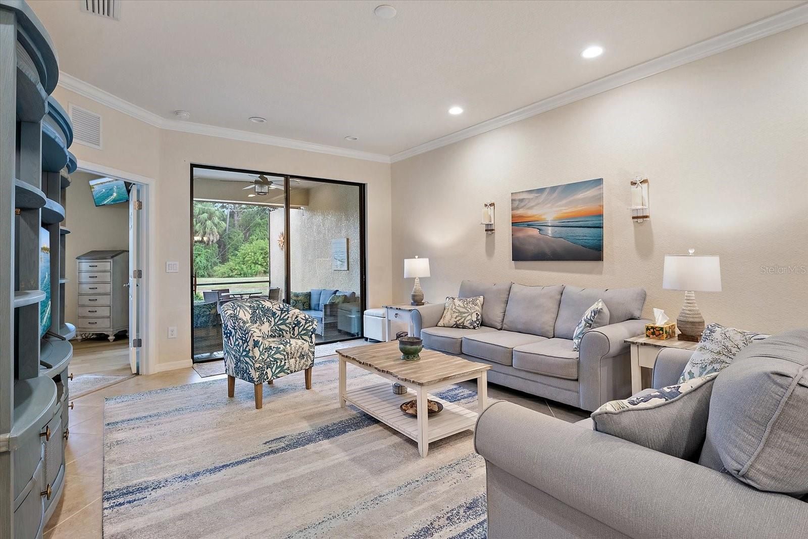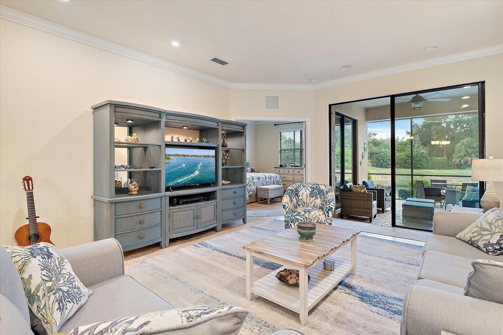 Welcome to your Florida Paradise located in the well-established community of River Strand Golf & Country Club. This beautifully maintained 2-Bedroom, 2-Bathroom Villa includes a Den/Office that can easily serve as a THIRD Guest Bedroom. Enjoy peaceful POND views from the enclosed Extended Lanai with a Retractable Awning, and Ceiling Fan — the perfect spot for relaxing or entertaining outdoors. The home features a bright Open-Concept floor plan with recently updated Luxury Vinyl Plank Flooring in all bedrooms and the den — waterproof, durable, and easy to maintain. NO CARPET. CROWN Molding throughout. All bedrooms feature Ceiling Fans with Lights, adding both comfort and functionality. The kitchen showcases elegant Granite Countertops, Under Cabinet Lighting, and a stylish Breakfast Bar with included barstools. It flows effortlessly into the Dining and Living areas, enhanced by added Recessed Lighting and Direct Access to the Lanai — perfect for entertaining or simply enjoying the Florida lifestyle. The Primary Suite includes TWO Separate Closets and an En-Suite Bath featuring dual sinks, a soaking tub, separate shower, and private water closet. Laundry Room features included washer/dryer along with built-in Cabinets for additional storage. The TWO-Car Garage provides ample storage and was recently resurfaced with an industrial-grade Polycuramine finish for a clean, POLISHED look. Metal Hurricane Shutters are included. Residents of River Strand enjoy an exceptional array of Resort-Style amenities included with the SOCIAL Membership. The amenities feature 8 Swimming Pools, including a resort-style pool with a Tiki bar and grill, Tennis and Pickleball Courts, Two Fitness Centers, and a Full-Service clubhouse offering Social Events and Activities throughout the year. The 27-hole championship golf course, designed by Arthur Hills, is available on a pay-as-you-play basis, this home is NOT a golf-deeded property. A 24-hour Guarded Gate provides added Security and Peace Of Mind for Residents. Conveniently located near the Bradenton MARKET Place, offering a variety of shopping and dining options, and just minutes from the beautiful beaches of Bradenton and Sarasota, this villa offers the perfect combination of comfort, lifestyle, and location — ready for you to enjoy the Florida way of life.