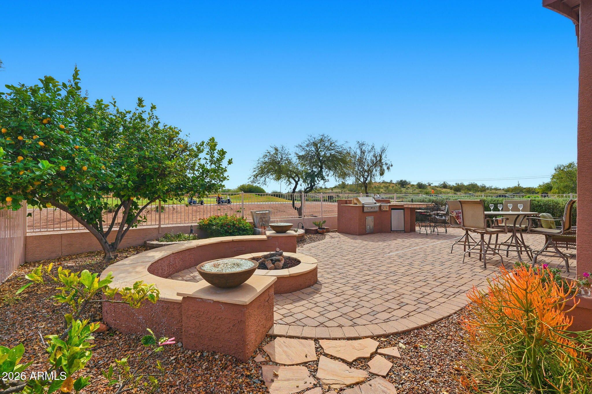 Fantastic Views and a place to entertain!! New AC July 2019 and new roof underlayment September 2023! This upgraded home offers great storage! A kitchen with Hi-Macs counters, accent lighting, cherry cabinets w/pull-outs, tile backsplash, slate appliances, and shutter window treatments. ''Most'' of the home's contents stay, so bring a toothbrush and your suitcase! Also, you'll love the entertainer's backyard with $20K+ paver patio, outdoor kitchen w/BBQ, bar & fridge, fire pit w/lava bowls, raised garden bed, and golf course frontage directly off a green. Spacious laundry w/washer, dryer, sink, cabinets & pantry. Garage w/workbench, cabinets & added storage niche. Private owner's suite w/dual vanities, step-in shower & walk-in closet w/built ins. Come in and start living your best life!