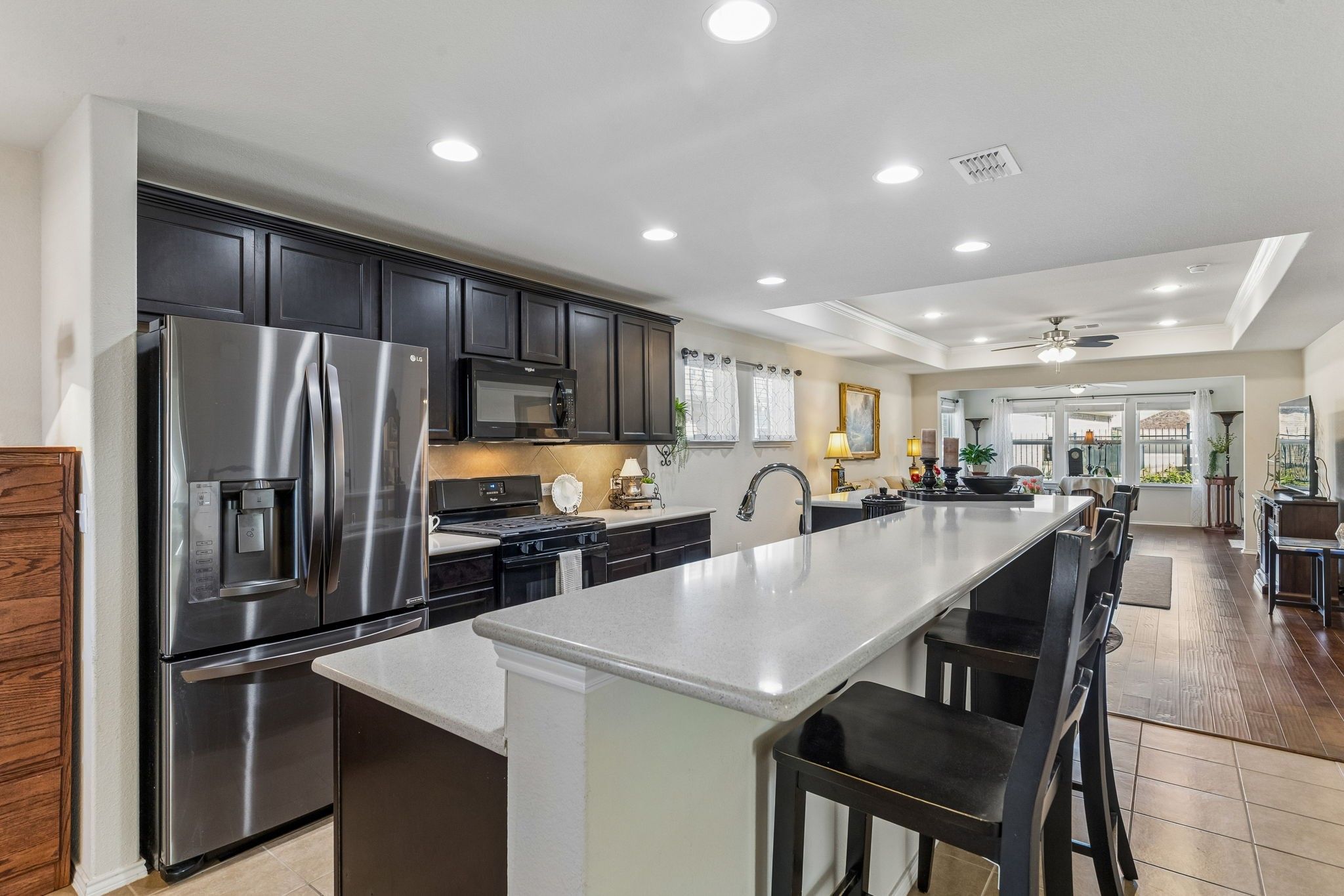 Welcome to 6744 Hickory Creek Dr in Frisco Lakes—a beautifully maintained single-story home that blends comfort, style, and easy living. From the moment you arrive, the charming brick exterior, manicured landscaping, and inviting front entry set the tone. Inside, you’re greeted by an open-concept layout with rich wood flooring, abundant natural light, and elegant finishes throughout. The spacious living area features a tray ceiling and flows seamlessly into the kitchen, making it perfect for both everyday living and entertaining. The kitchen is a standout, offering sleek countertops, dark cabinetry, stainless steel appliances, and a large island with bar seating—ideal for casual meals or gathering with guests. The adjacent dining and living spaces create a warm, connected feel while still providing defined areas. A bright sunroom-style sitting area at the back of the home provides a peaceful retreat, filled with natural light and views of the backyard. Step outside to the covered patio, where you can relax year-round, enjoy morning coffee, or host weekend get-togethers in a private, low-maintenance outdoor space. The home’s thoughtful layout maximizes functionality and comfort, with well-proportioned rooms and quality finishes throughout. If you are looking for a move-in-ready home in a desirable active adult community, this property checks all the boxes.