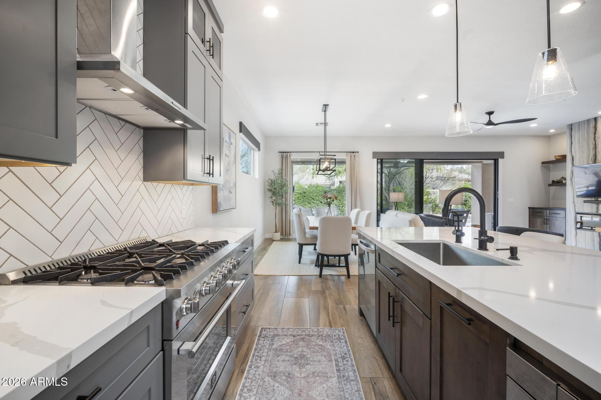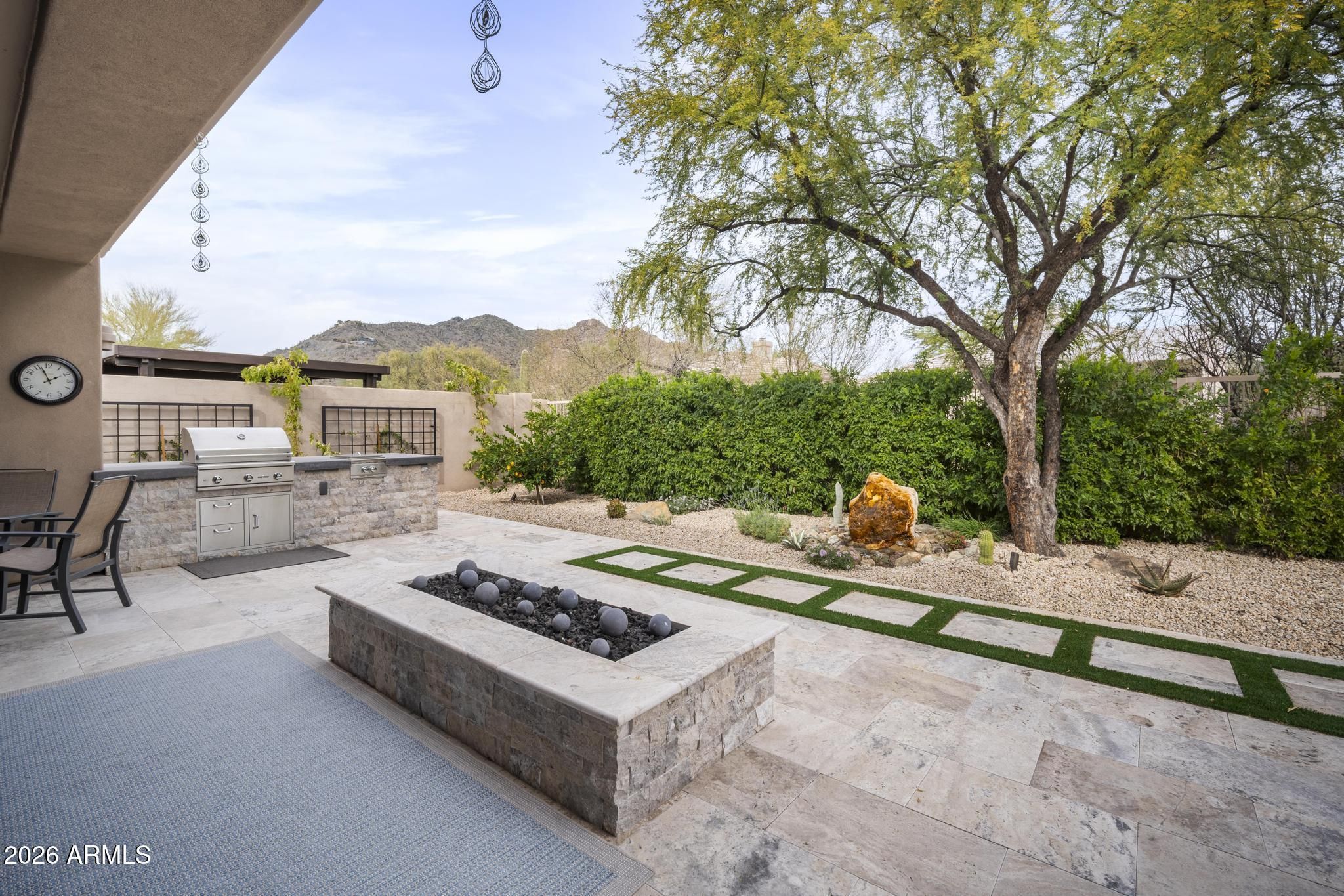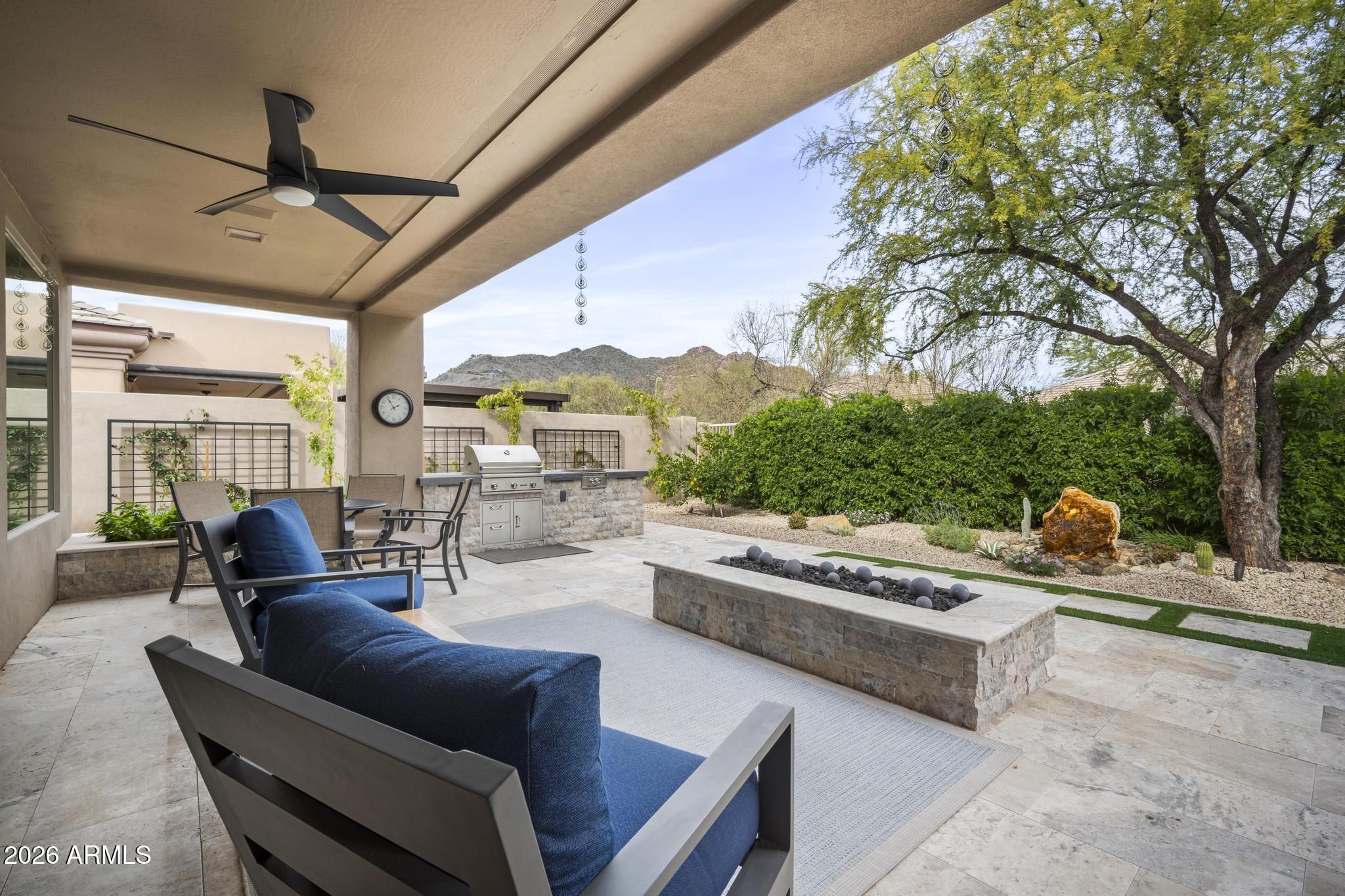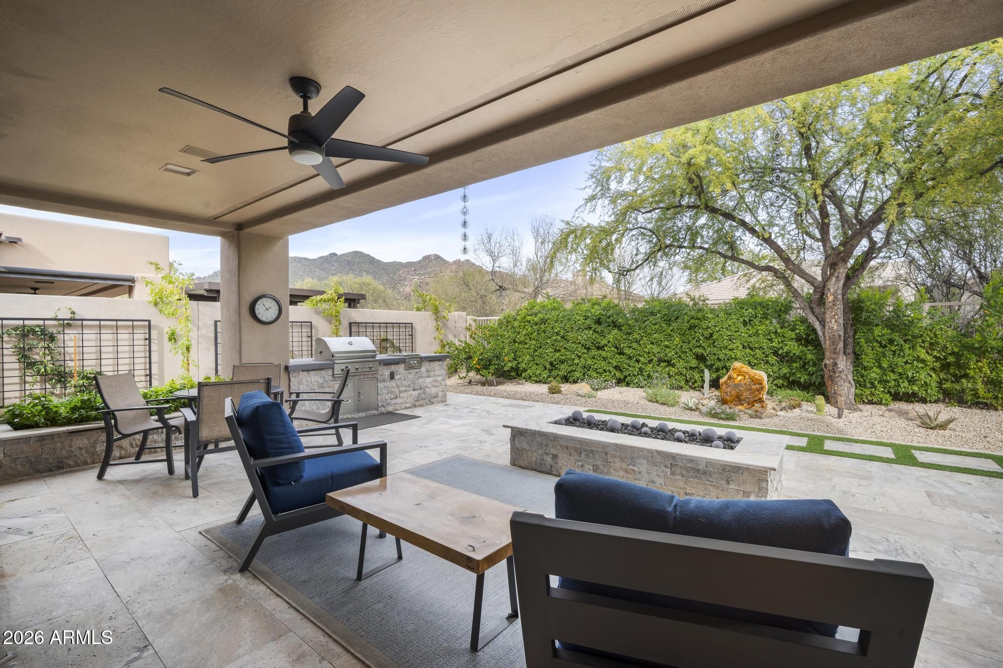 Welcome to the highly sought-after Vaga + floor plan with a private casita, located in the prestigious gated community of Terravita in North Scottsdale. This home has been completely remodeled from top to bottom, offering luxurious finishes, designer upgrades, and breathtaking desert mountain views. The show-stopping kitchen features custom cabinetry to the ceiling, quartz countertops, a large center island, 6-burner gas range with hood, RO system, and a built-in wine/beverage cooler perfect for entertaining. The living room is anchored by a dramatic bookend granite electric fireplace, framed by sleek built-ins and floating shelves. Step through new stacked sliders to your backyard oasis, fully redesigned with new travertine patios, a gas fire pit, built-in BBQ with burner, a custom roc k fountain, and stunning views of Black Mountain, surrounded by beautiful vegetation including lemon and lime trees. Additional upgrades include new irrigation front and back, new gutters, and a newer on-demand tankless water heater. Inside, enjoy all-new flooring, baseboards, doors, trim, and fresh interior paint throughout. The casita was also remodeled in 2023, providing a perfect space for guests or a private office. The primary suite is a true retreat, with a just-completed spa-inspired bathroom featuring new cabinetry, countertops, a beautifully tiled shower, freestanding soaking tub, and all-new fixtures, lighting, and mirrors-just awaiting the shower glass installation. As a resident of Terravita, enjoy a resort-style lifestyle with a championship golf course, clubhouse, pool and spa, fitness center, tennis, pickleball, scenic hiking trails, and vibrant community events-all set against the stunning Sonoran Desert backdrop. This home is located in a very desirable location within walking distance to the club and all the amenities. This is turnkey Terravita living at its finest.