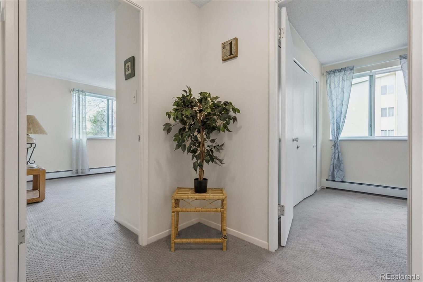 Oh my, what a gorgeous view of the beautiful trees, shrubs and Highline Canal trail off of the lanai which overlooks a lovely courtyard! This is a bright 2 bedroom and 1 bath end unit with cross ventilation, an elevator building and lots of natural lighting! The laundry room is down the hall on the same floor! New lanai patio door, new light fixtures, new A/C with remote control and new paint. Garage #46 with remote. There are so many amenities to enjoy. Golf, restaurant, fitness center with indoor and outdoor pools, clubs and activities, plus so many programs for you to enjoy! The HOA fee includes PROPERTY TAXES, heat, water, sewer, trash, exterior maintenance, building maintenance, plus more! You don't want to miss out on this one!