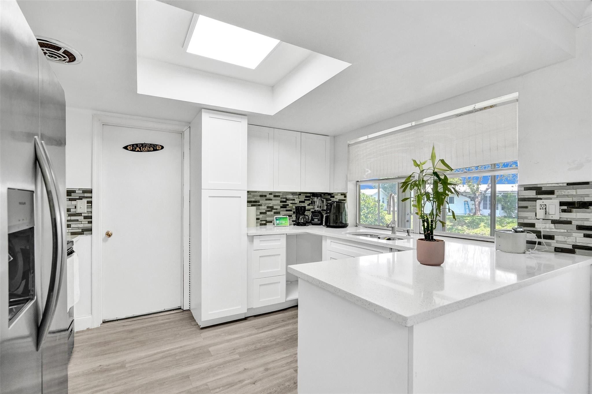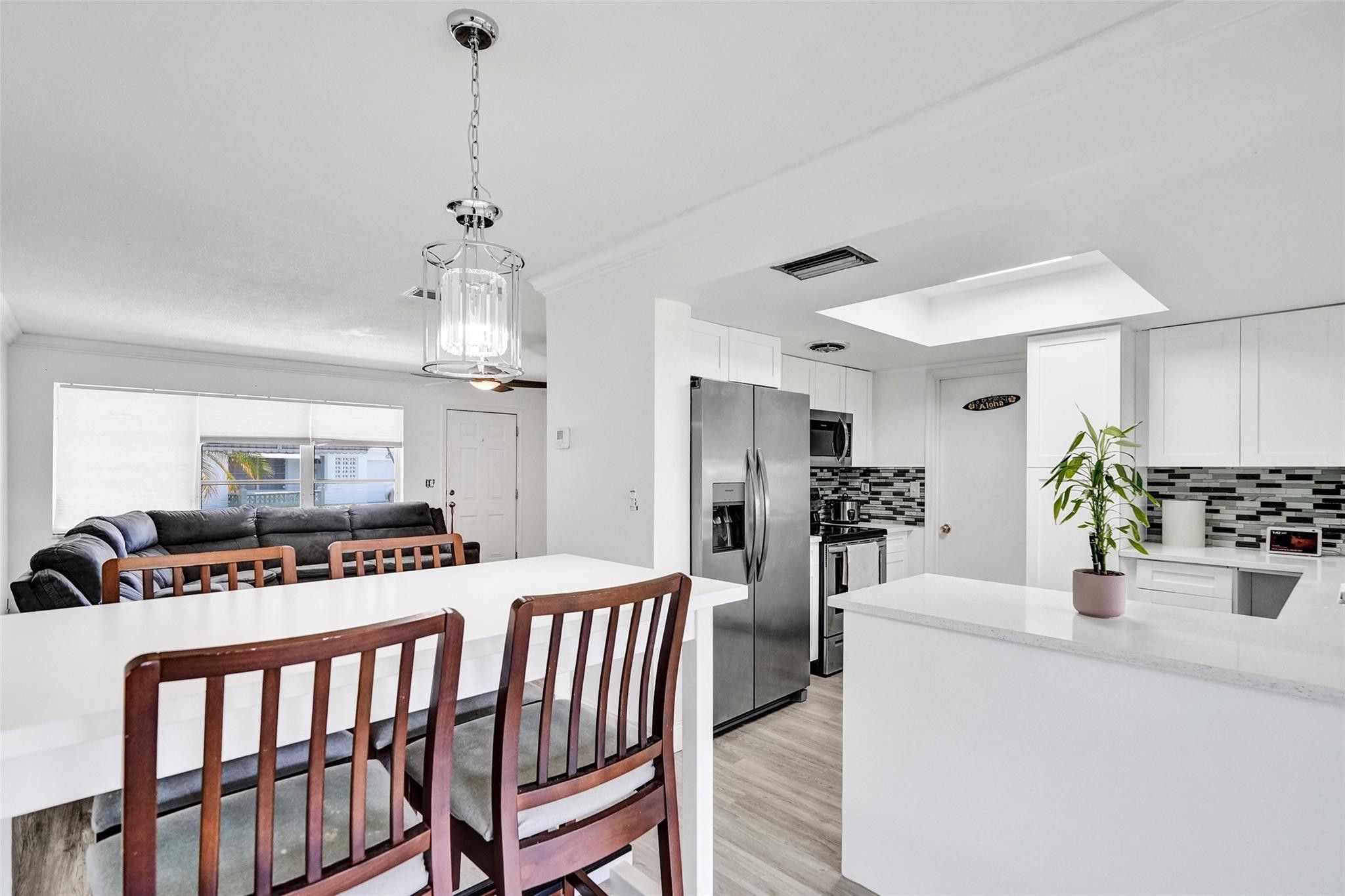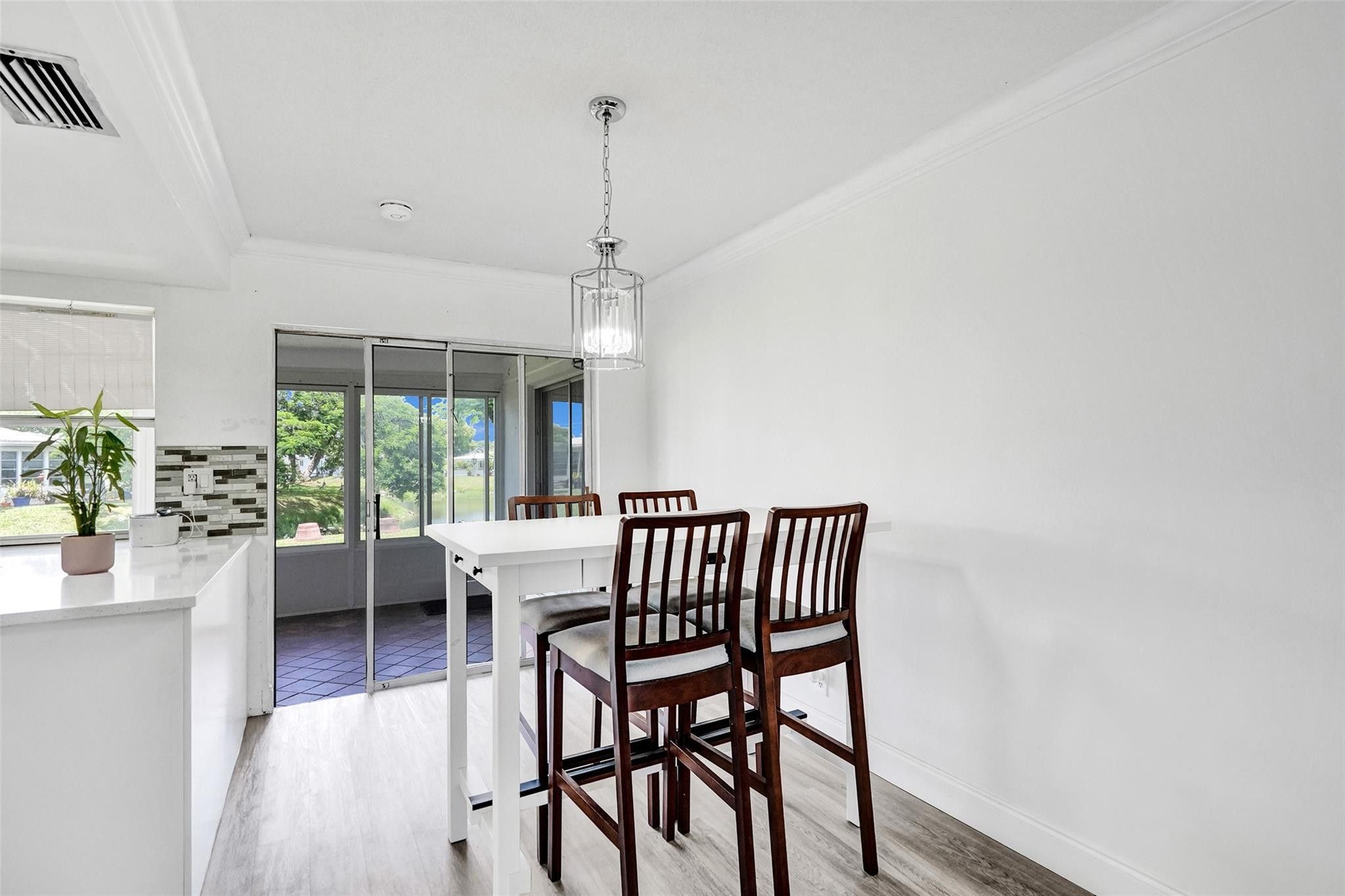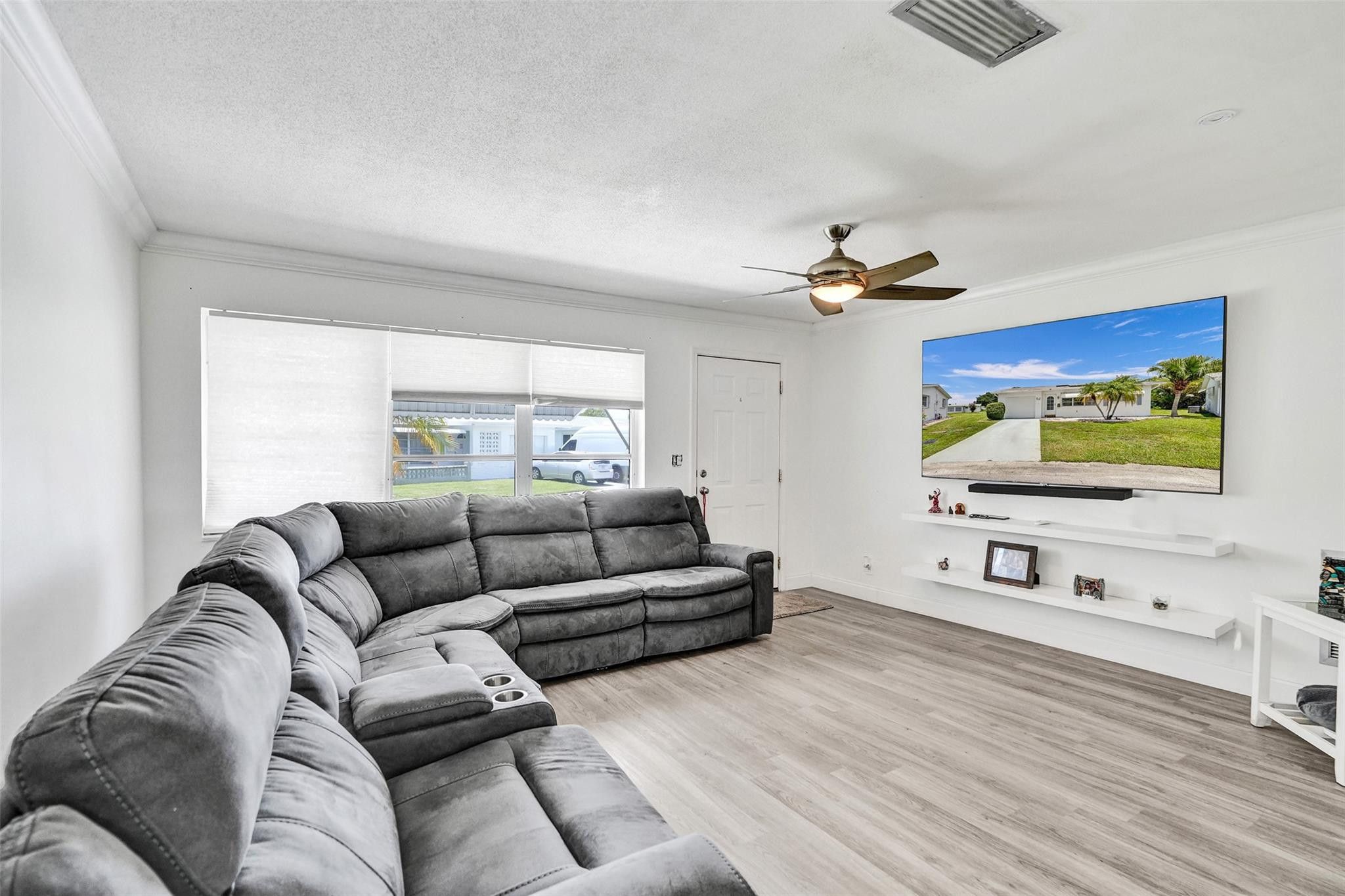 Seller's Credit of $10,000 is being offered with a full price offer ONLY. ***LARGE, PIE-SHAPED, WATERFRONT LOT.*** Retirement is easy in this MOVE IN READY 2-BR home featuring NEWER WATERPROOF WOOD FLOORS; FRESHLY PAINTED INTERIOR; UPDATED BATHROOM; An UPDATED MODERN KITCHEN with WHITE SHAKER CABINETS paired with QUARTZ COUNTERTOPS & ALL MATCHING STAINLESS KITCHEN APPLIANCES. Enjoy PEACEFUL WATER VIEWS from KITCHEN, MAIN LIVING AREA, MASTER BEDROOM & ENCLOSED FLORIDA ROOM with windows. SOLAR PANEL installed recently and Seller's electric bill is under $100. ** 2023 RHEEM WATER HEATER & 2020 RHEEM AC. **An Active 55+ Community with lots to do. LOW HOA Fee covers grass cutting, repainting exterior of homes every few years and amenities.** PRICED TO SELL ! MOVE IN READY 2BR HOME on a LARGE PIE-SHAPED, WATER FRONT LOT. New waterproof wood floors, freshly painted interior, 2020 AC, 2023 WATER HEATER; OPEN LAOUT; LOW HOA FEES+++ SELLER MOTIVATED!