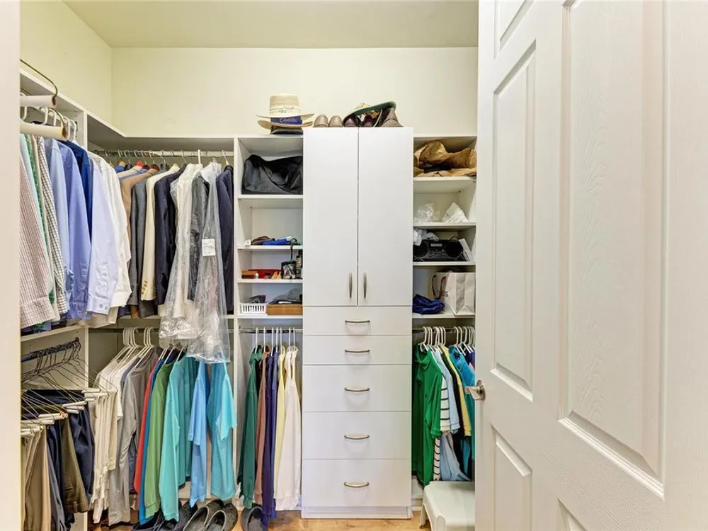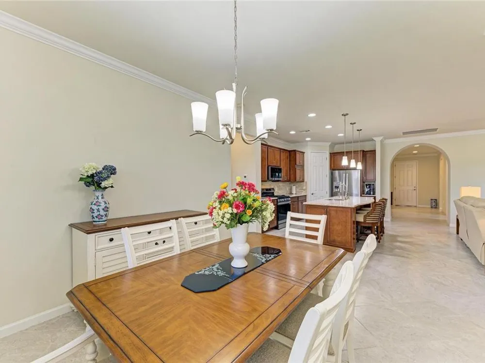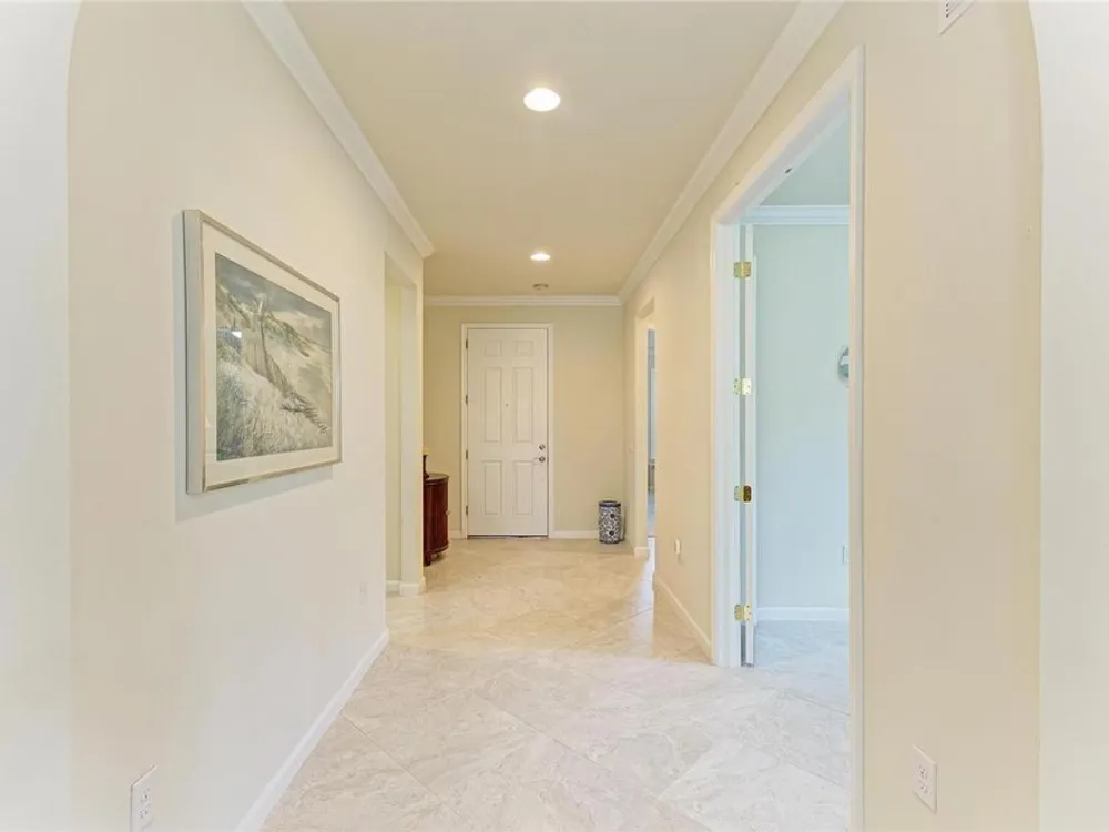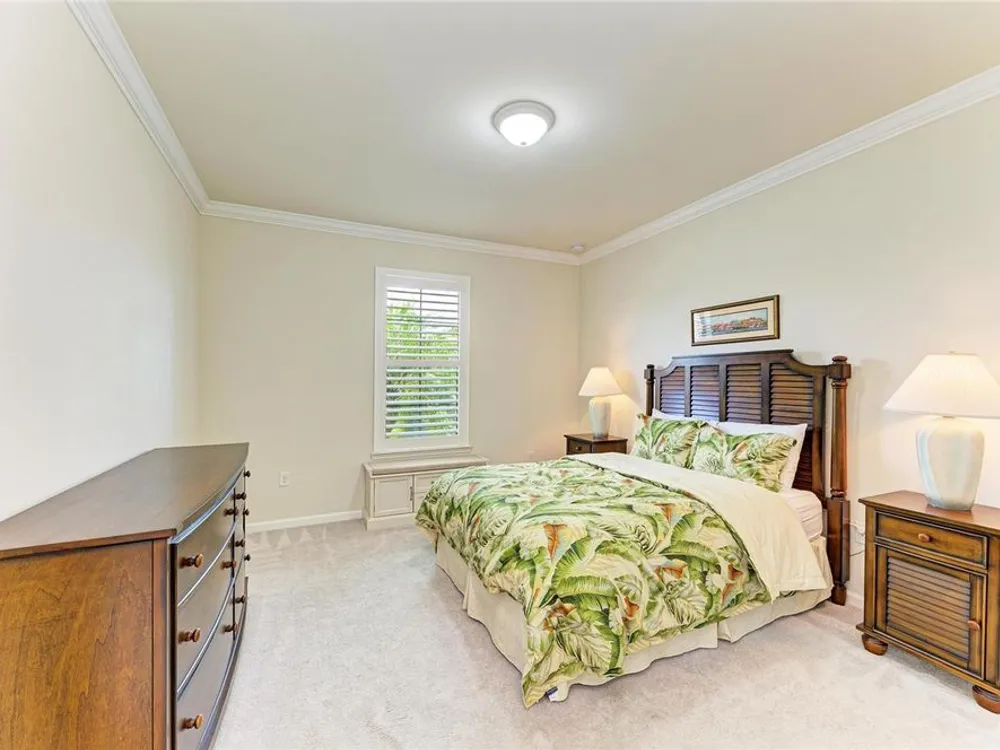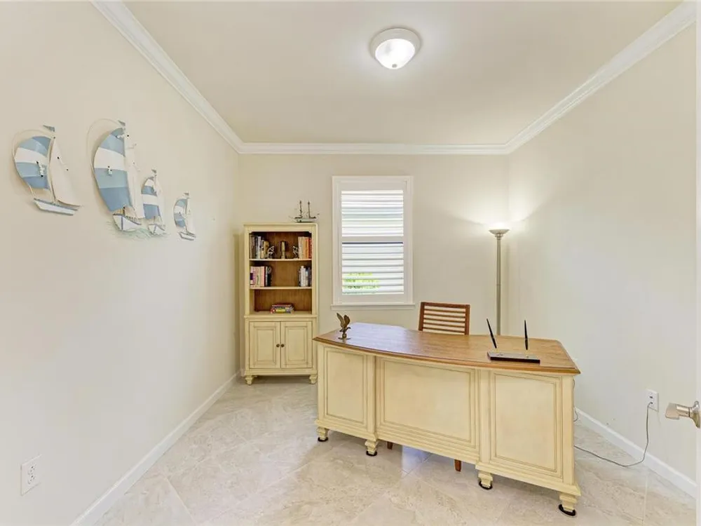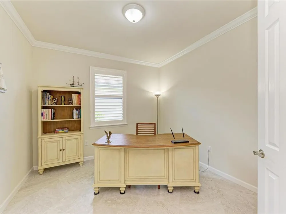 - Built-in Features, Crown Molding, Eat-in Kitchen, In-Wall Pest Control, Open Floorplan, Main Level Primary, Split Bedrooms, Stone Counters, Window Treatments