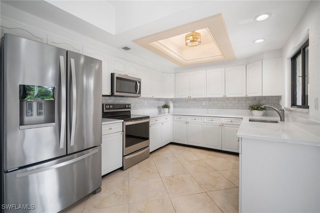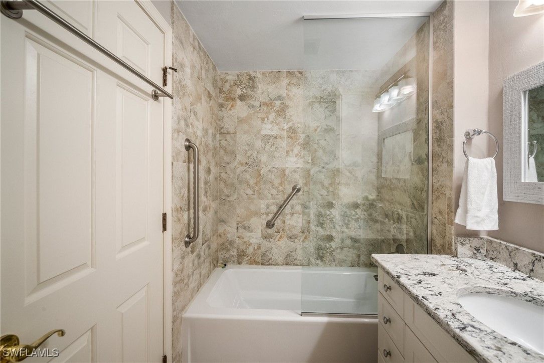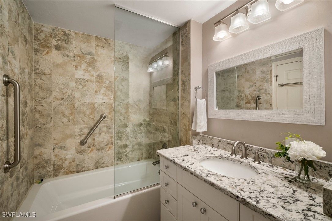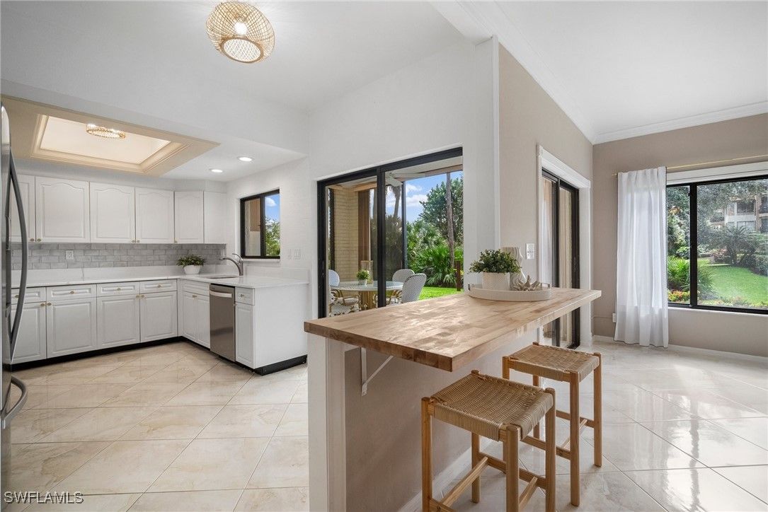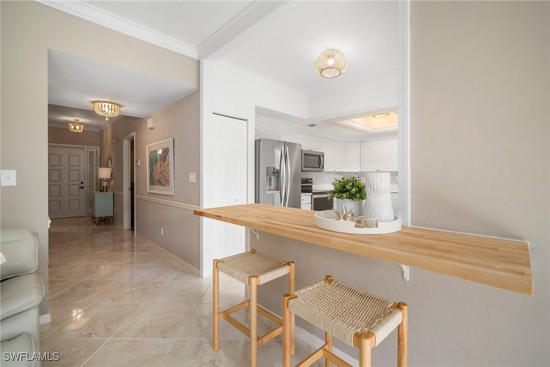 Experience the ultimate Pelican Bay lifestyle in this beautifully updated, turnkey-furnished 2-bedroom, 2-bath condominium with serene pond and water feature views. The open-concept layout is enhanced by gorgeous marble tile, brand-new luxury vinyl flooring, and fresh interior paint throughout. The spacious kitchen features stainless steel appliances, a pantry, and a newly added breakfast bar—perfect for both everyday living and entertaining. Relax in the inviting glass-enclosed and screened sunroom, offering tranquil views and year-round enjoyment. Located in the desirable Interlachen community, residents enjoy a private pool and spa surrounded by a peaceful lake, fountain, and moat. A new roof was installed in 2024, and a one-year home warranty is included for added peace of mind. Just a short walk to the Pelican Bay tram system, this home offers easy access to miles of pristine white-sand beaches, mangrove forests, and scenic nature paths. Pelican Bay amenities include private beachfront dining, the Commons Tennis Center, a state-of-the-art fitness center, fine dining options, and a 27-hole championship golf course. Pelican Bay is Naples’ premier mixed-use beachfront community—offering an unparalleled blend of luxury, nature, and resort-style living.