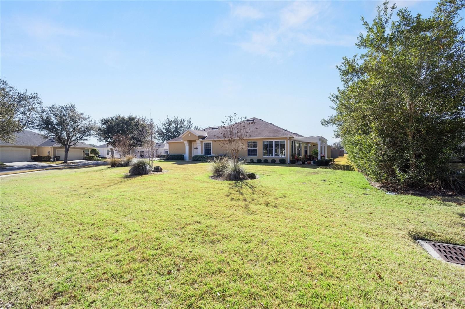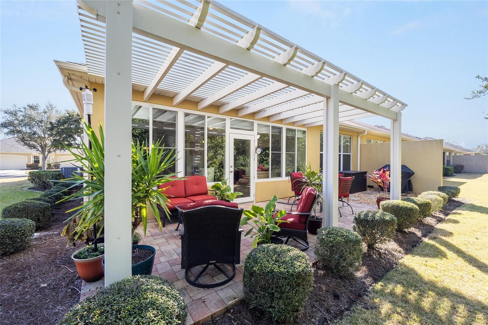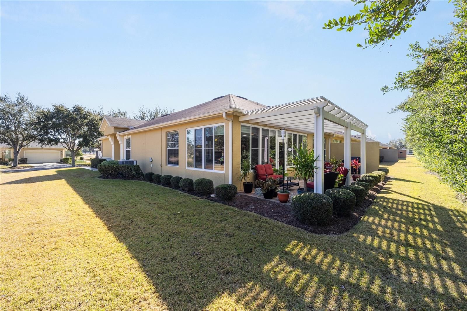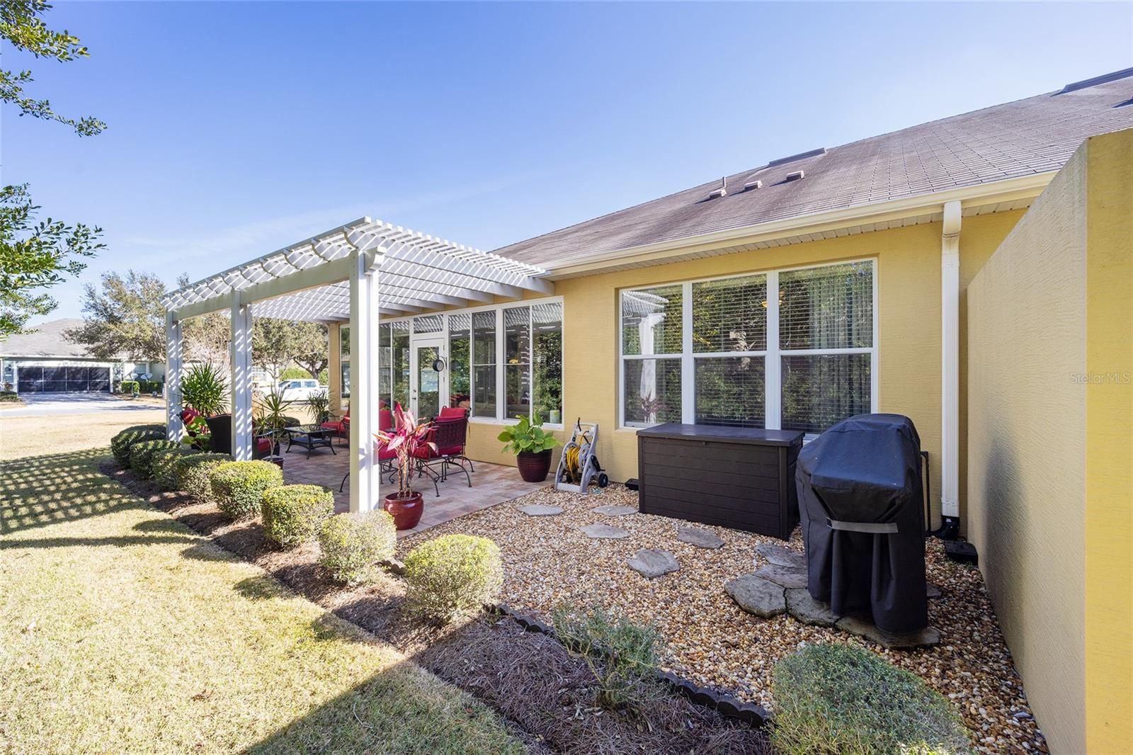 Welcome to your dream retirement oasis nestled in the tranquil and sought-after community of Stone Creek by Del Webb. Designed for comfort and convenience, this Alexander villa offers an array of features that make it exceptionally cozy and stress-free. It all starts with its impeccable corner lot location, adorned with maintenance-free mature landscaping, ensuring effortless beauty all year round. Step inside to discover a living space where elegance meets practicality. Immaculately maintained, the home boasts tile floors laid diagonally, exuding sophistication, while crown moldings and custom paint infuse warmth and character throughout. A key highlight is the thoughtfully designed four-season sunroom, a haven for relaxation featuring dual panel windows with custom shades, tiled floors, and exquisite moldings that flood the room with natural light, perfect for enjoying serene mornings or afternoon reads. The heart of this home, the kitchen, is a culinary delight. Outfitted with raised panel maple cabinets, granite countertops, and a stylish tiled backsplash, it promises both functionality and style. The kitchen is equipped stainless steel appliances, ensuring meal preparation is both efficient and enjoyable. Transitioning to the bedrooms, each space offers laminate flooring, completely carpet-free for ease of maintenance and a modern touch. You will appreciate the outdoor retreat this property offers. The rear yard beckons with a beautifully paver patio under a charming pergola, surrounded by privacy landscaping for those cherished outdoor gatherings. Enjoy the Florida weather, whether sipping your morning coffee or hosting evening barbecues, with seamless indoor-outdoor living that prioritizes your peace and relaxation. This property isn’t just a house; it’s an inviting home designed to enrich your retirement lifestyle. Experience true Florida living and create lasting memories in this great community. Schedule a viewing today and immerse yourself in the comfort and convenience that this exceptional property offers. Reach out to your real estate agent to take the first step towards making this property your new home sweet home.
