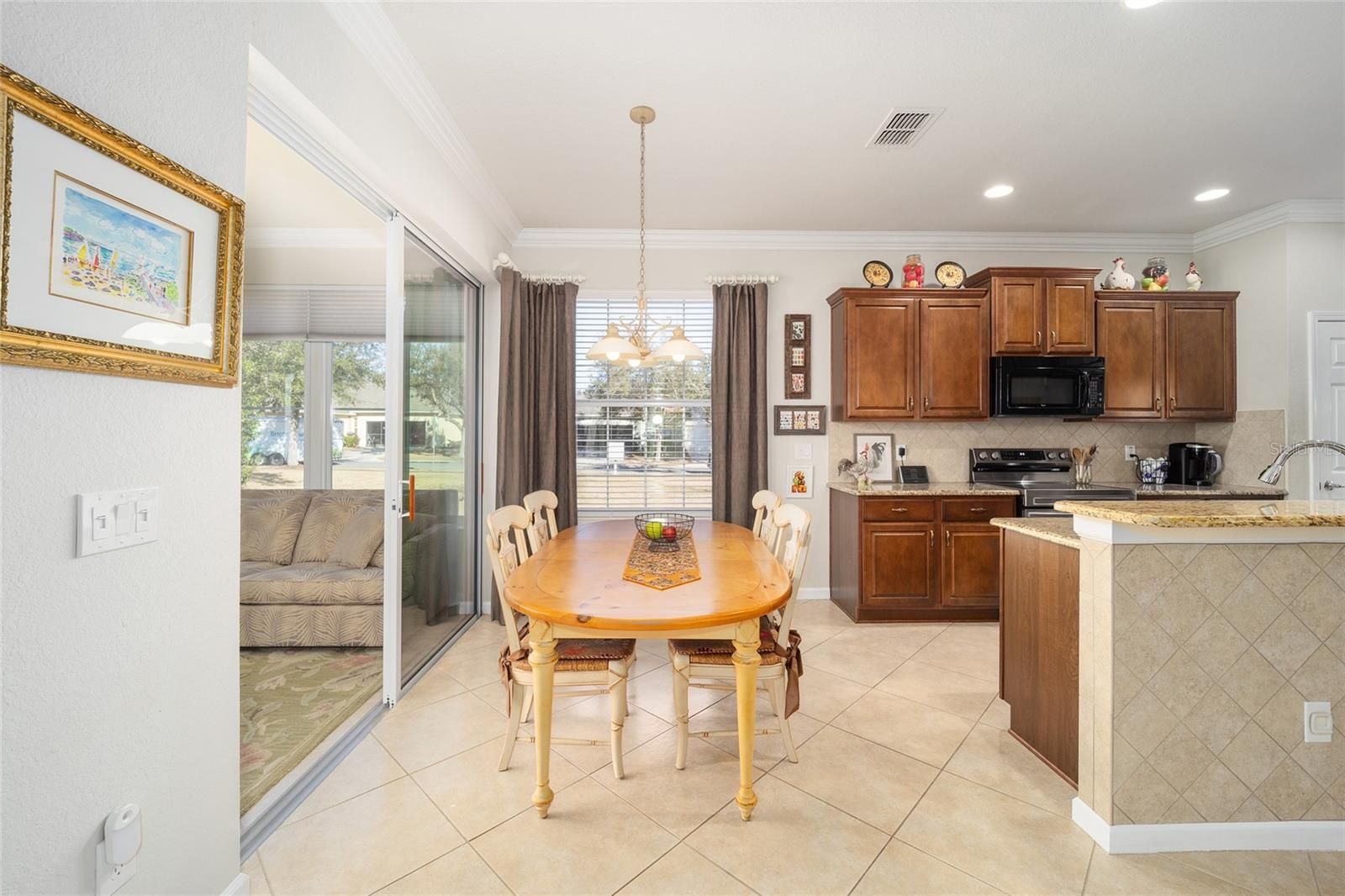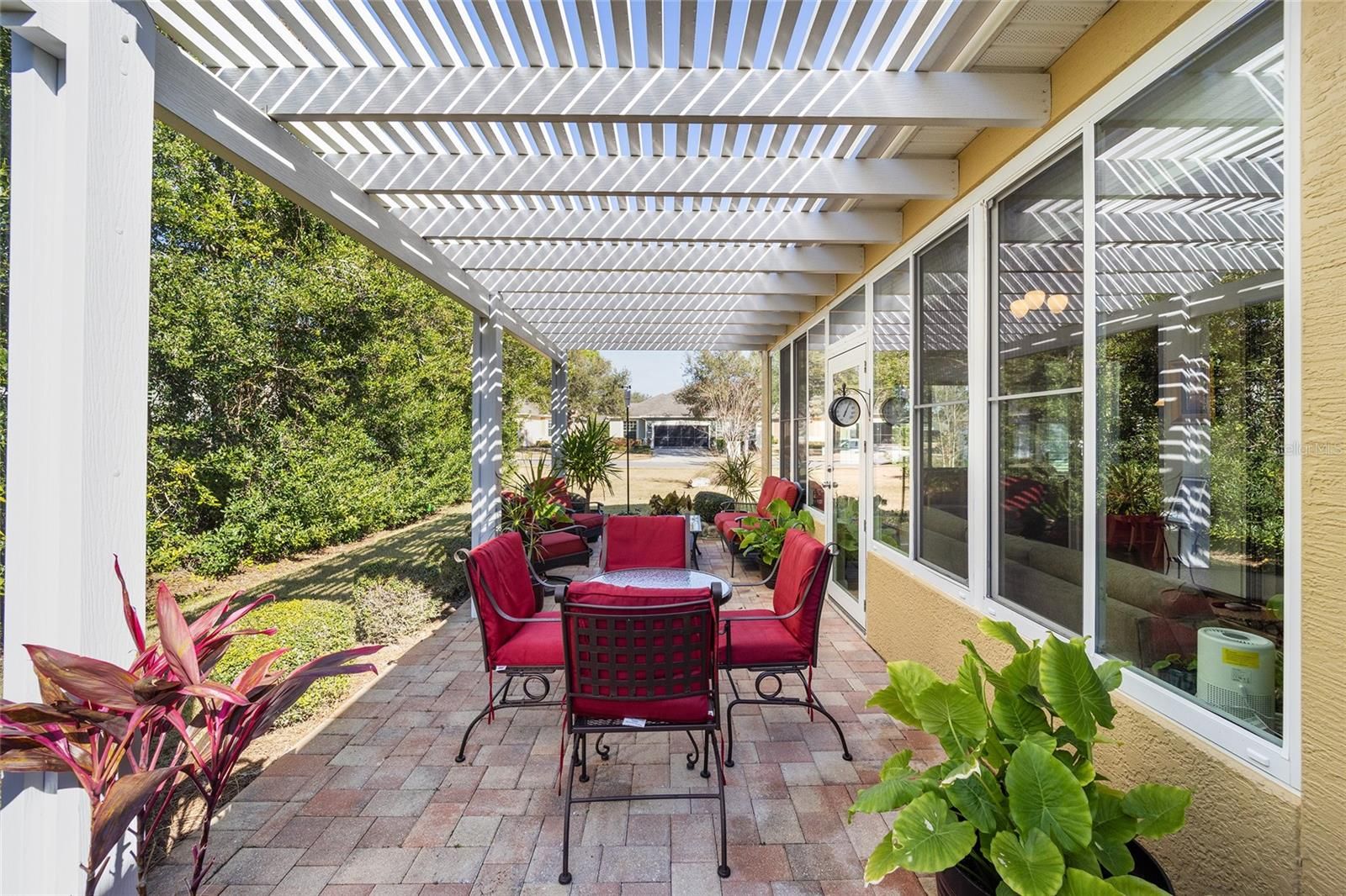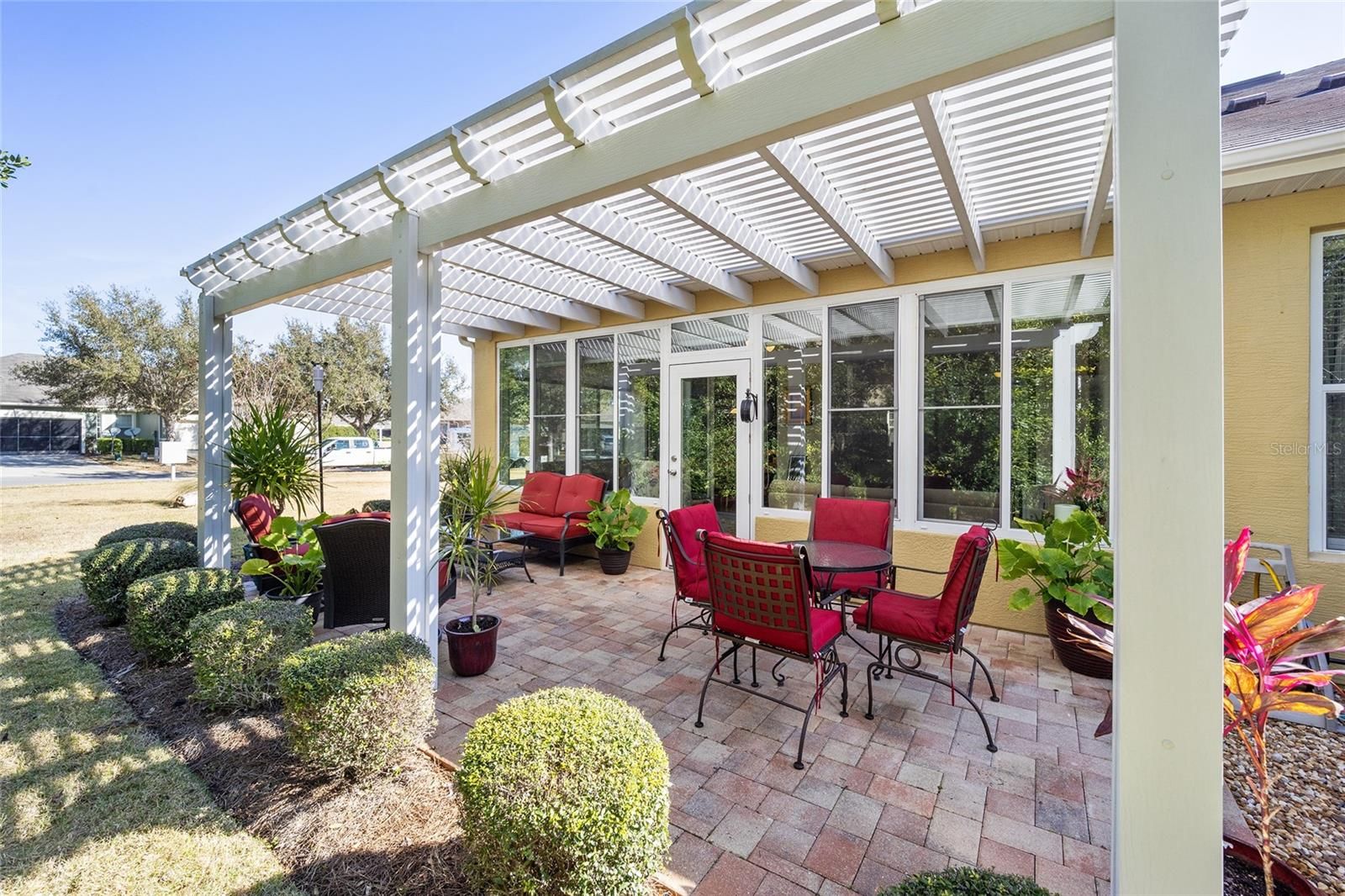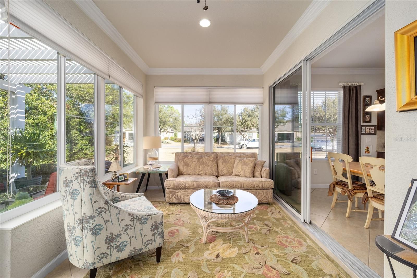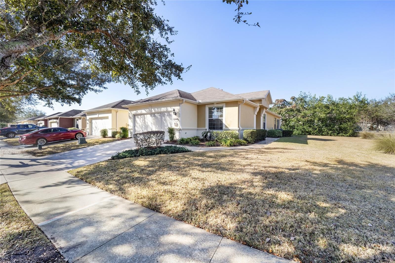 Welcome to your dream retirement oasis nestled in the tranquil and sought-after community of Stone Creek by Del Webb. Designed for comfort and convenience, this Alexander villa offers an array of features that make it exceptionally cozy and stress-free. It all starts with its impeccable corner lot location, adorned with maintenance-free mature landscaping, ensuring effortless beauty all year round. Step inside to discover a living space where elegance meets practicality. Immaculately maintained, the home boasts tile floors laid diagonally, exuding sophistication, while crown moldings and custom paint infuse warmth and character throughout. A key highlight is the thoughtfully designed four-season sunroom, a haven for relaxation featuring dual panel windows with custom shades, tiled floors, and exquisite moldings that flood the room with natural light, perfect for enjoying serene mornings or afternoon reads. The heart of this home, the kitchen, is a culinary delight. Outfitted with raised panel maple cabinets, granite countertops, and a stylish tiled backsplash, it promises both functionality and style. The kitchen is equipped stainless steel appliances, ensuring meal preparation is both efficient and enjoyable. Transitioning to the bedrooms, each space offers laminate flooring, completely carpet-free for ease of maintenance and a modern touch. You will appreciate the outdoor retreat this property offers. The rear yard beckons with a beautifully paver patio under a charming pergola, surrounded by privacy landscaping for those cherished outdoor gatherings. Enjoy the Florida weather, whether sipping your morning coffee or hosting evening barbecues, with seamless indoor-outdoor living that prioritizes your peace and relaxation. This property isn’t just a house; it’s an inviting home designed to enrich your retirement lifestyle. Experience true Florida living and create lasting memories in this great community. Schedule a viewing today and immerse yourself in the comfort and convenience that this exceptional property offers. Reach out to your real estate agent to take the first step towards making this property your new home sweet home.