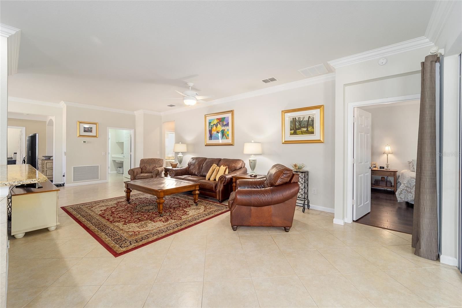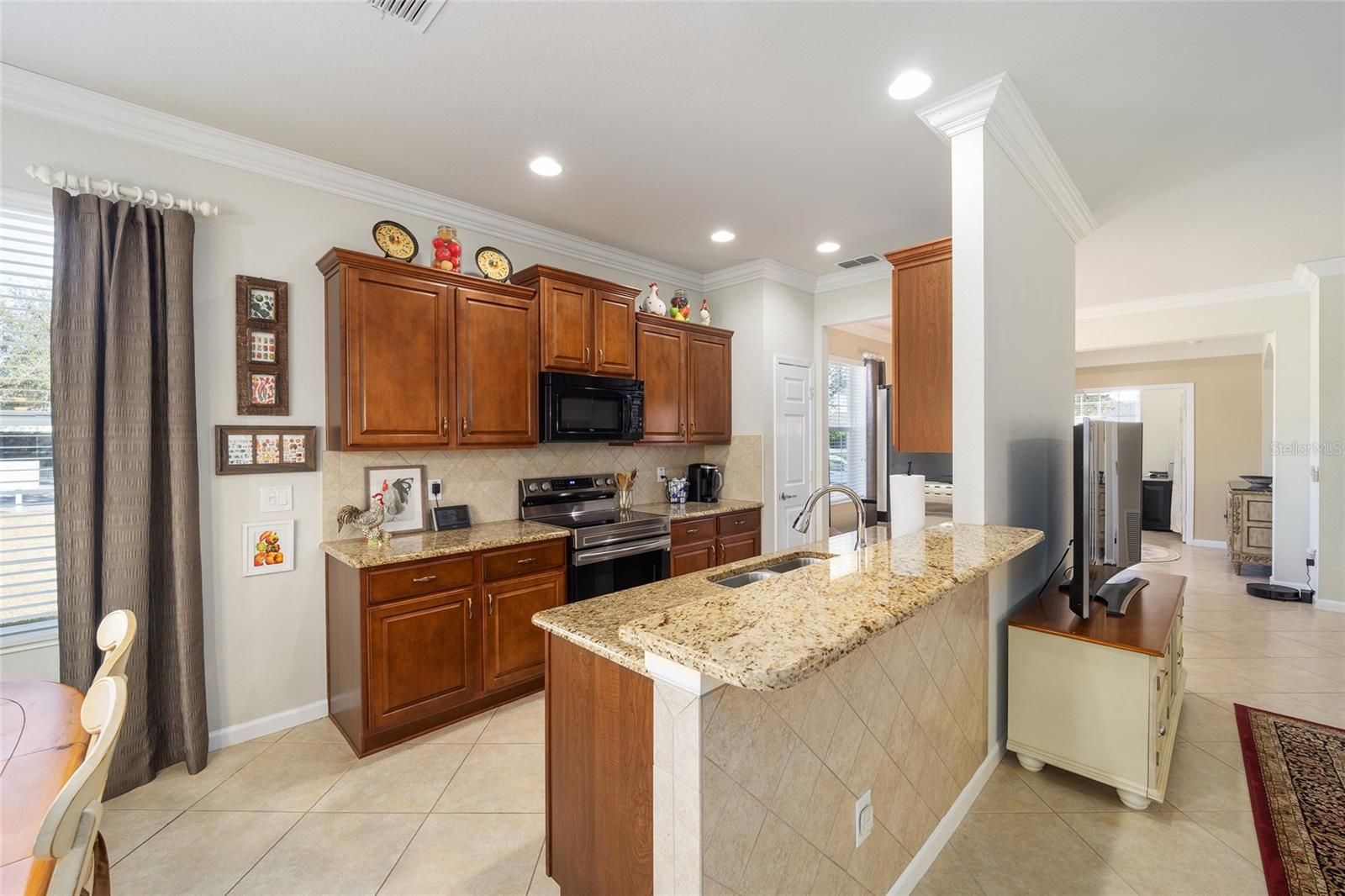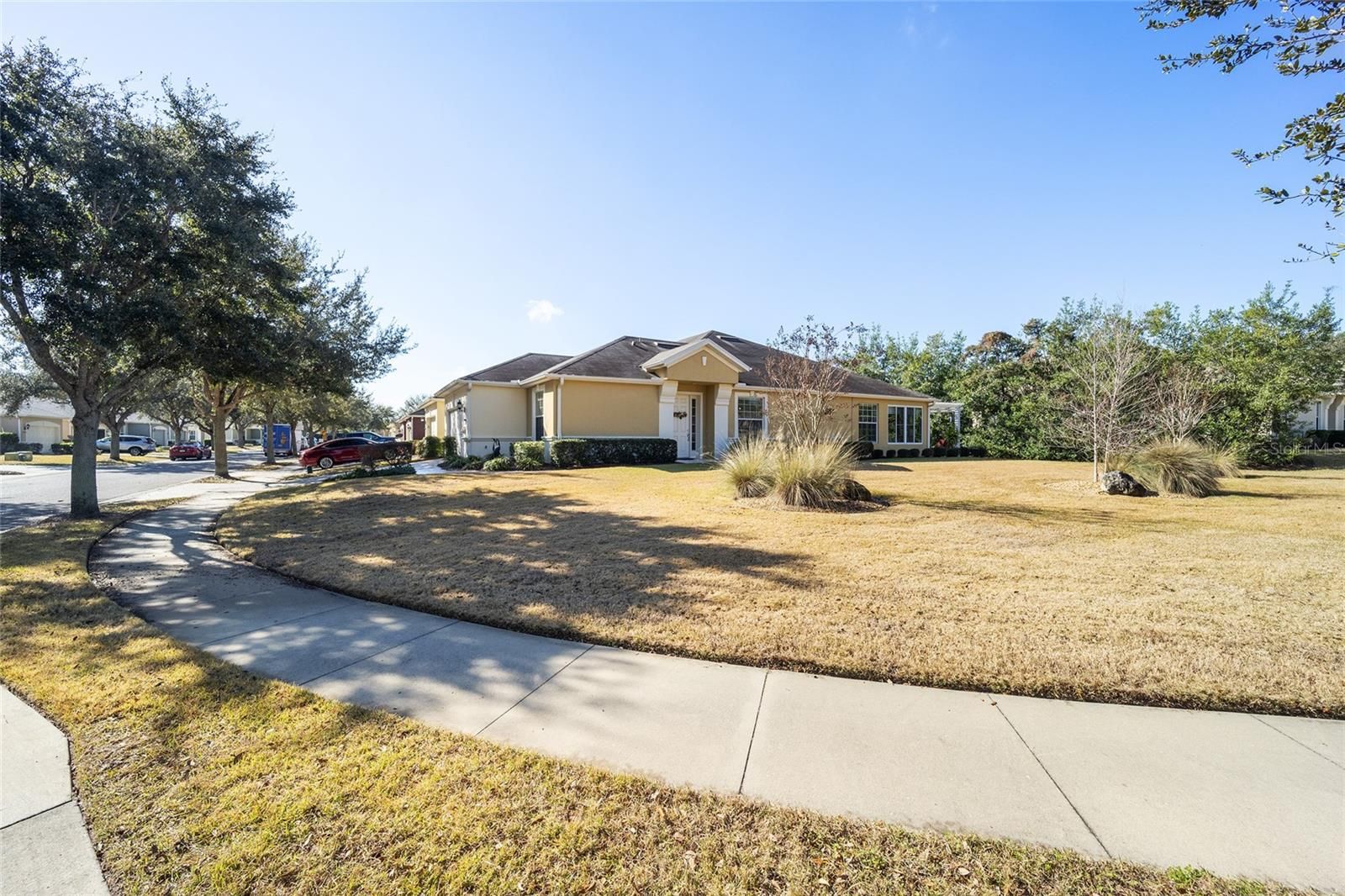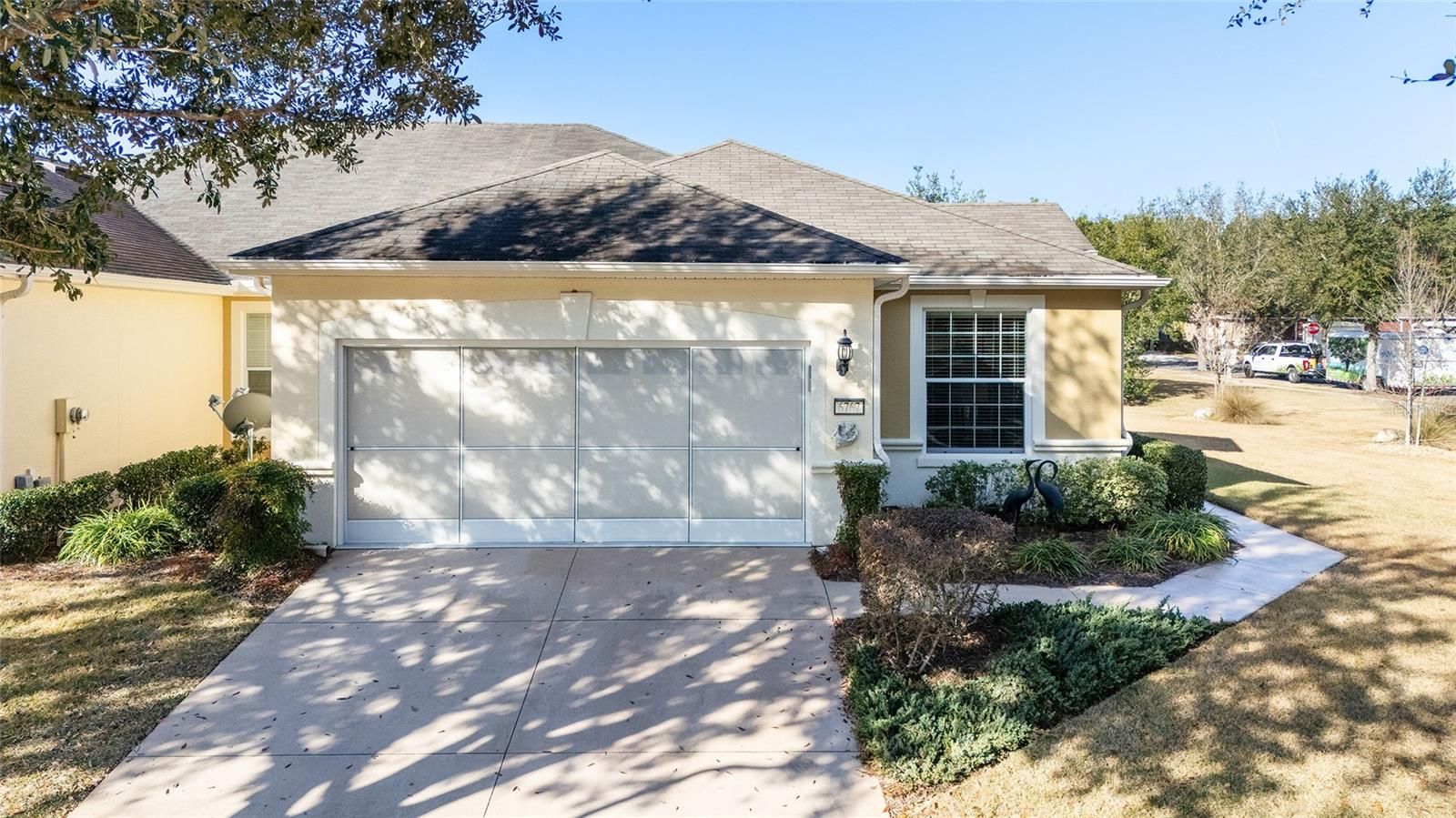 Welcome to your dream retirement oasis nestled in the tranquil and sought-after community of Stone Creek by Del Webb. Designed for comfort and convenience, this Alexander villa offers an array of features that make it exceptionally cozy and stress-free. It all starts with its impeccable corner lot location, adorned with maintenance-free mature landscaping, ensuring effortless beauty all year round. Step inside to discover a living space where elegance meets practicality. Immaculately maintained, the home boasts tile floors laid diagonally, exuding sophistication, while crown moldings and custom paint infuse warmth and character throughout. A key highlight is the thoughtfully designed four-season sunroom, a haven for relaxation featuring dual panel windows with custom shades, tiled floors, and exquisite moldings that flood the room with natural light, perfect for enjoying serene mornings or afternoon reads. The heart of this home, the kitchen, is a culinary delight. Outfitted with raised panel maple cabinets, granite countertops, and a stylish tiled backsplash, it promises both functionality and style. The kitchen is equipped stainless steel appliances, ensuring meal preparation is both efficient and enjoyable. Transitioning to the bedrooms, each space offers laminate flooring, completely carpet-free for ease of maintenance and a modern touch. You will appreciate the outdoor retreat this property offers. The rear yard beckons with a beautifully paver patio under a charming pergola, surrounded by privacy landscaping for those cherished outdoor gatherings. Enjoy the Florida weather, whether sipping your morning coffee or hosting evening barbecues, with seamless indoor-outdoor living that prioritizes your peace and relaxation. This property isn’t just a house; it’s an inviting home designed to enrich your retirement lifestyle. Experience true Florida living and create lasting memories in this great community. Schedule a viewing today and immerse yourself in the comfort and convenience that this exceptional property offers. Reach out to your real estate agent to take the first step towards making this property your new home sweet home.
