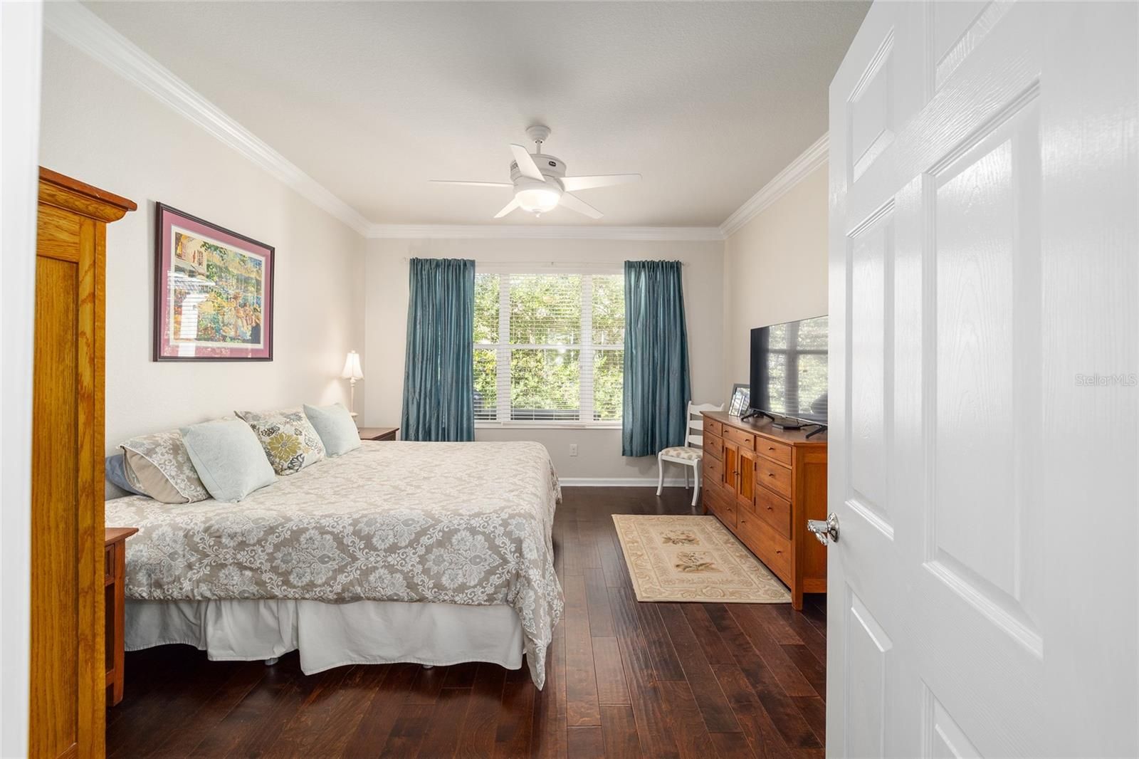 - Ceiling Fan(s), Crown Molding, Eat-in Kitchen, High Ceilings, Kitchen/Family Room Combo, Open Floorplan, Main Level Primary, Split Bedrooms, Stone Counters, Thermostat, Walk-In Closet(s), Window Treatments