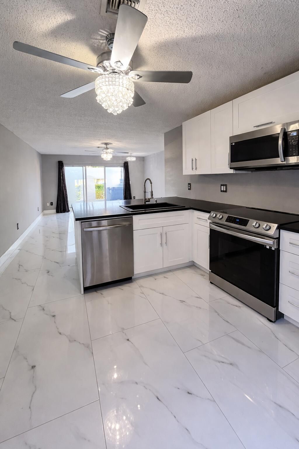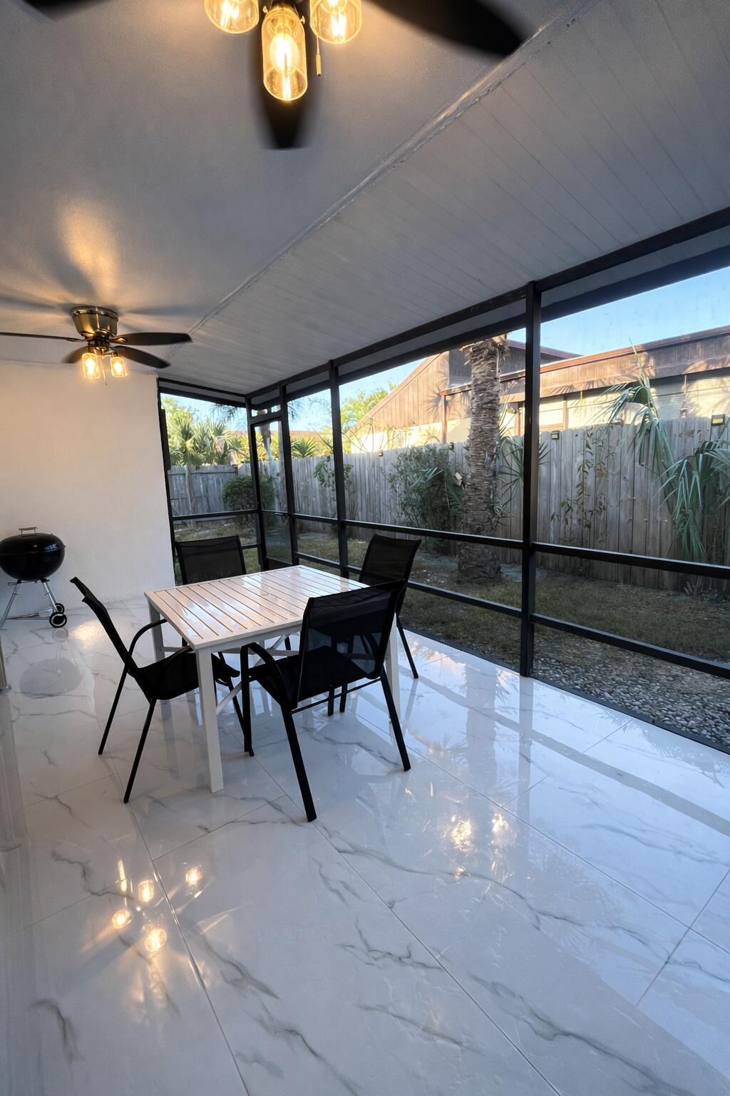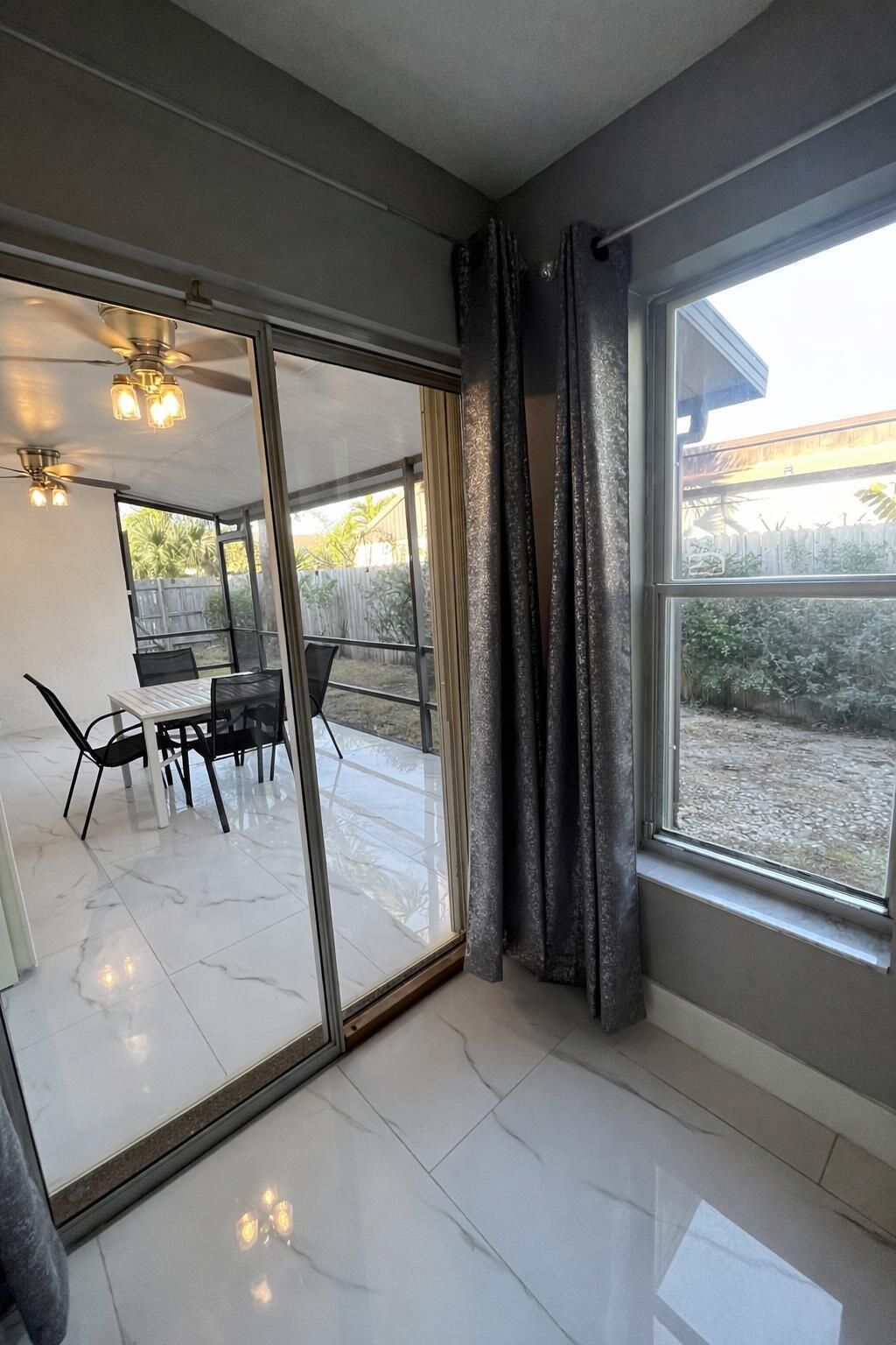 Welcome home! Fully renovated luxury patio home stands far above dated originals in the community. Bright open concept with upscale finishes throughout. Stunning 48'' porcelain tile, dream kitchen with black marble countertops and top-of-the-line appliances. Designer vanities, custom lighting upgraded molding & fresh interior/exterior paint, new shingle roof 2024 hurricane accordion shutters 2024. skylights pull-down attic stairs to oversized storage, atrium screened veranda private fenced backyard & patio, garage Resort-style community with 18-hole executive golf pay-as-play tennis pickleball bocce shuffleboard clubhouse theater fitness center sauna heated pools billiards library restaurant yoga Zumba & MORE WIFI TV LAWN INCLUDED Florida living at its finest. Turn-key & move in ready