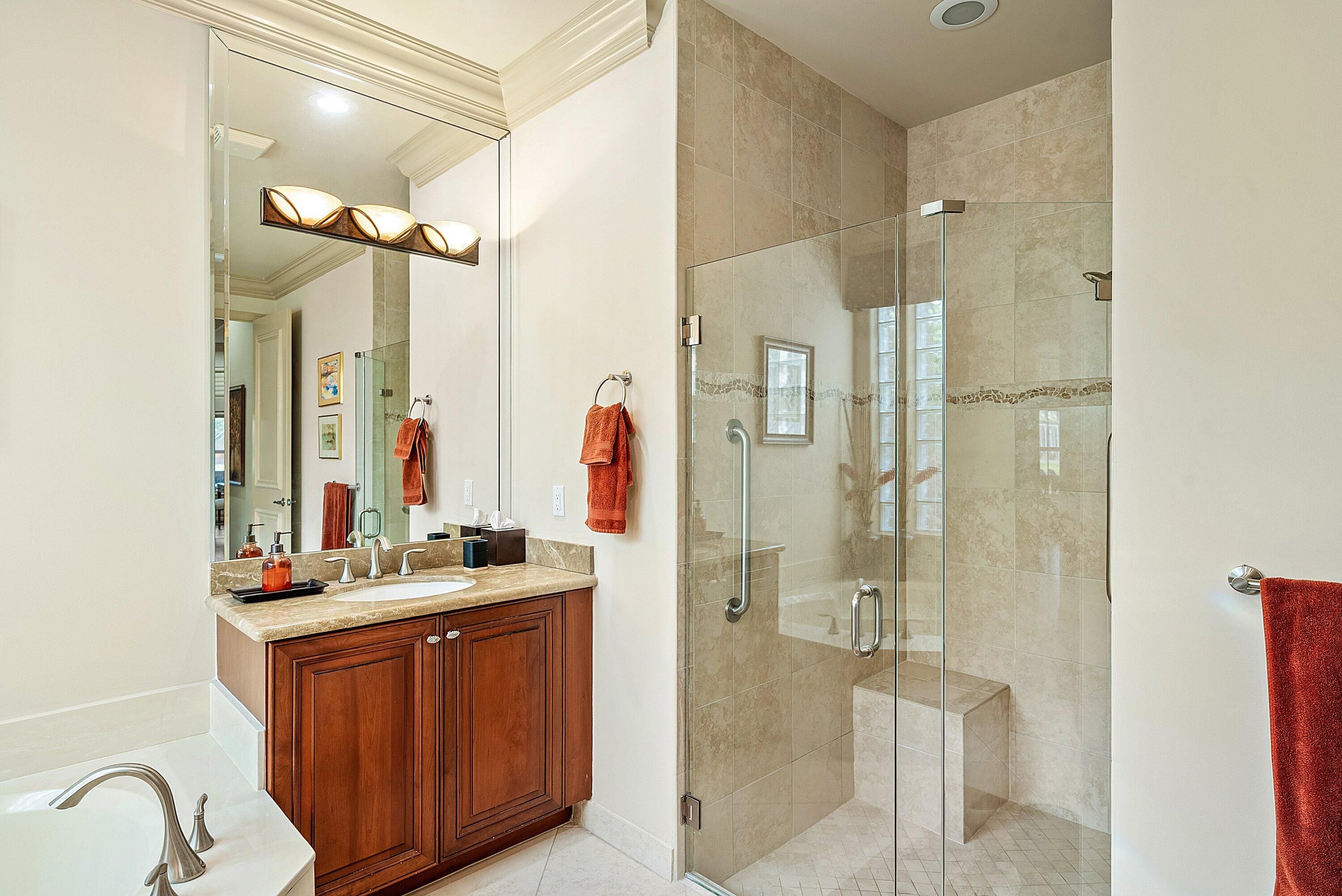 - Garden Tub/Roman Tub, Split Bedrooms, High Ceilings, Walk-In Closet(s), Home Office, Family Room, Breakfast Area, Separate/Formal Dining Room, Blinds, Plantation Shutters, Dual Sinks, Primary Downstairs, Separate Shower, Bathtub, Storm Shutters