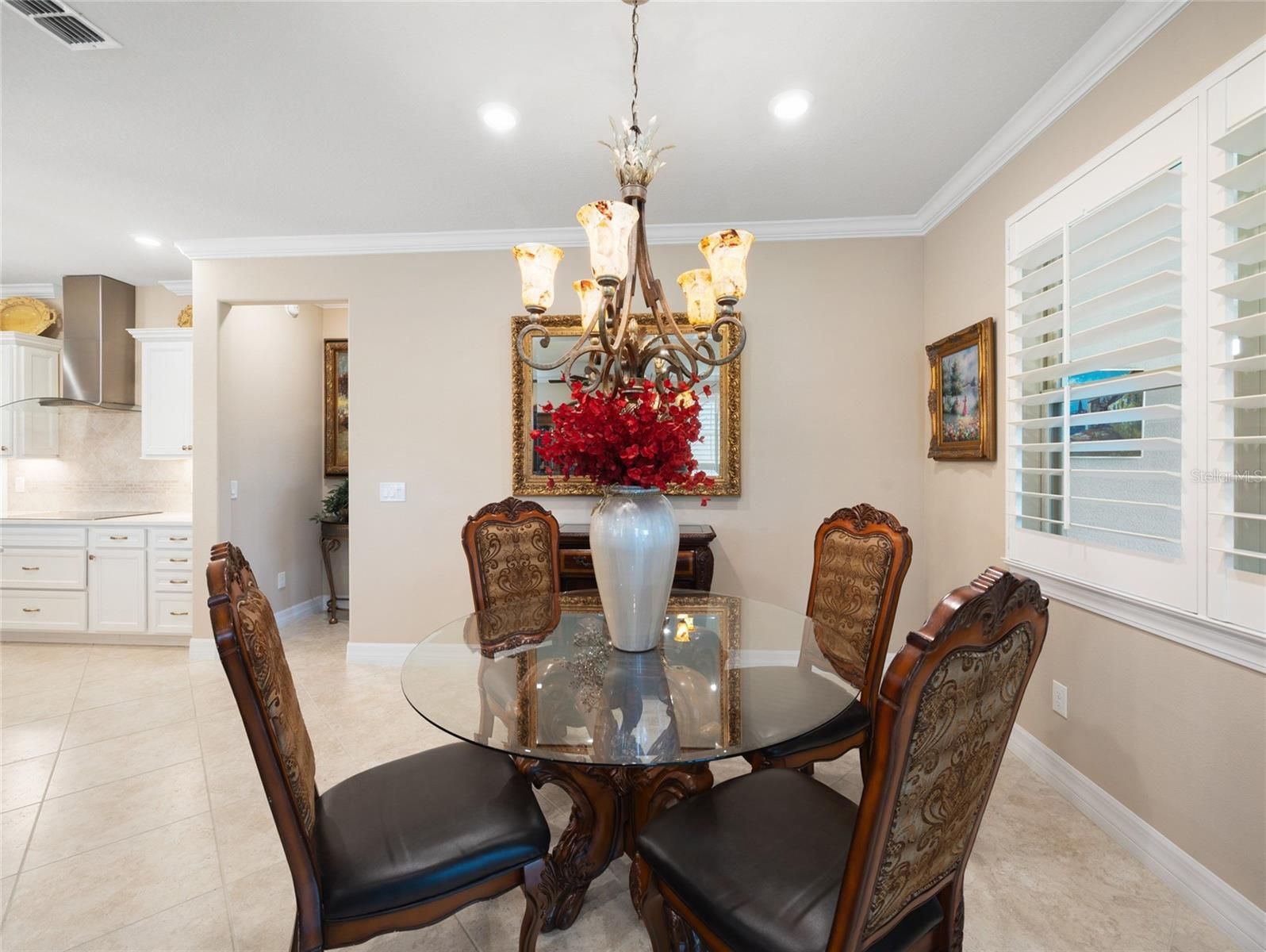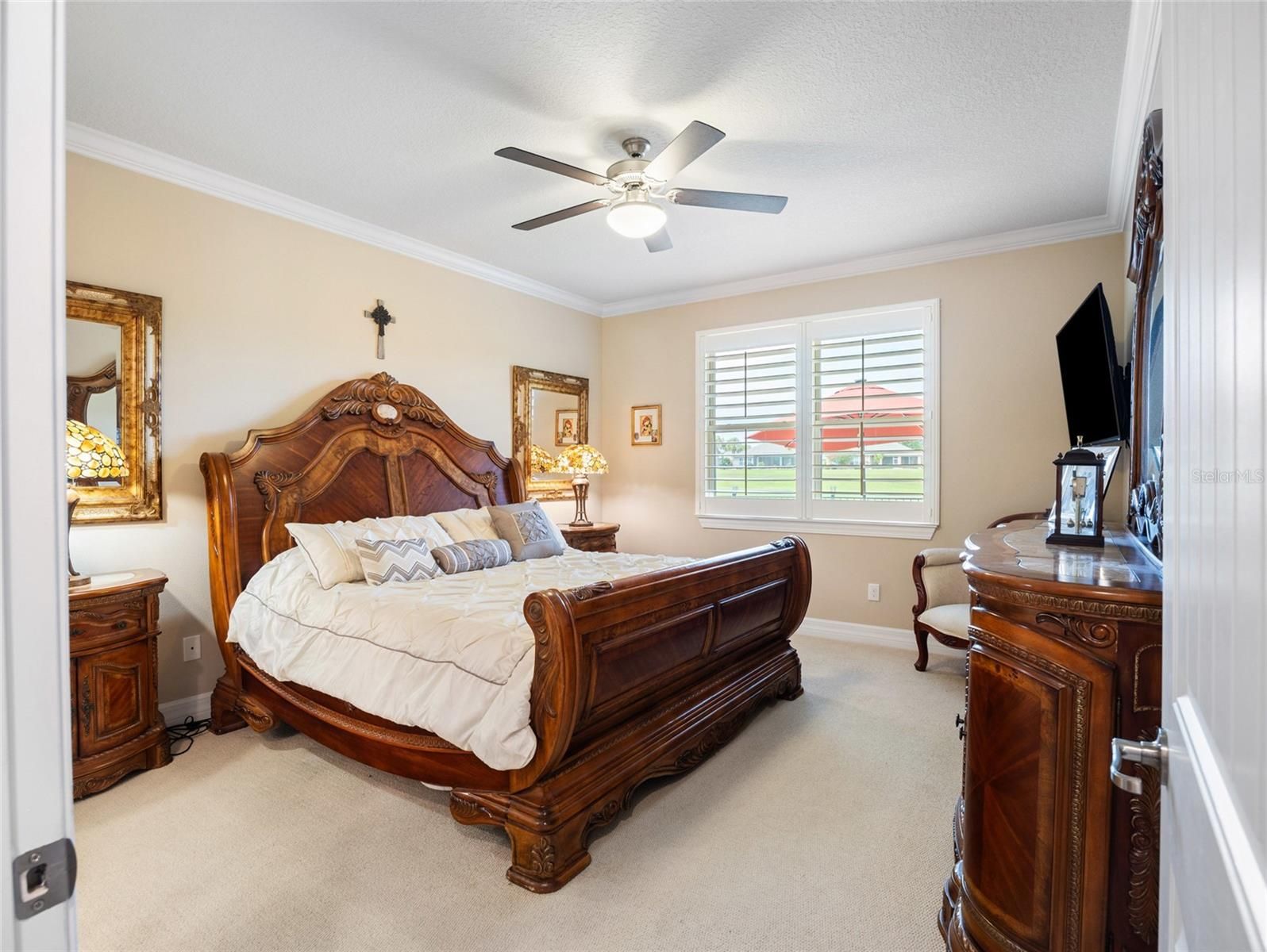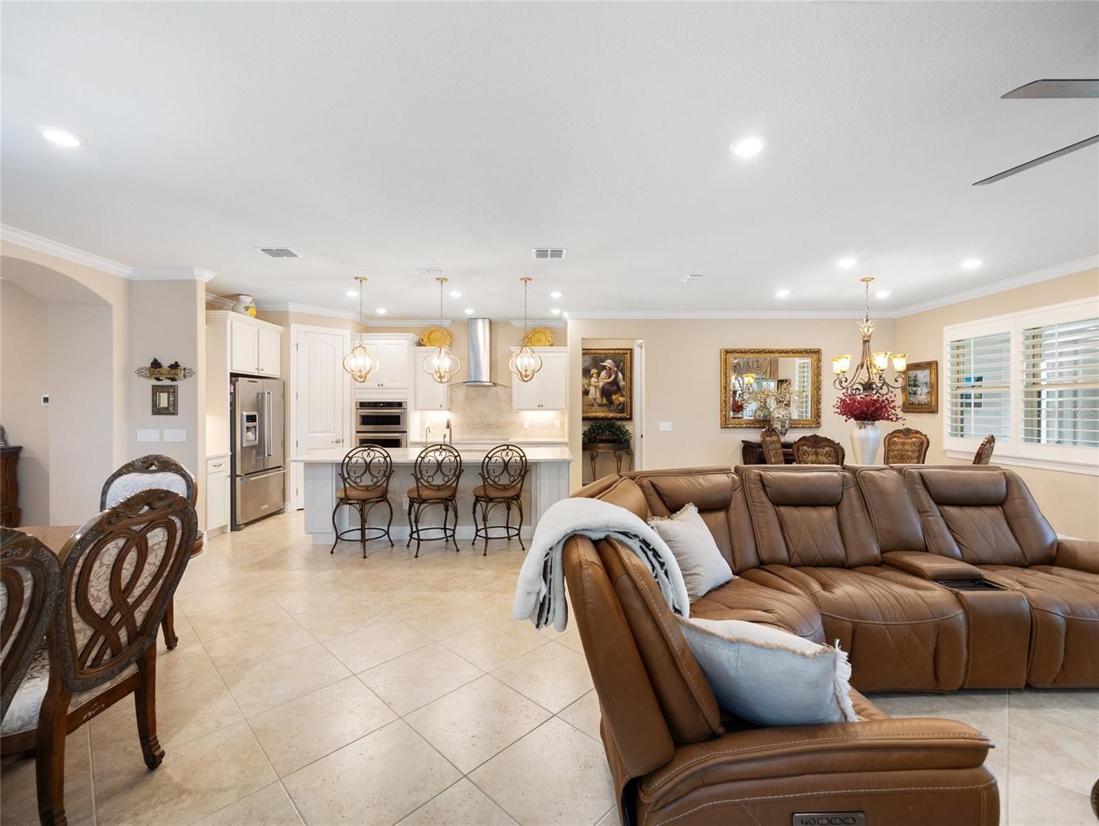 - Ceiling Fan(s), Crown Molding, Eat-in Kitchen, High Ceilings, Kitchen/Family Room Combo, Living/Dining Room, Open Floorplan, Main Level Primary, Thermostat, Walk-In Closet(s), Window Treatments