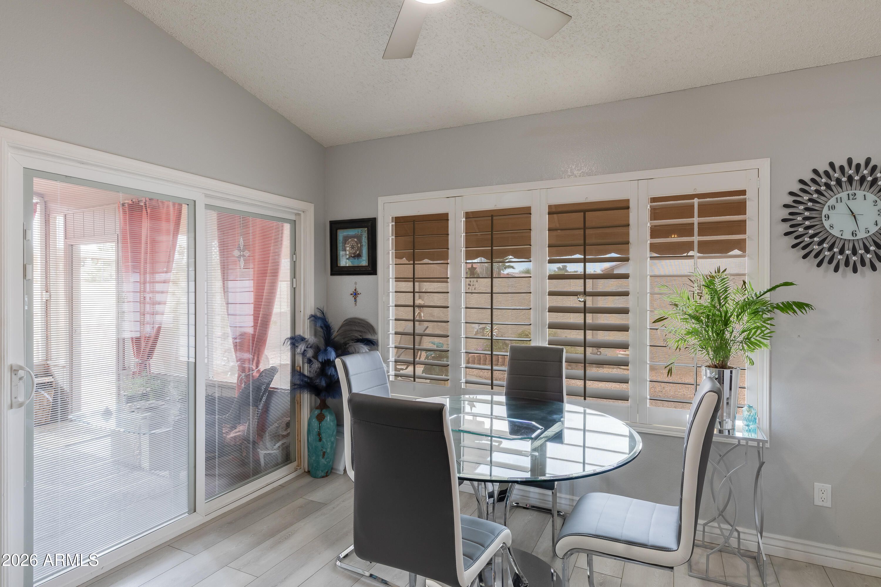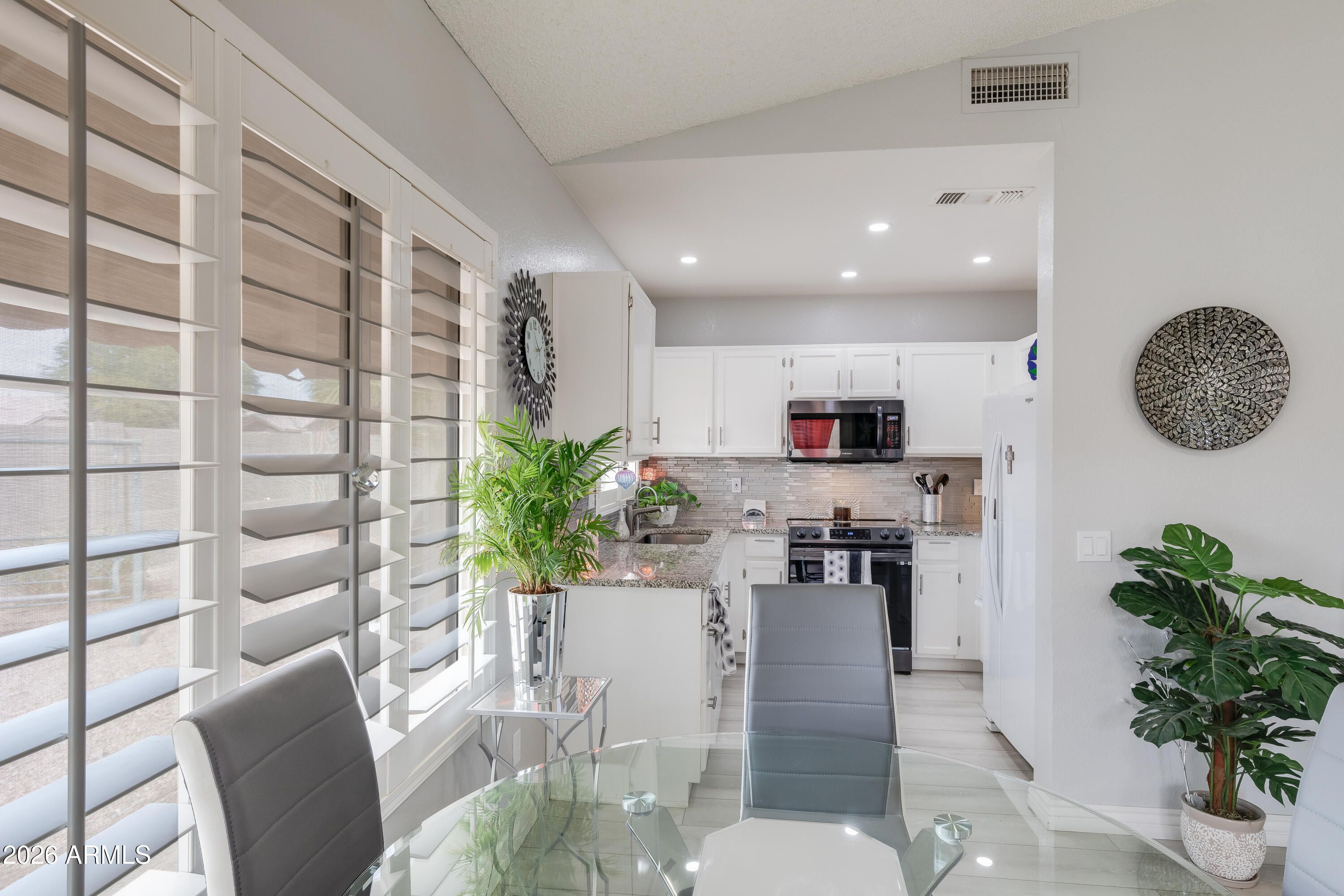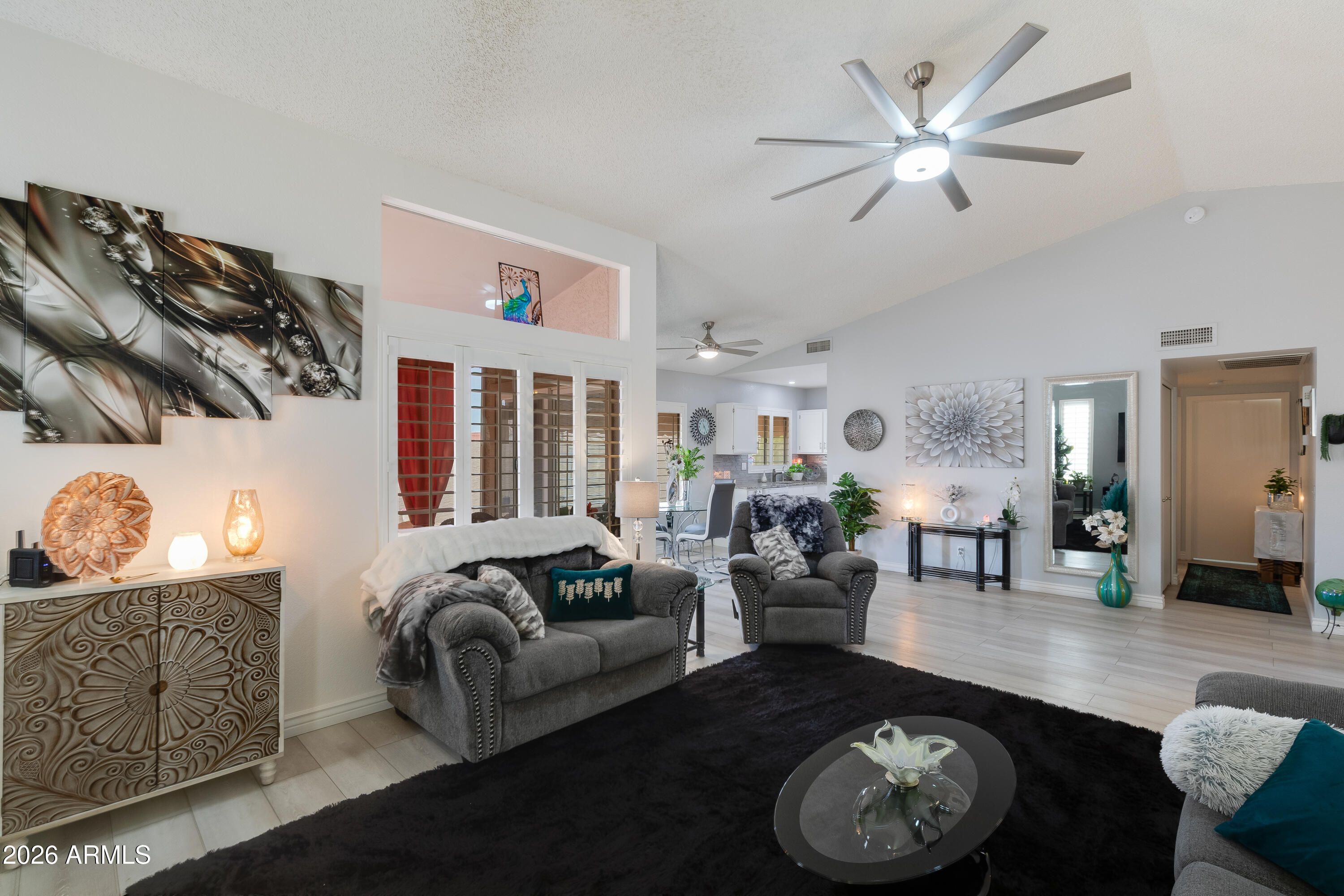 Exquisite 2BR/2BA Catalina model in the popular 55+ Sunbird Golf Community. Open floor plan, beautifully updated with fresh paint inside/out, shutters & LVP flooring/baseboards throughout. Updated white kitchen cabinets with attractive hardware, beautiful granite countertops and decorative tile backsplash finishes off this tastefully decorated home. Arizona room just off dining area opens to a covered patio and a private backyard that is fully enclosed with no neighbors behind. This home has a new roof, newer HVAC unit and hot water tank with home furnishings available; it truly is move-in ready. Sunbird amenities Clubhouse, Horizon Room restaurant & spirits, two pools, library, pool tables, cards, lapidary, ceramics, bocci ball, pickleball, tennis, post office & many more activities