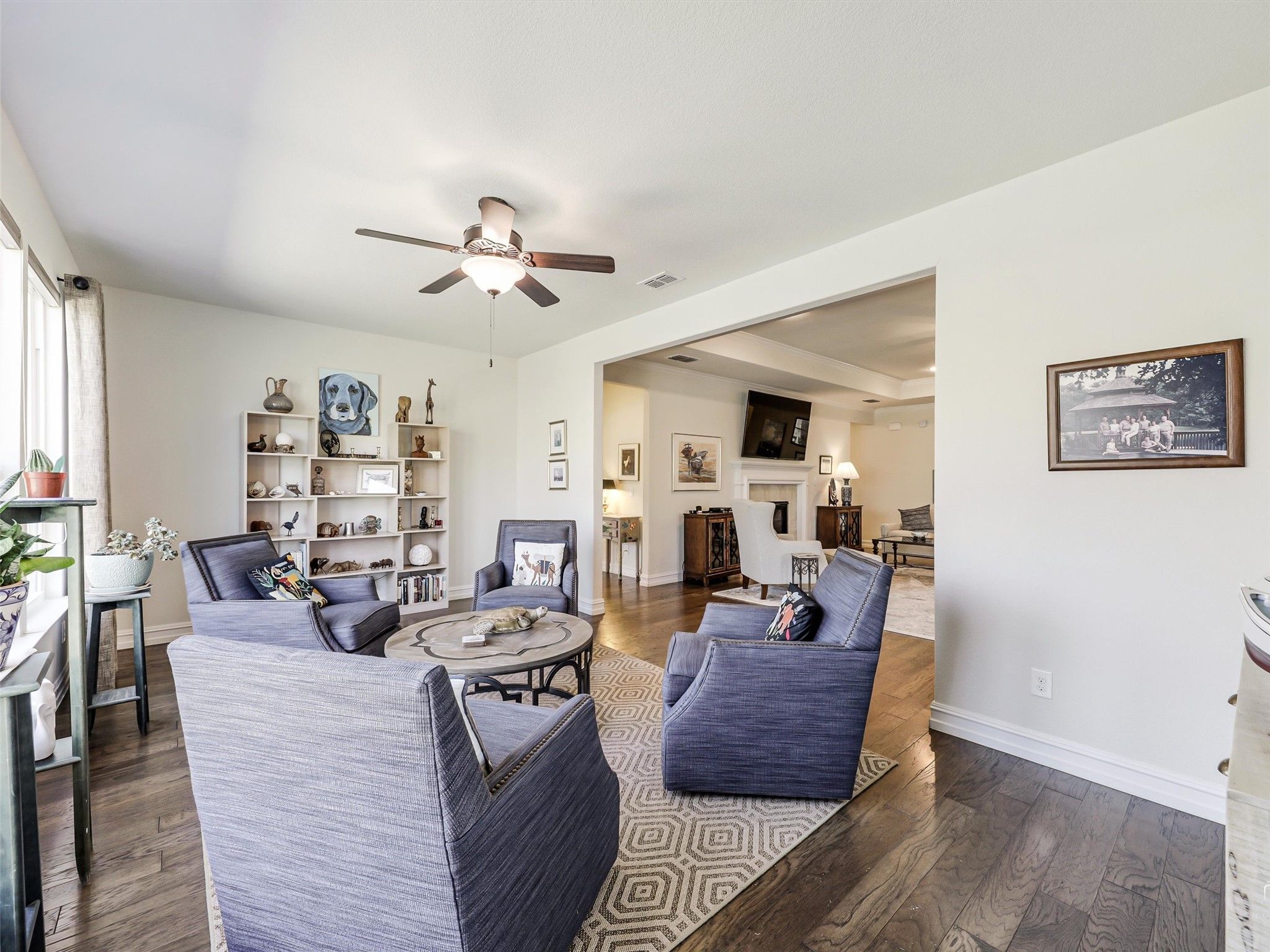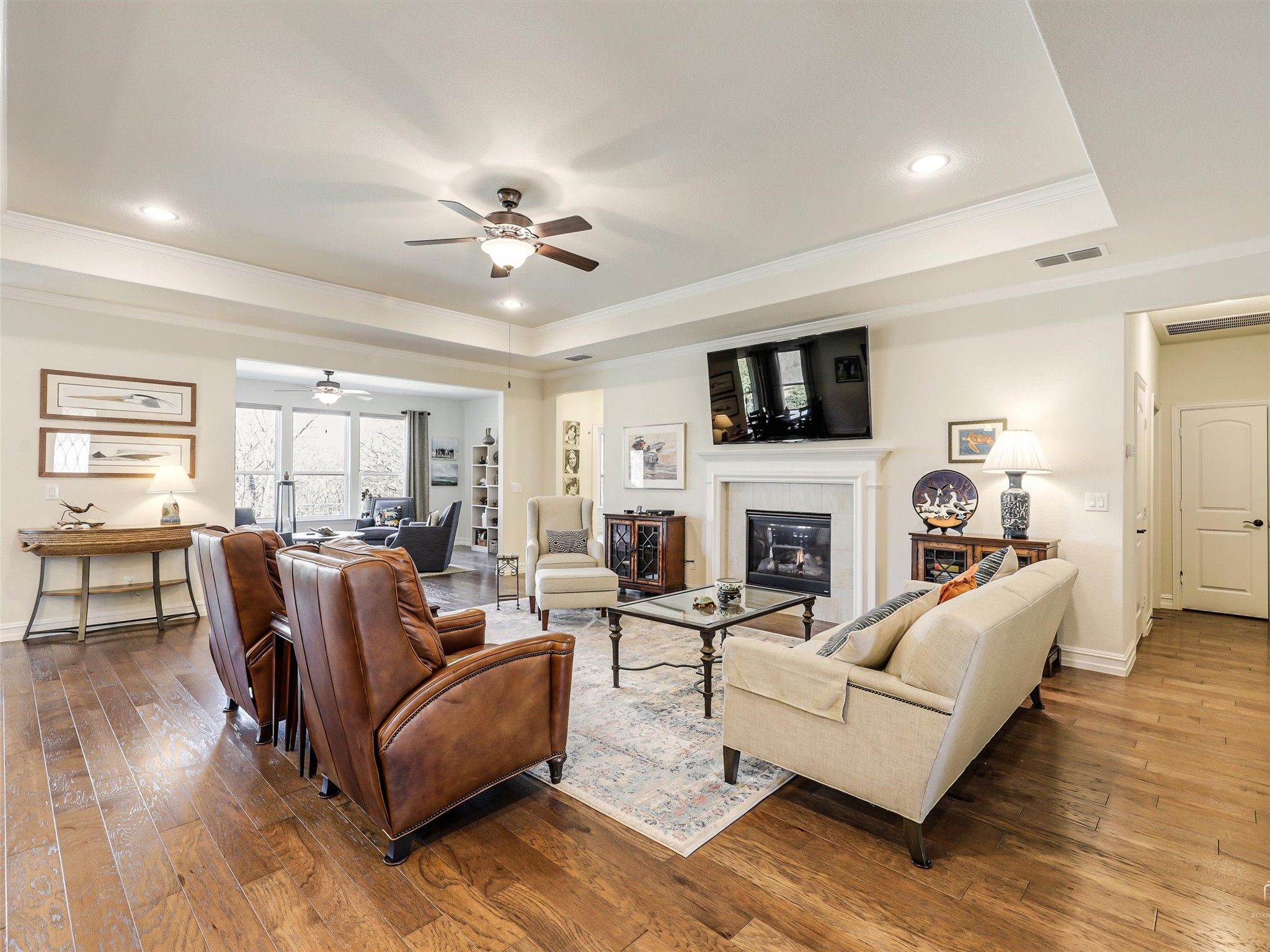 Enjoy views of greenspace and the golf course from this open Magnolia Plan. Two bedrooms with a generous study, and plenty of natural light throughout this lovely home. The home offers ample storage, a single-level kitchen island, drop in gas cooktop, pull-out drawers in the lower kitchen cabinets. Neutral colors compliment the light wood flooring. The gas log fireplace is great for the cooler nights. Rooms include ceiling fans, crown molding and trayed ceilings in the living and primary bedroom. Window treatments stay; some furniture and appliances are negotiable. A huge oversized utility has room for an extra refrigerator or freezer. The tandem three-car garage provides extra storage for a golf cart or workbench. The east-facing patio overlooks green space and the golf course. Frisco Lakes amenities include multiple pools, fitness centers, tennis and pickleball courts, walking trails, an active social calendar, and a golf club restaurant. This is your chance to enjoy resort-style living at Frisco Lakes! Showings start Saturday March 21 at 2:00pm.