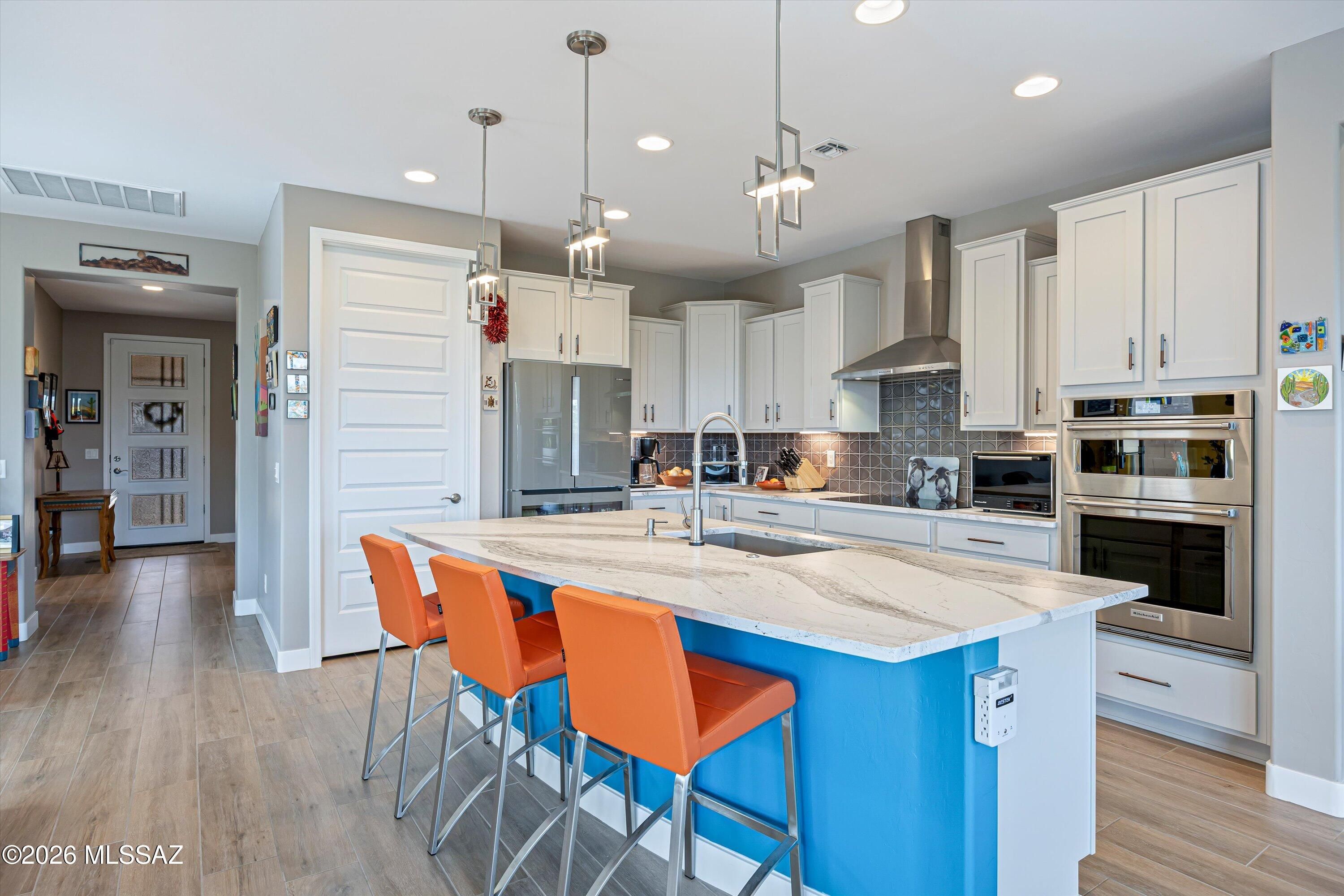 Welcome to this delightful Sanctuary floor plan offering 1,833 sq ft, with two bedrooms, two baths, and a versatile den, nestled on a cul-de-sac lot. A gated patio invites you into a bright and airy home showcasing an open-concept design that seamlessly connects the all-capturing natural desert from outside. The kitchen is anchored by grey cabinetry, quartz countertops, stainless steel appliances, an induction cooktop with a custom subway tiled backsplash offering style and functionality. The primary suite features a bay window, dual vanities, step-in shower with a walk-in closet. A guest bedroom and nearby full bath provides comfort for visitors, while the den offers another flexible space. Laundry is conveniently inside, and the oversized two-car garage features epoxy coated flooring.