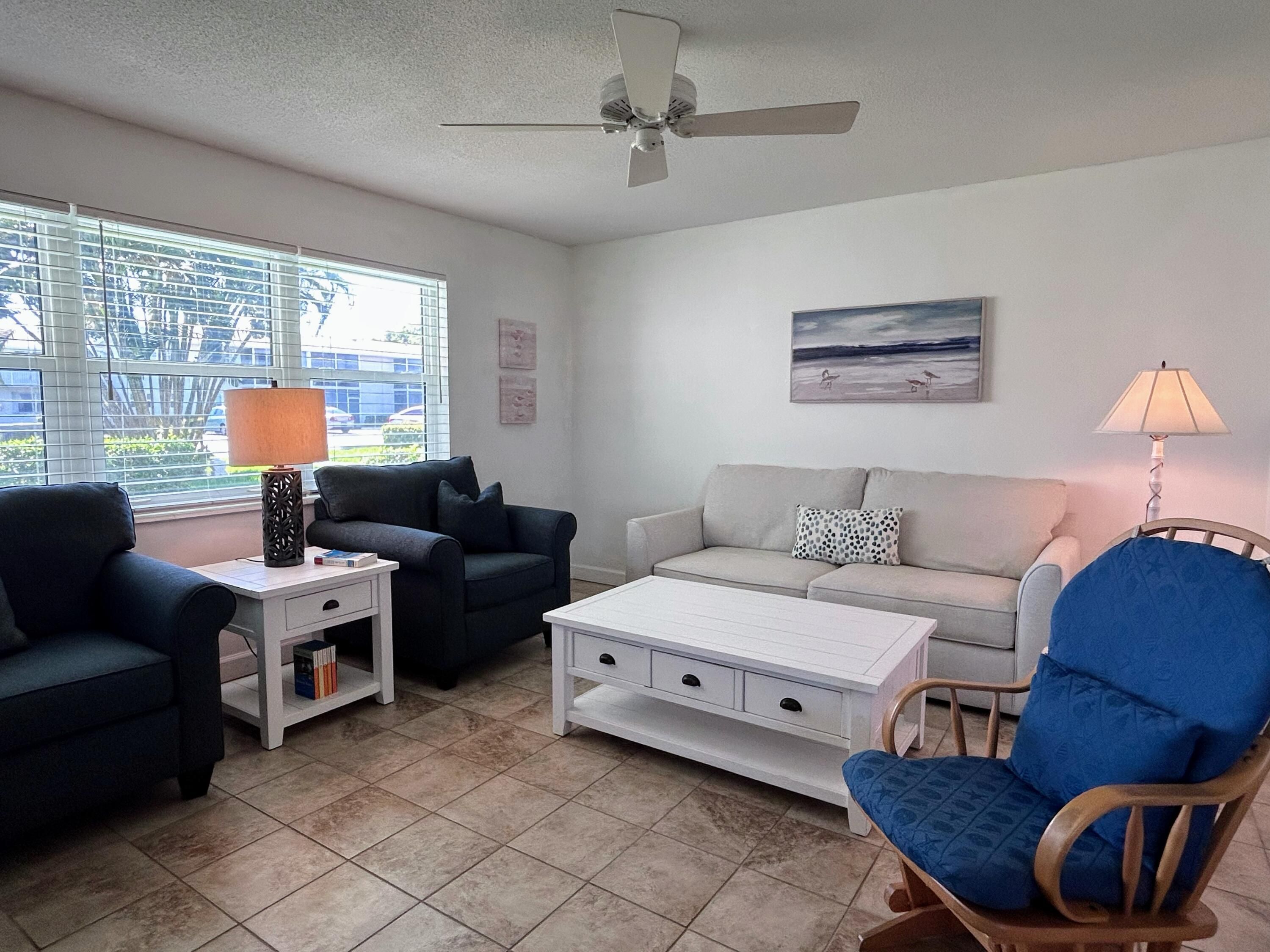 SWEET FIRST FLOOR CONDO IN POPULAR 55+ STERLING VILLAGE COMMUNITY. 1/1.5 END UNIT HAS EXTRA WINDOWS FOR SUNSHINE & OCEAN BREEZES. HURRICANE IMPACT WINDOWS & LANAI SLIDER ELIMINATE NEED FOR OTHER SHUTTER PROTECTION. SOME OF RECENT UPGRADES INCLUDE ELECTRIC PANEL, CEILING FANS, WIDE BLINDS ON ALL WINDOWS, TALL VANITIES, TOILETS & WALK IN SHOWER INSTEAD OF TUB. ADDED IN KITCHEN WERE WHITE SHAKER CABINETS, WHITE SUBWAY TILE, GARBAGE DISPOSAL, & SS FRENCH DOOR/BOTTOM FREEZER FRIDGE W/ ICE MAKER. KITCHEN ALSO HAS BUILT IN MICROWAVE. LUXURY VINYL PLANK FLOORING & CERAMIC TILE THRUOUT. FRESHLY PAINTED, AC IS 5 YRS OLD & NEW FURNITURE IN LR INCLUDES QUEEN SLEEPER SOFA & KING BED IN BR. LANAI HAS NICE GARDEN VIEWS INSTEAD OF PARKING LOT & HAS DOOR FOR .... (SEE PG 2)..... MORE ACCESS TO OUTSIDE. UPGRADED LAUNDRY (1 OF 3 IN COMMUNITY) IS STEPS AWAY. OR WASHER & DRYER CAN ALSO BE ADDED TO CONDO NOW W/ PROPER APPROVAL. STERLING VILLAGE IS A SNOWBIRD HAVEN IN WINTER W/ NUMEROUS CLUBS & ACTIVITIES TO JOIN. MODERN CLUBHOUSE RENOVATION IS NOW COMPLETE W/ WONDERFUL ADDITIONS OF FITNESS CENTER (W/ EQUIPMENT GEARED TOWARD 55+), 24 HR MAIN LAUNDRY, EXPANDED LIBRARY & GAME ROOMS, HEATED POOL, ETC. ALSO ADDED THIS YR: INTERNET IN ALL CONDOS (INCLUDED IN HOA FEES), CAR WASH AREA, PICKLEBALL COURTS & COMPLETELY GATED FOR EXTRA SECURITY. ONE OF THE MOST POPULAR AREAS ON THE PROPERTY IS THE 1/2 MI RAILED PROMENADE ON THE INTRACOASTAL. WONDERFUL FOR WALKING, FISHING (NO FL LICENSE NEEDED) OR RELAXING ON A BENCH. EVEN HAS STREETLIGHTS FOR EVENING STROLLS. LOCATION OF THE VILLAGE IS ONLY A BLOCK FROM BOYNTON MARINA W/ WATERFRONT RESTUARANTS, BOATS CHARTERS & JET SKI/PADDLEBOARD RENTALS. ALSO EASY WALK OR BIKE RIDE ACROSS DRAWBRIDGE TO OCEANFRONT PARK, DIRECTLY ON THE ATLANTIC OCEAN. PUBLIX, WALGREENS, MULTIPLE BANKS, DOCTORS, HOSPITAL, ETC ALL UNDER 2 MI. PALM BEACH INTERNATIONAL AIRPORT (PBI) ONLY 11 MI FROM VILLAGE. MAKE AN APPT TO VIEW TODAY OR CALL AGENT FOR ADDITIONAL INFO! GREAT PLACE TO CALL HOME IN SUNNY SOUTH FLORIDA!
