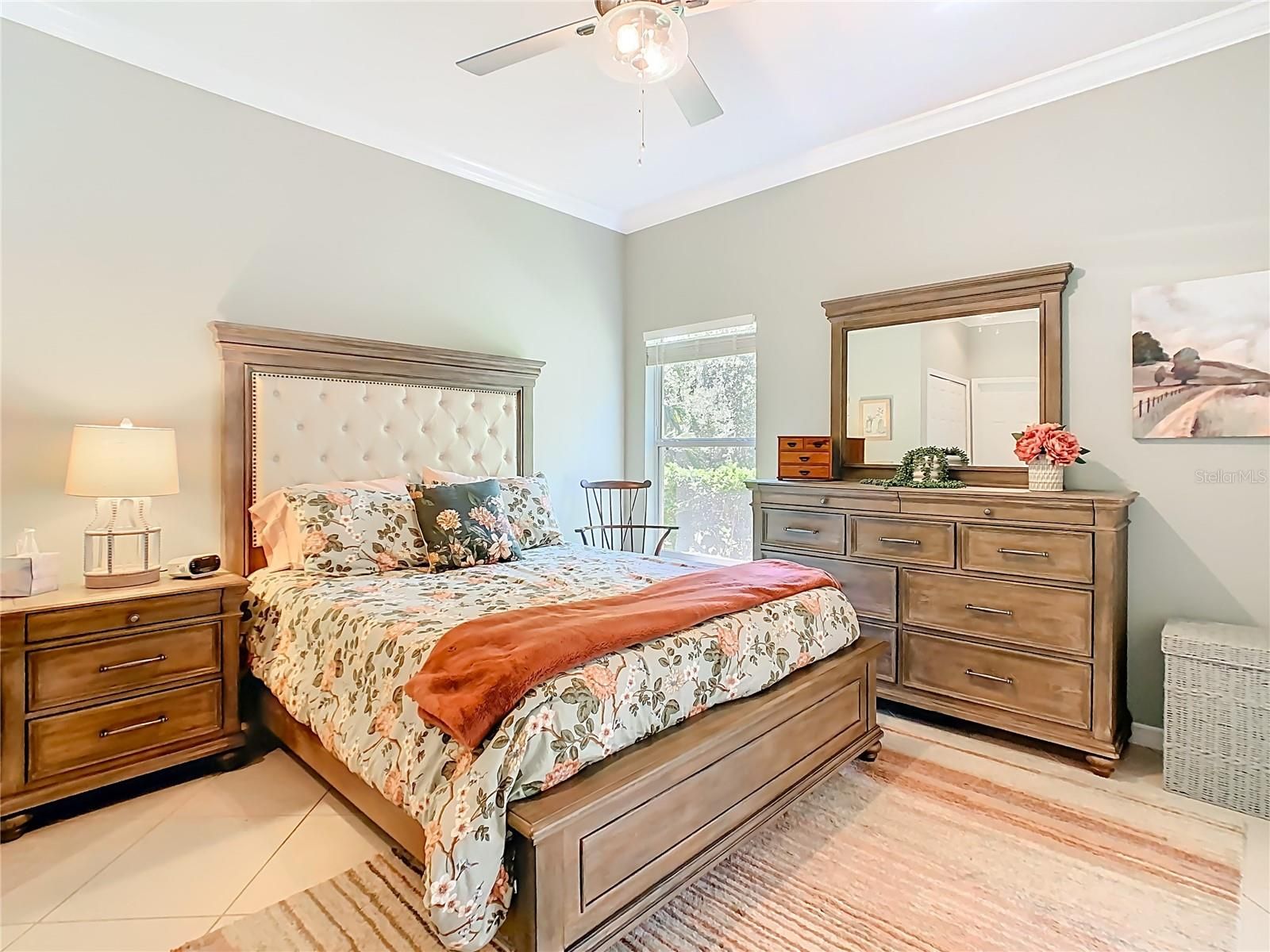 - Ceiling Fan(s), Crown Molding, Eat-in Kitchen, High Ceilings, Open Floorplan, Solid Surface Counters, Split Bedrooms, Thermostat, Walk-In Closet(s), Window Treatments