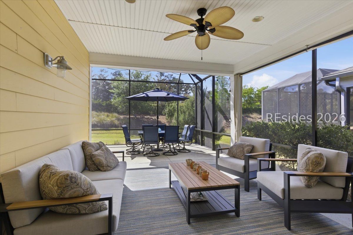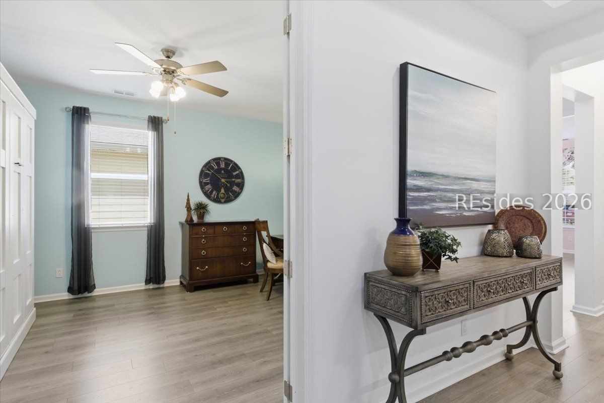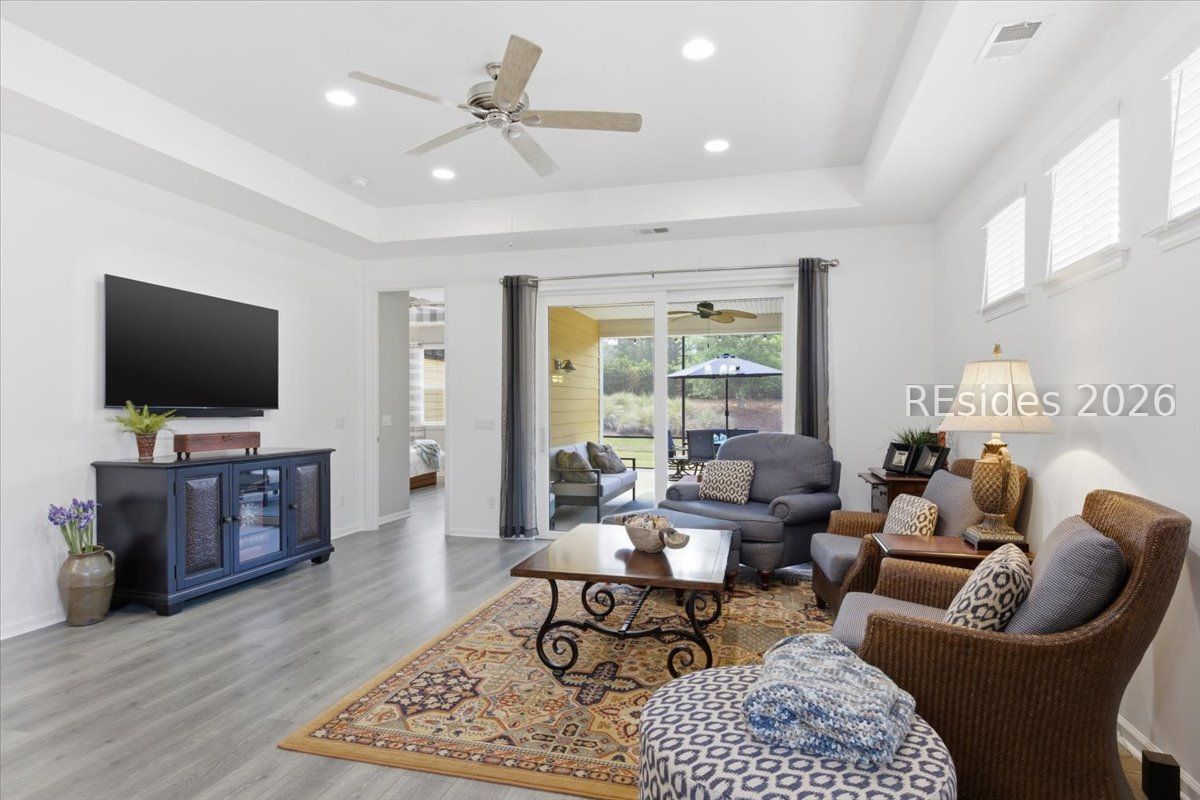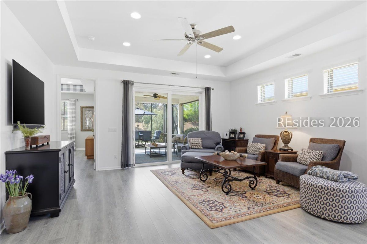 Start enjoying paradise now at 680 Summertime Place in the highly sought-after Latitude Margaritaville Hilton Head-where every day feels like a vacation inspired by the Jimmy Buffett lifestyle. Why wait for new construction when this beautifully appointed Nevis model is ready for immediate enjoyment? Ideally located in Phase One near the front entrance, this stunning home features 8-foot doors, laminate flooring, 36-inch cabinets with crown molding, and elegant granite countertops. The gourmet eat-in kitchen is equipped with stainless steel appliances, a gas range, and custom lighting, perfect for both everyday living and entertaining.Thoughtfully designed with comfort and style in mind, the home offers two spacious bedrooms, two full baths, and a versatile office complete with built-ins and a Murphy bed. Additional highlights include recessed lighting, ceiling fans, window treatments, a welcoming family room, formal dining area, and an open-concept great room. Step outside to relax in the screened-in birdcage overlooking a private backyard-your own serene retreat. As a resident, you'll enjoy world-class amenities including a resort-style pool, fitness center, live entertainment, dining, pickleball and tennis courts, and a vibrant social calendar, all within this premier 55+ gated community.