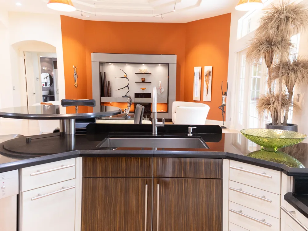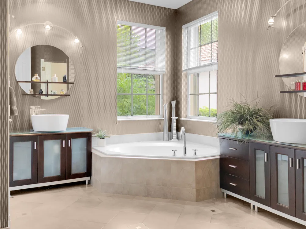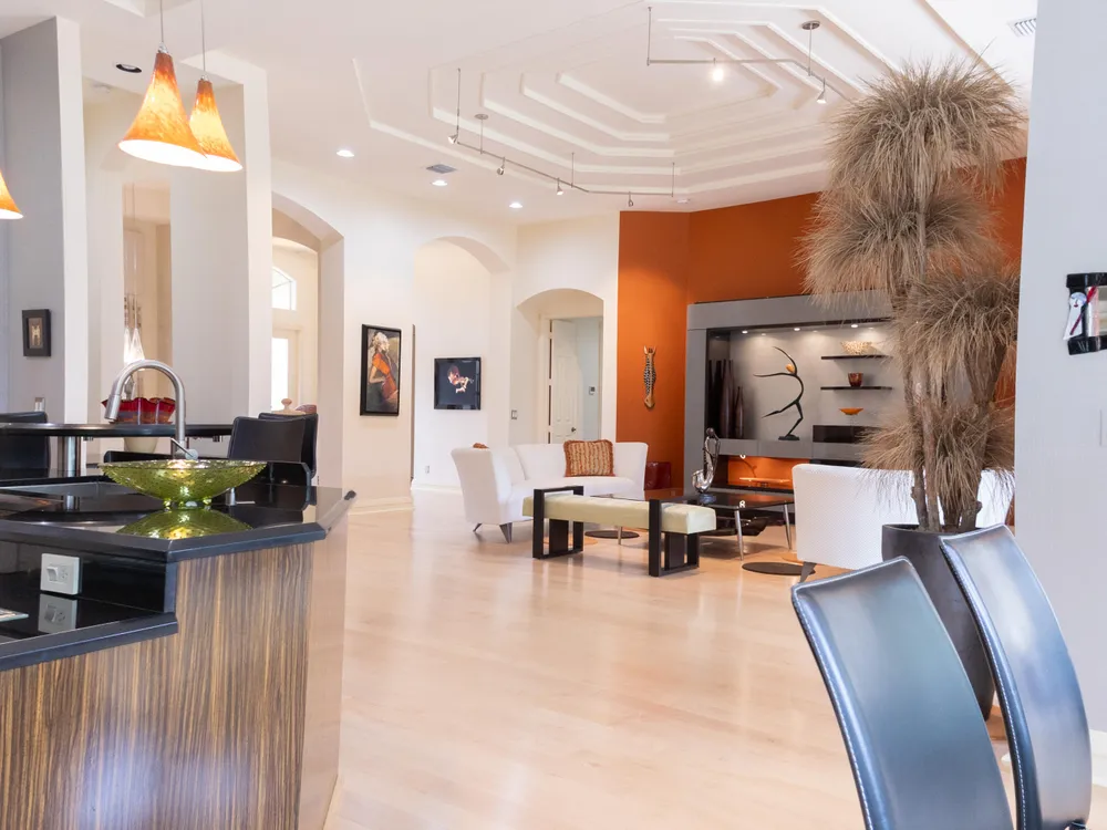 - Built-in Shelving, Cathedral Ceiling(s), Entry Level Living Area, Entrance Foyer, Kitchen Island, Pantry, Garden Tub/Roman Tub, High Ceilings, Great Room, Breakfast Area, Separate/Formal Dining Room, Snack Bar, Dual Sinks, Primary Downstairs, Sitting Area In Primary Bedroom, Separate Shower, Bathtub, Storm Shutters