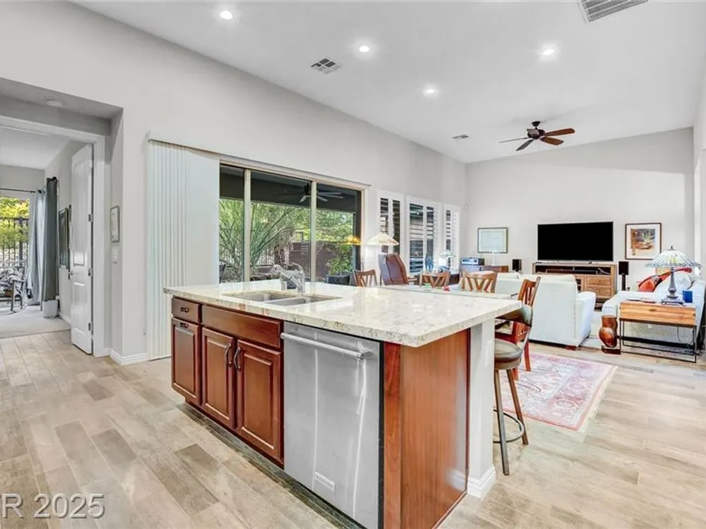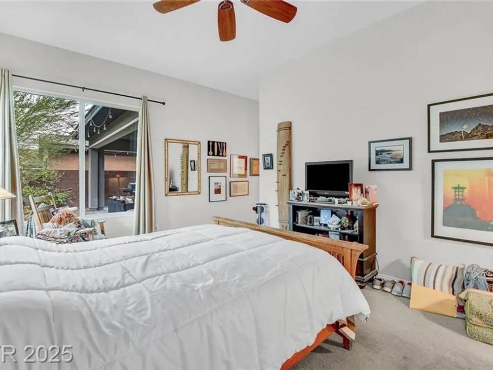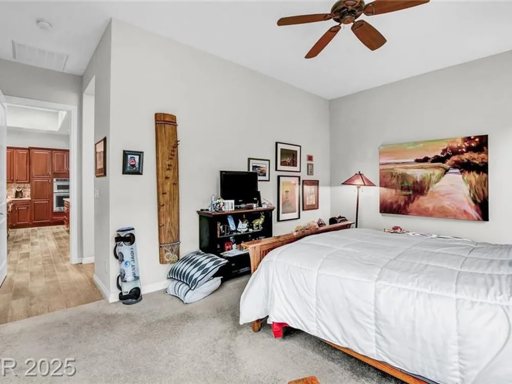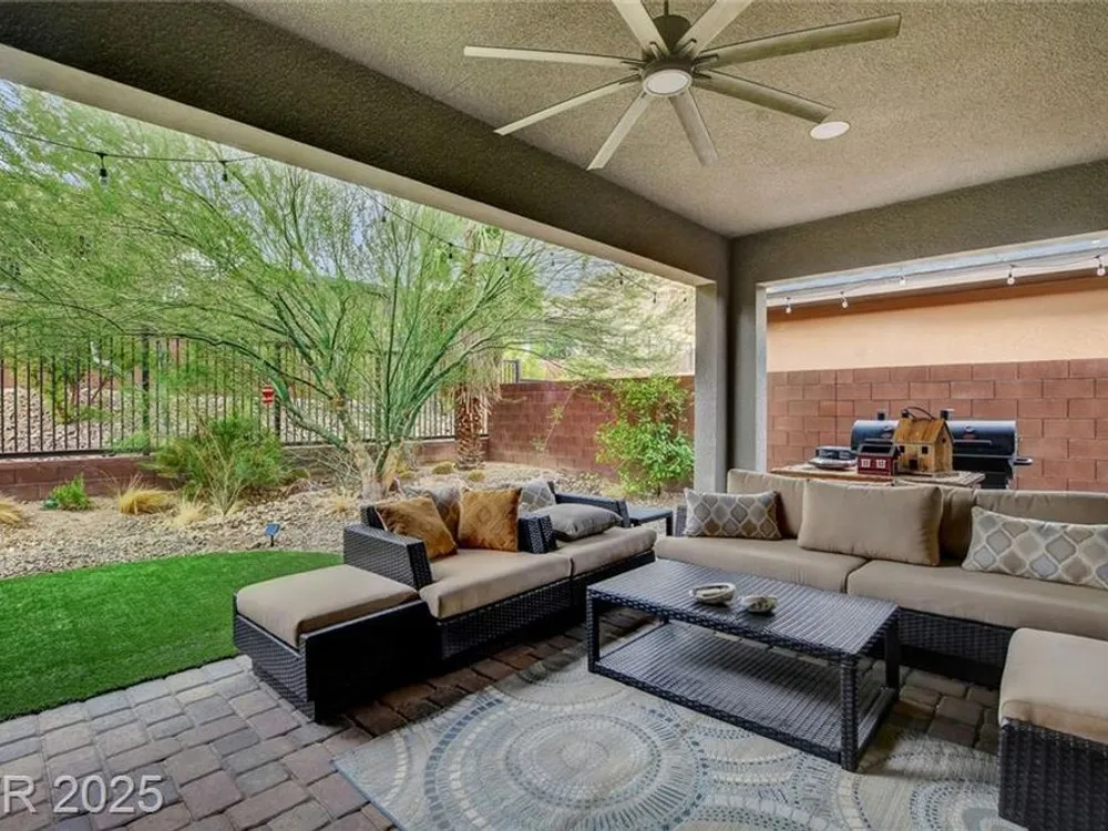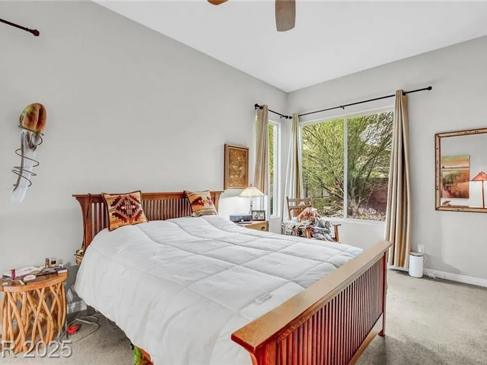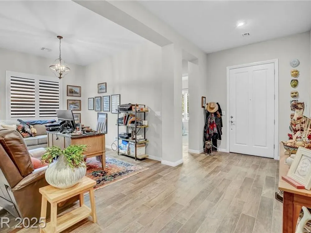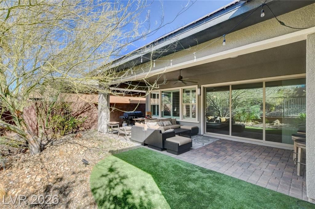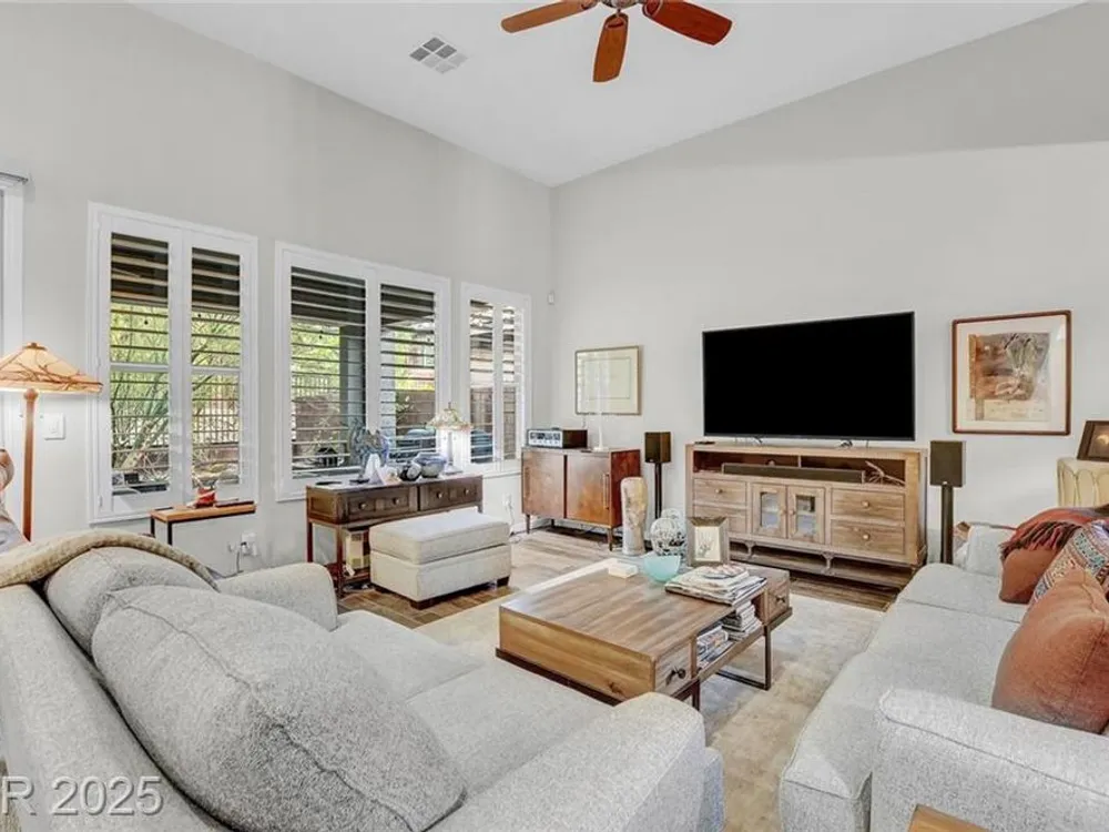 Beautiful single story Toll Brothers home in the guard gated Regency community in Summerlin. Located on one of the Best Streets in the neighborhood with mountain views, this floorplan Features 2 bedrooms + office, 2 bathrooms and luxury upgrades throughout. Gourmet kitchen boasts granite counters, high end stainless appliances and designer tile flooring. High ceilings, Bright living room with multi-slide patio doors, shutters throughout and ceilings fans are just a few of the included upgrades. Primary suite includes large walk in closet, dual sinks, and large walk-in shower. Large Laundry room with custom cabinets. Backyard retreat with modern landscape & turf, large covered patio and pavers. Tankless water heater. Finished 2 car garage with epoxy floors and storage. Steps from clubhouse, pool, fitness, pickleball & tennis—resort-style living at its finest!