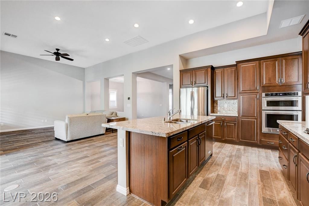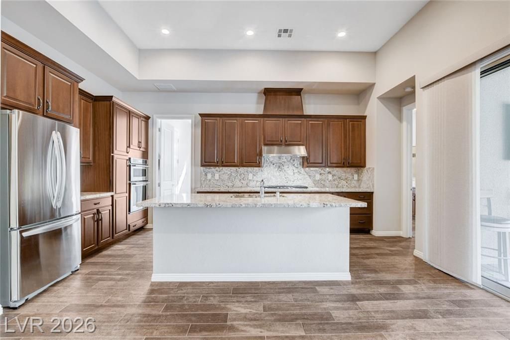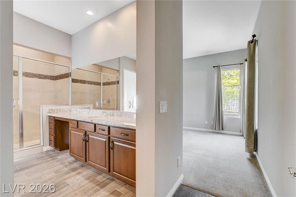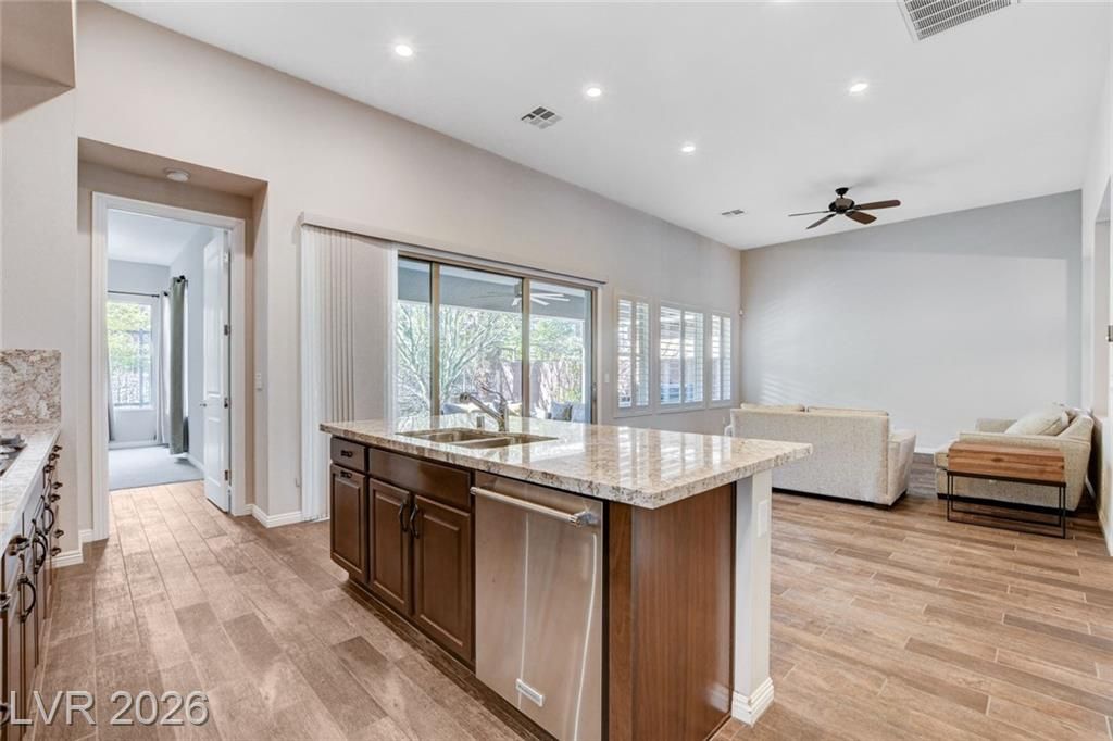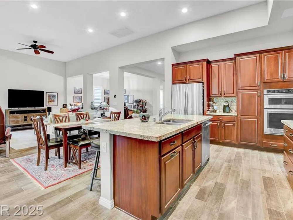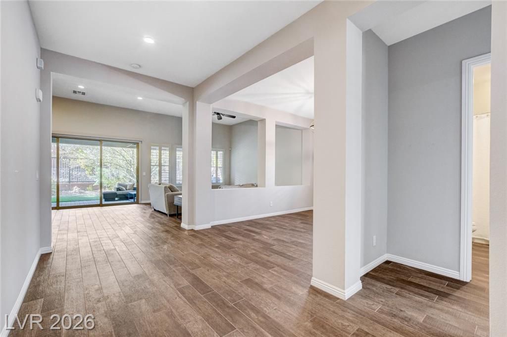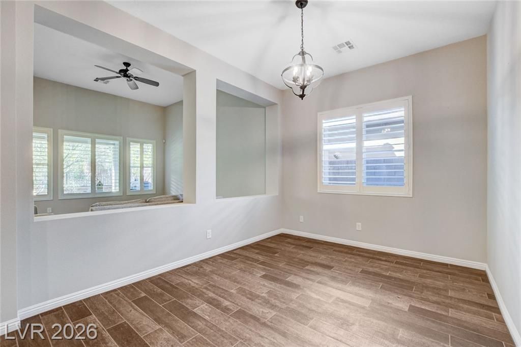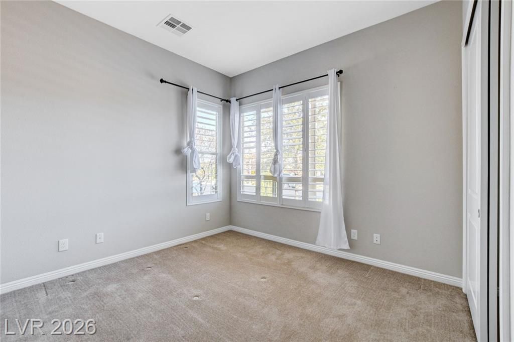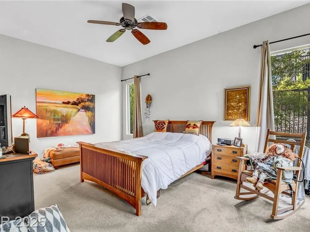 Beautiful single story Toll Brothers home in the guard gated Regency community in Summerlin. Located on one of the Best Streets in the neighborhood with mountain views, this floorplan Features 2 bedrooms + office, 2 bathrooms and luxury upgrades throughout. Gourmet kitchen boasts granite counters, high end stainless appliances and designer tile flooring. High ceilings, Bright living room with multi-slide patio doors, shutters throughout and ceilings fans are just a few of the included upgrades. Primary suite includes large walk in closet, dual sinks, and large walk-in shower. Large Laundry room with custom cabinets. Backyard retreat with modern landscape & turf, large covered patio and pavers. Tankless water heater. Finished 2 car garage with epoxy floors and storage. Steps from clubhouse, pool, fitness, pickleball & tennis—resort-style living at its finest!
