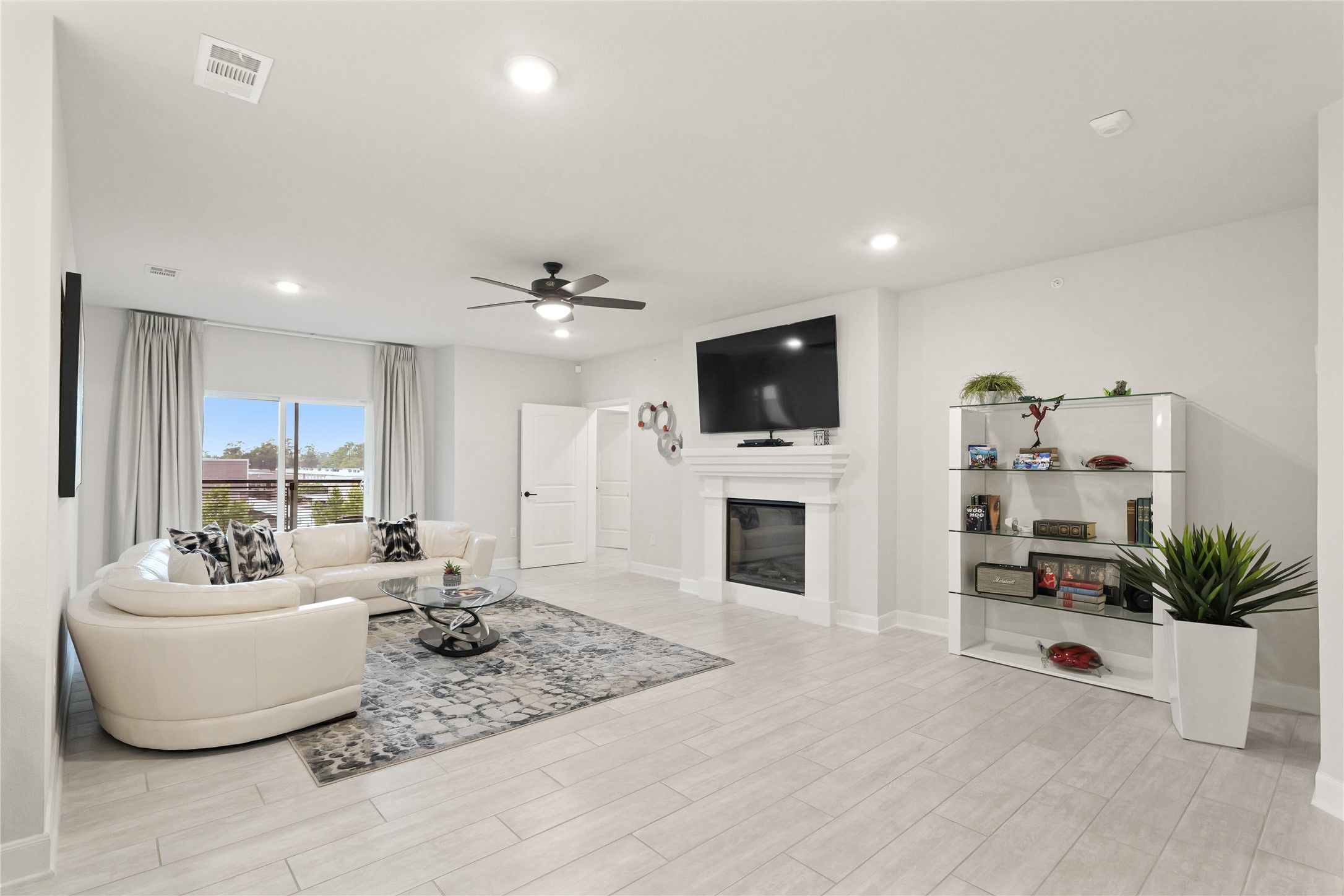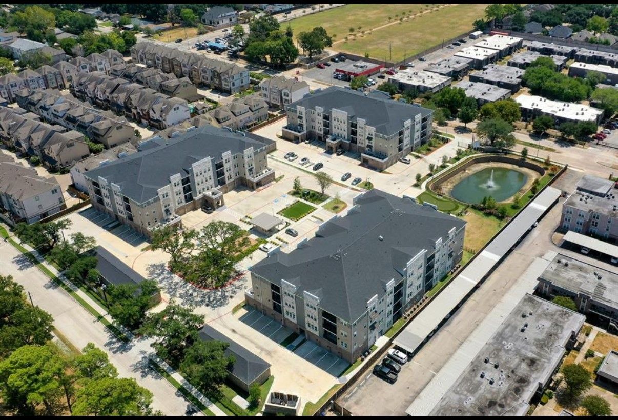 TRENDY MIDRISE COMMUNITY for ages 55 & older. This Beazer Condominium boasts an elegant floor plan, wood-like tile flooring, cast stone fireplace, & a private balcony overlooking the fountain/lake. Located on the third floor, a meticulously kept 3 bedroom, 2 bathroom with front door code access. Including an additionally purchased extended garage & storage unit. The condo boasts natural light throughout the elegant, spacious kitchen equipped with quartz countertops, stainless steel appliances, pendant lighting, & undercabinet lighting. The beautiful primary bedroom retreat features En-suite bath & shower, dual vanities, & walk-in closet. This gated community is just minutes from Houston's best dining, parks, entertainment, & shopping-including The Galleria & City Centre. Residents also get to enjoy the community amenities including game room, grilling pavilion area, fitness center, scenic lake, dog park, putting green & more. Washer/Dryer/Refrigerator/Custom Window Coverings INCLUDED.