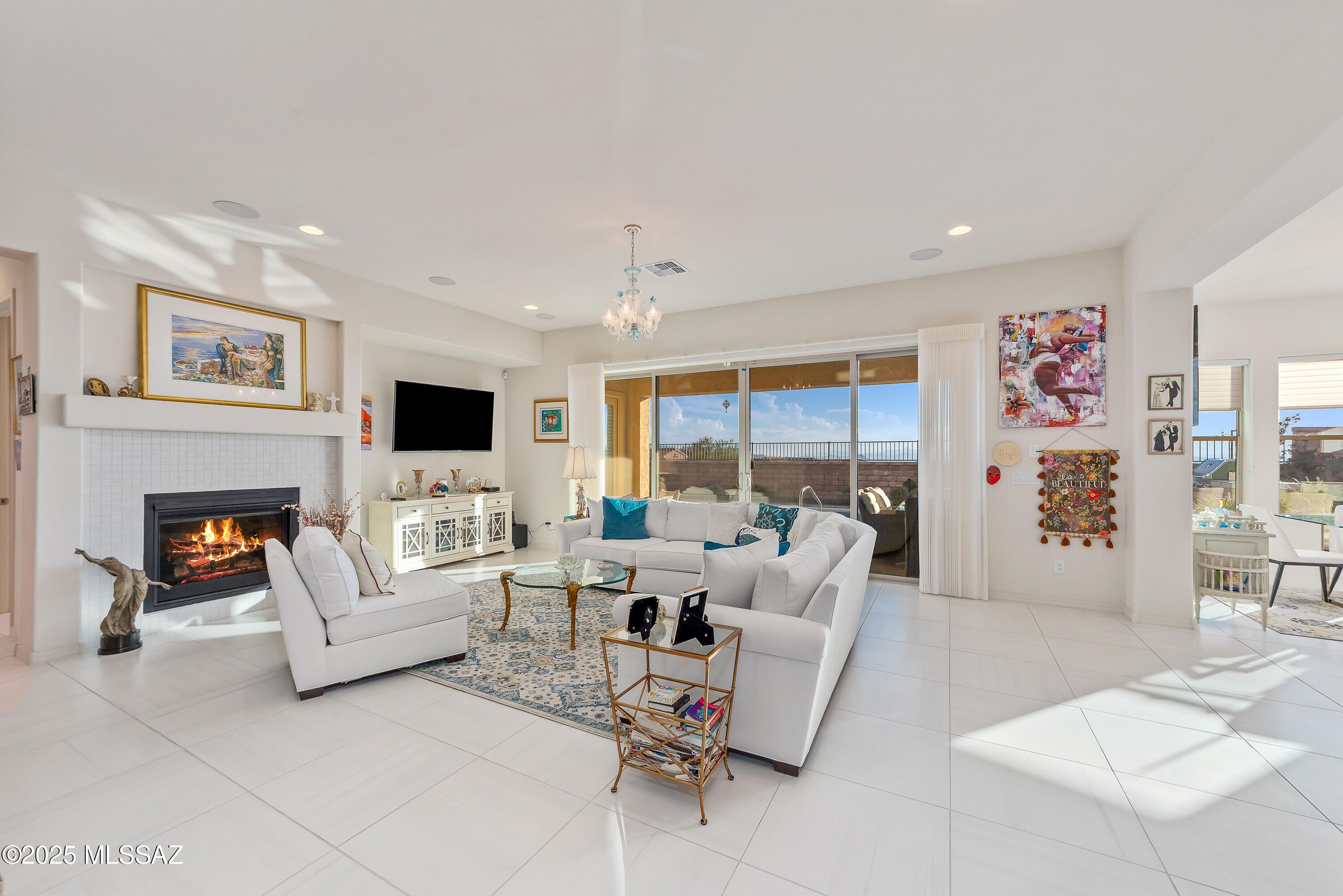 365 Gorgeous Sunsets Every Year! Absolutely beautiful Journey model, perched high on an amazing, private view lot with nobody behind it. Old-world charm meets modern convenience. Better-than-new, sparkling clean with highest-possible upgraded white Quartz countertops, porcelain tile and bedroom carpet-all in pristine condition. Split floor plan with 2 en-suites, den, TV room, high-end windows treatments, tankless hot water, whole home air purification, water softener & extra-long, heated, saltwater pool w/ panoramic view! Gorgeous fireplace inside and built-in grill, plus amazing fire-feature outside. 3rd garage bay for the golf cart. Walking distance to Del Webb Community Center amenities. You waited for the right home to come along ... and this is it!