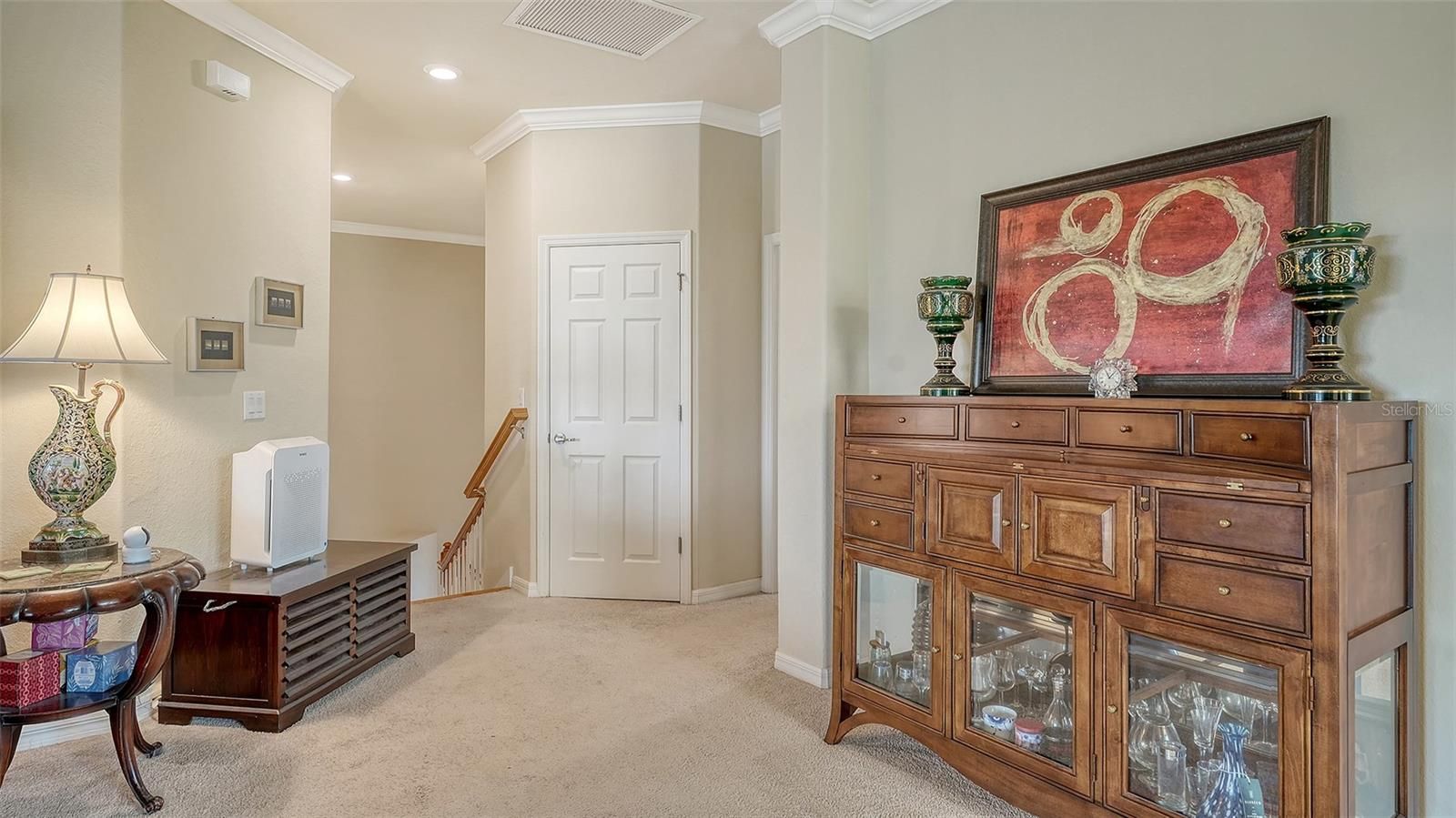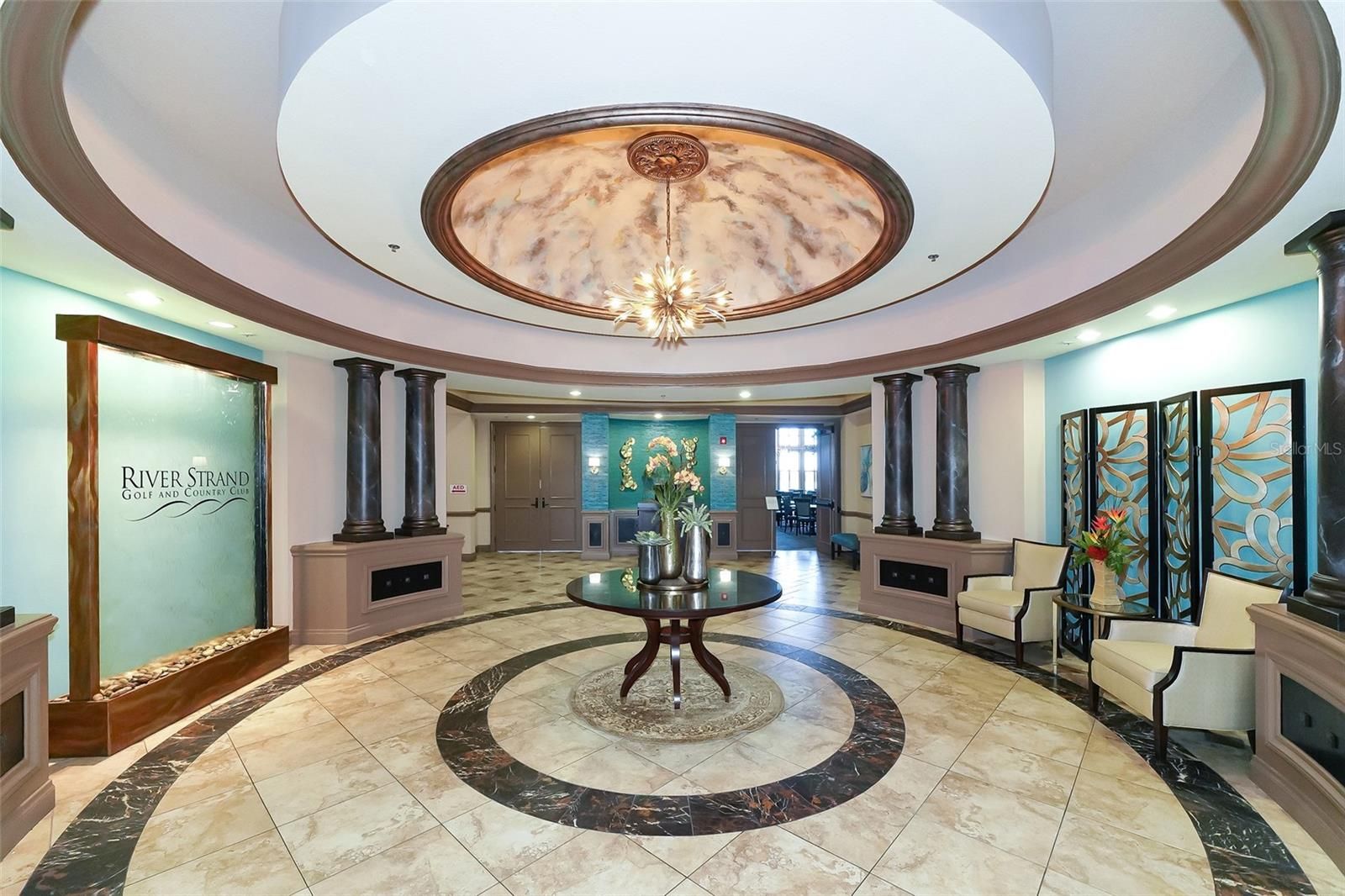 Welcome to this upstairs waterfront coach home, which is now ready for new owners. Located within the 24/7 manned gate guarded River Strand Golf and Country Club. This resort-style community offers easy living with beautiful scenery and access to world class amenities. This 2108 sq foot, 3-bedroom, 2 bathroom, second-floor Coach Home condo has a stunning view of the lake filled with wildlife and also the pristine golf course. The features such as: crown molding, solid wood cabinetry, granite countertops, and stainless-steel kitchen appliances, carpet and tile throughout the entire home, and a screened lanai for outdoor living. The open-concept kitchen, living, and dining areas, along with the 10 X 22 covered and screened-in lanai, and bay window off the breakfast nook, provide incredible views of the golf course and panoramic water views. The spacious owner's suite features a sliding door to lanai, dual sinks, separate tile shower, huge soaking tub, and dual walk-in closets, all of which creates a peaceful retreat. Located in a separate wing, both the second and third bedroom can also be used as an office, or flex space and shares a lovely full bathroom. The laundry is located in a separate room and is just the perfect size. This Oleander model includes a garage that actually has a tandem space to fit up to 3 cars or if you are handy, a workshop, or a golf cart. Before you enter the garage there is a huge storage space (under AC) which has been extended and is just perfect for holiday items, etc. This home offers the perfect blend of comfort, style, and leisure, making it an ideal place to call home or a possible snowbird opportunity. NOT a golfer? Great news! This coach home includes the Golf and Country Club SOCIAL membership with a 39,000-square-foot clubhouse that offers dining facilities in a semi-formal dining area, a grille room, and a Tiki bar. The clubhouse also has a fitness center, aerobics room, locker rooms, resort-style pool, resistance pool, heated spa, and six satellite pools strategically located throughout the community. The Sanctuary Clubhouse has a large pool as well and an area set aside for bingo, speakers, and private parties, along with a state-of-the-art 24/7 fitness center. There are multiple Pro Shops for golf and tennis, 9 Har-Tru clay tennis courts, 8 pickleball courts, and half-court basketball courts. This is an original owner. Call today for a showing.