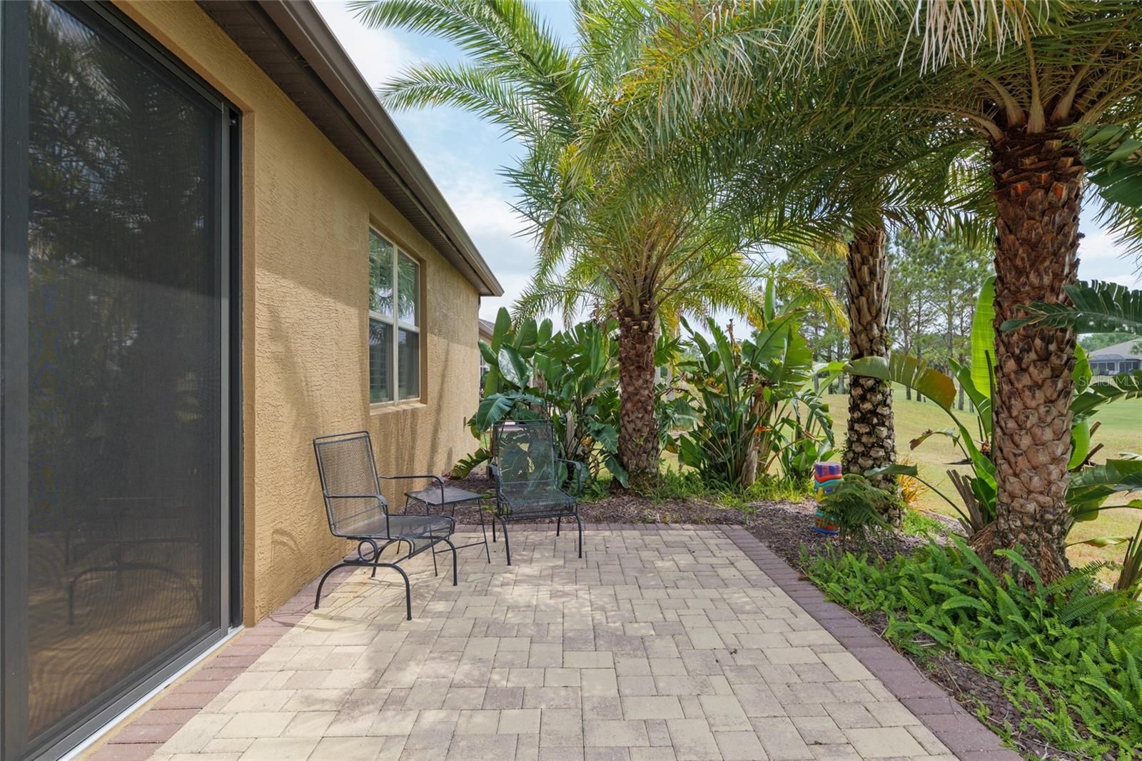 Introducing a lifestyle of elegance and leisure. This stunning home sits prominently on the edge of a picturesque golf course, offering breathtaking views and unforgettable sunsets daily. This residence boasts an upgraded elevation 10 of the Martin Ray Model with insulated block, blending luxurious design with serene surroundings and providing the perfect retreat. Arrive home to the elegance of a paver driveway, leading you to an impressive covered front porch with an 8' tall, 6-panel front door. The extended 3-car tandem garage, expanded by 4 feet, provides ample space for vehicles and storage, complementing the home's functional layout. Step inside to discover a meticulously crafted interior where every detail speaks luxury. The flex room, adorned with double doors and a tray ceiling with crown molding, is ideal for work or relaxation. The heart of the home, the kitchen, is a gourmet's paradise equipped with SS built-in double wall ovens, a large single SS undermount sink, and staggered cabinets highlighted by a glass mosaic wall tile backsplash. The Moen chrome Brantford pull-out faucet adds a touch of modernity and practicality. Retreat to the primary suite and indulge in ultimate comfort. It features luxury vinyl flooring, a tray ceiling with crown detailing, a Kohler oval garden tub, and a shower surrounded by tile with listello accents. A custom walk-in closet organization system ensures impeccable order. The secondary bedroom showcases luxury vinyl plank flooring, while the guest bath impresses with its tiled tub/shower and 20" diagonal tile flooring. With its four recessed LED can lights and Florida-style rounded wall corners, the great room sets the stage for memorable gatherings or quiet evenings. Custom interior paint, elegant crown molding in multiple rooms, and 8' tall Cheyenne 2-panel interior doors exude sophistication throughout the home. Step outside to admire a thoughtfully landscaped yard with concrete stained and stamped curbs, premium rocks, and palm trees creating a tranquil oasis. The enclosed lanai is perfect for year-round enjoyment and is protected by UV window film on the glass sliders. Modern amenities such as enhanced attic insulation, a metallic chip epoxy garage floor, and various modern lighting fixtures elevate the home's comfort and efficiency. Additional features include custom built-in bookcase cabinets, garage door insulation, high-speed fiber-optic quantum (the equipment stays with the house), and more. Don't miss the opportunity to own a premium home in this sought-after location. Schedule your viewing today and step into a lifestyle of unparalleled elegance and comfort.