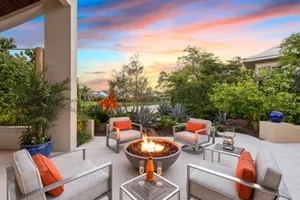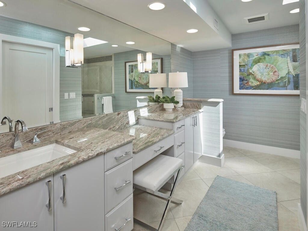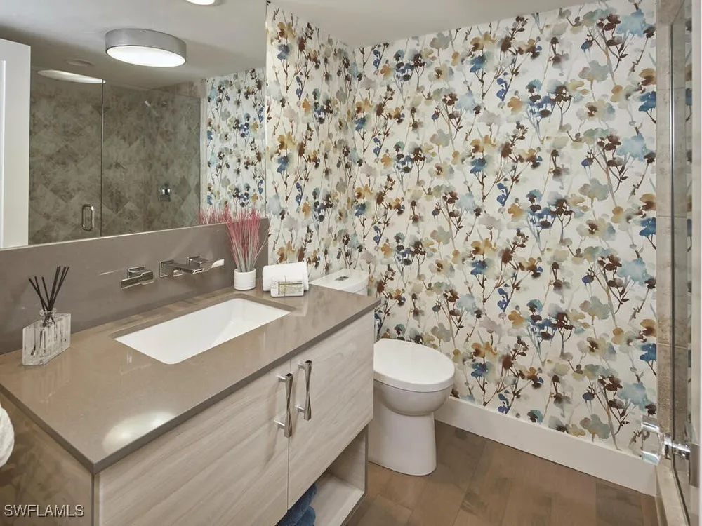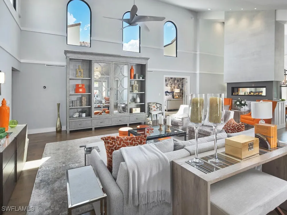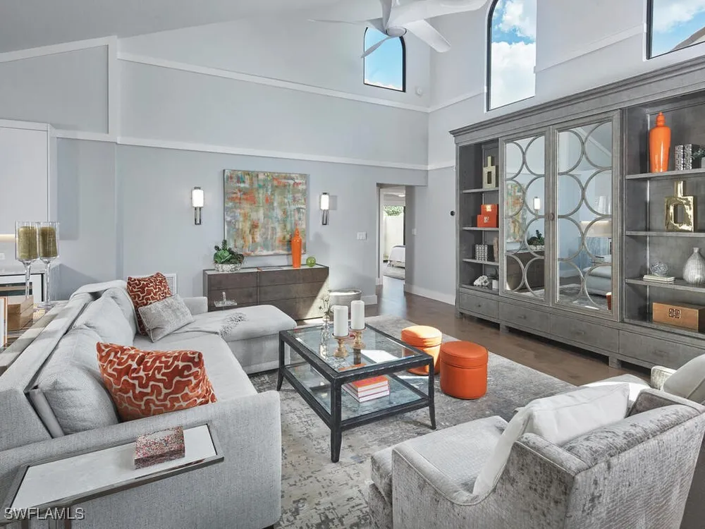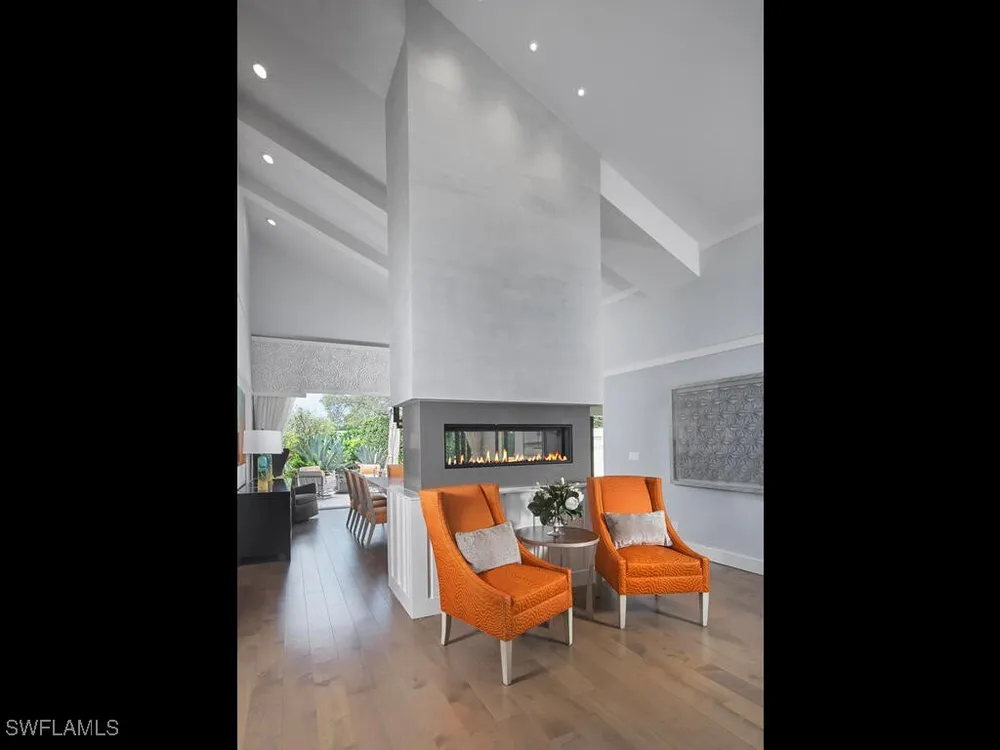 Introducing a stunningly remodeled 2-bedroom, 2-bath villa in the exclusive, low-density enclave of Sand Pointe at Pelican Bay. Nestled on a rare oversized corner lot with lush tropical landscaping, this lakefront residence offers exceptional privacy, tranquil water views, and the peace of mind of being outside of a flood zone with no hurricane damage. From the moment you enter the private courtyard, you're welcomed by an expansive marble sundeck, resort-style pool, hot tub, and gas fire pit—ideal for both relaxation and entertaining. Multiple outdoor living spaces, including a covered lanai with millwork ceilings and retractable screens, truly embody the Florida lifestyle. Inside, the open-concept layout is flooded with natural light from soaring vaulted ceilings and expansive sliding glass doors. Rich wood flooring flows through the main living areas, while the chef’s kitchen showcases LaurierMax custom cabinetry, quartz countertops, a professional-grade appliance suite, and an inviting eat-in nook. The great room is complete with a built-in desk topped in quartzite and a beverage cooler. The spacious primary suite features private lanai access, a custom walk-in closet, and a spa-inspired bathroom with an oversized glass shower and elongated vanity. A separate guest suite enjoys its own terrace and full bath, offering comfort and privacy for visitors. Additional highlights include a newer tile and flat roof, impact-rated doors and windows, an air-conditioned two-car garage, advanced security system, and lush, mature landscaping. This home offers easy access to Pelican Bay’s world-class amenities: nearly three miles of private beach, beachfront restaurants, a state-of-the-art fitness center, 18 Har-Tru tennis courts, and upcoming pickleball courts. You're also just minutes from Waterside Shops, Artis–Naples, and a variety of upscale dining and shopping options. Offered fully furnished, this exceptional property seamlessly blends elegance, comfort, and an unbeatable location—delivering the ultimate Naples lifestyle.
