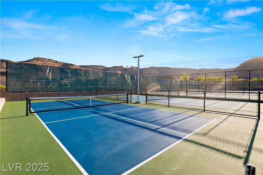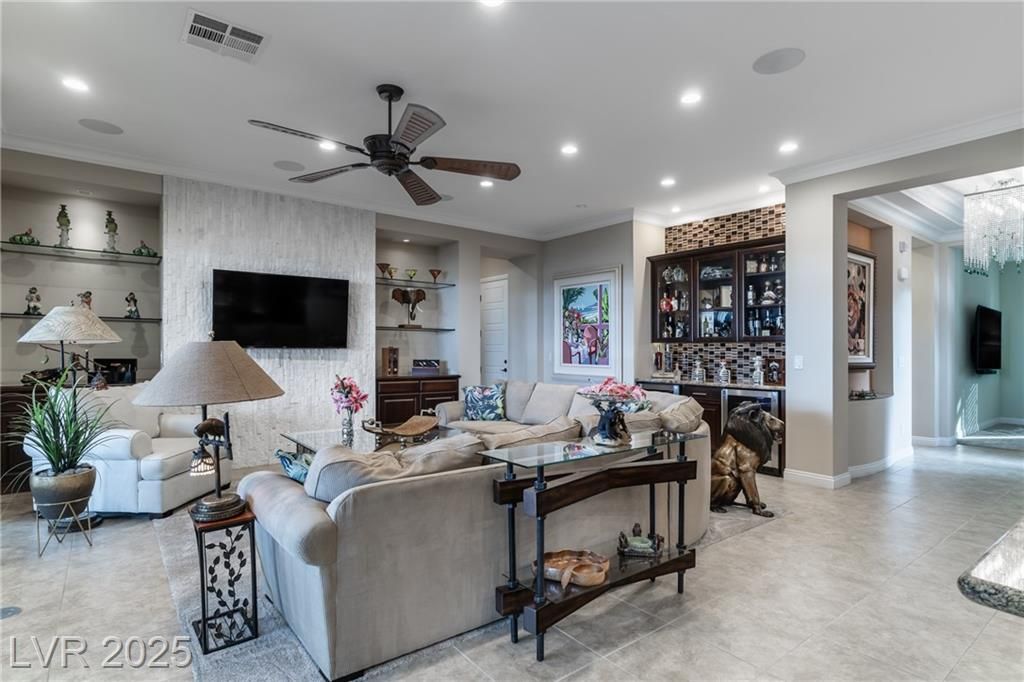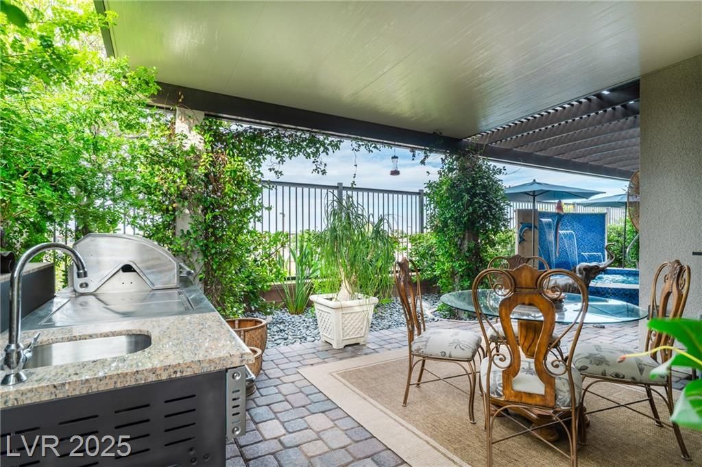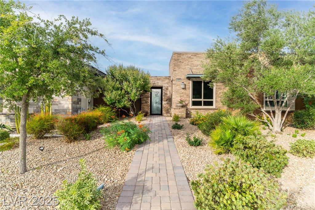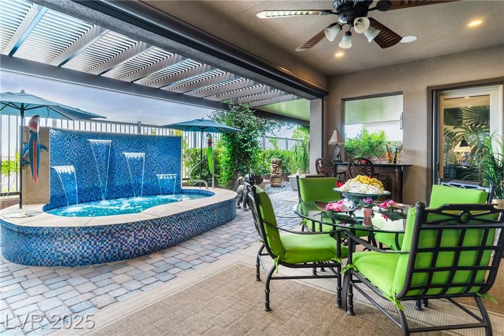 Stunning single story Toll Brothers home in the guard gated Regency community in Summerlin with breathtaking city lights & mountain views. 2 bedrooms +office, 2.5 bathrooms, & luxury upgrades throughout. Gourmet kitchen with high end stainless appliances, granite counters, walk in pantry, ice maker, & upgraded Cherry Heritage Mocha cabinets. Spacious great room with surround sound, wet bar & 2 wine fridges. Primary suite with custom tile shower, double sinks & walk-in closet. Designer Legacy rectified tile, maple carpet in bedrooms, shutters, crown molding, soft-close doors/cabinets, & designer fixtures. Gorgeous front courtyard. Backyard paradise with custom spa & waterfalls, built-in BBQ and fridge, covered patio with solar shades, added pavers & walkway. 2-car garage with epoxy floor, built-in shelves & storage racks. Alarm system & cameras. Steps from the clubhouse, pool, fitness, pickleball & tennis. Resort-style living at its finest.