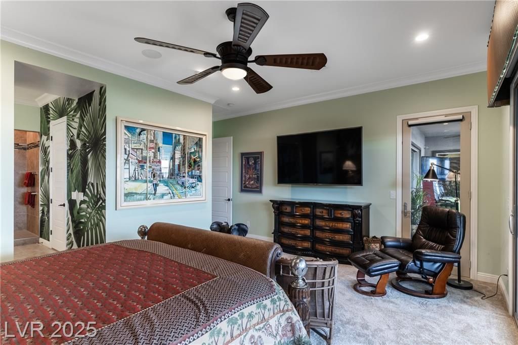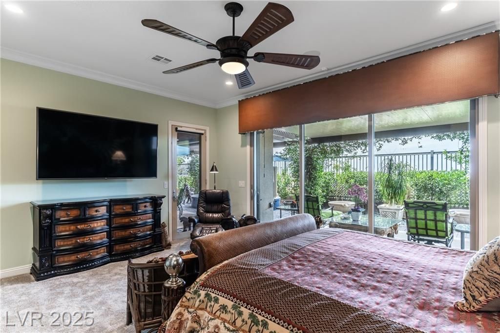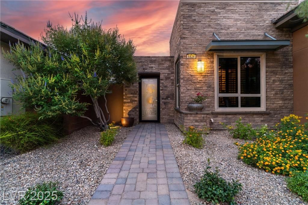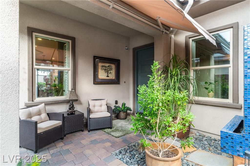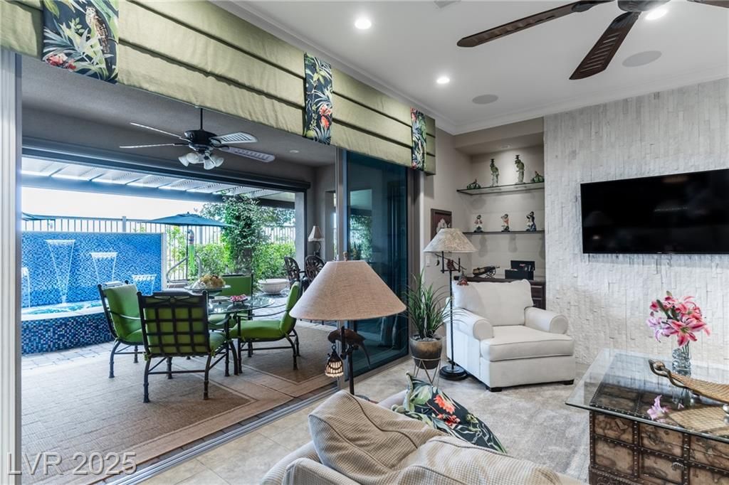 Stunning single story Toll Brothers home in the guard gated Regency community in Summerlin with breathtaking city lights & mountain views. 2 bedrooms +office, 2.5 bathrooms, & luxury upgrades throughout. Gourmet kitchen with high end stainless appliances, granite counters, walk in pantry, ice maker, & upgraded Cherry Heritage Mocha cabinets. Spacious great room with surround sound, wet bar & 2 wine fridges. Primary suite with custom tile shower, double sinks & walk-in closet. Designer Legacy rectified tile, maple carpet in bedrooms, shutters, crown molding, soft-close doors/cabinets, & designer fixtures. Gorgeous front courtyard. Backyard paradise with custom spa & waterfalls, built-in BBQ and fridge, covered patio with solar shades, added pavers & walkway. 2-car garage with epoxy floor, built-in shelves & storage racks. Alarm system & cameras. Steps from the clubhouse, pool, fitness, pickleball & tennis. Resort-style living at its finest.